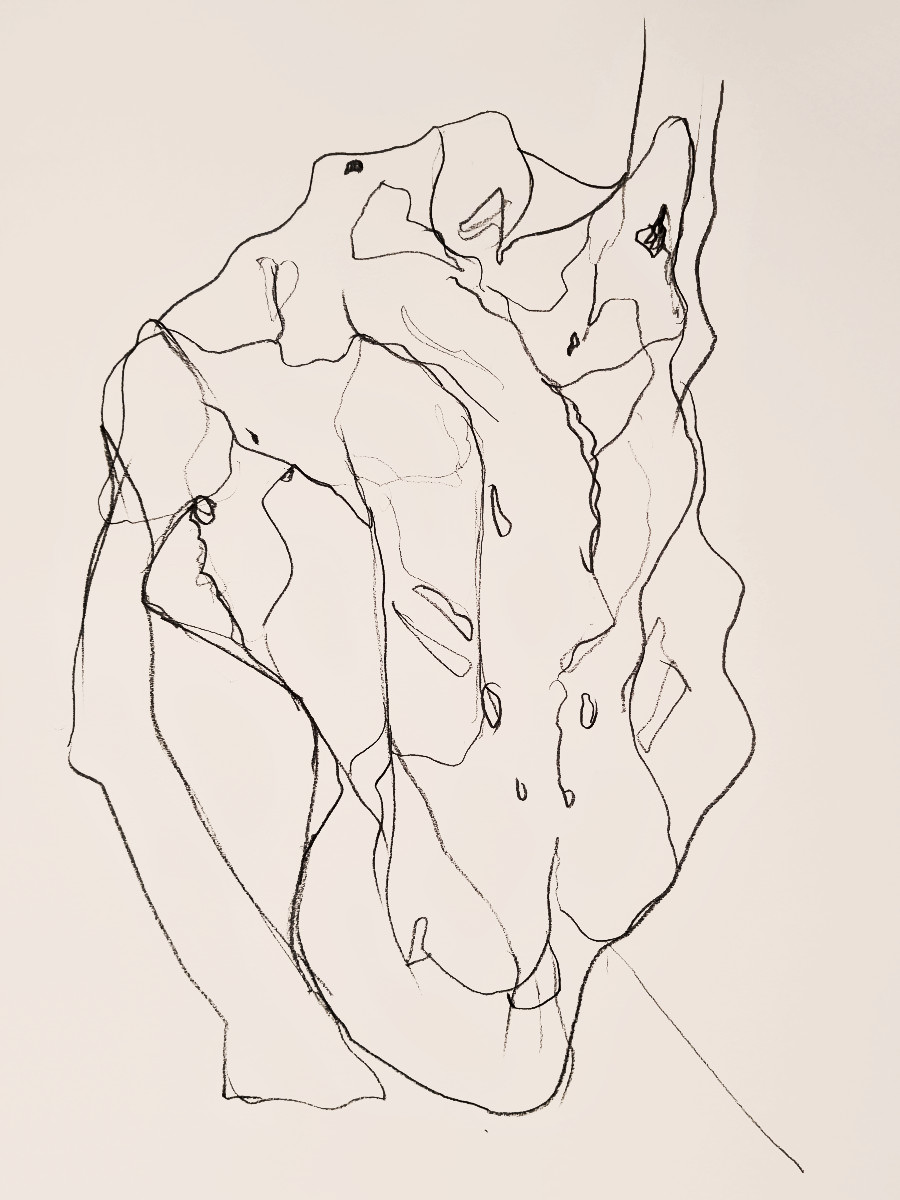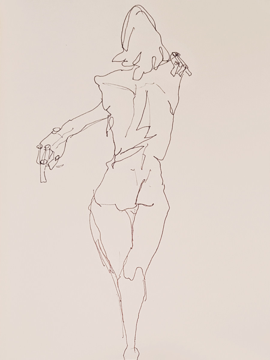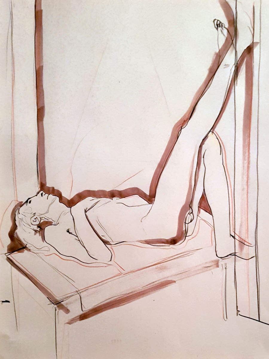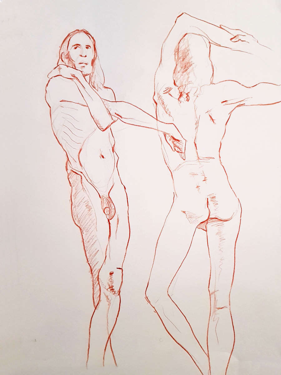 As this was most likely to occur if I was either sitting or reclining, I remained standing throughout the first half of the session. After an extended interval for socialising there was time a single pose of 20 minutes, which I felt might work with me laying down if I sprawled upon a table in the doorway and raised my feet up high on the door frame.
