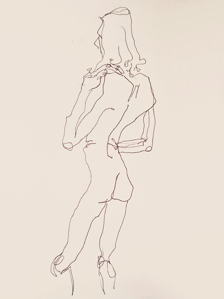 The majority of artists worked at easels. These had been arranged in semi-circles on both sides of the doorway, so in essence it was similar to posing in the round, except the thickness of the dividing wall meant those closest to it would experience a slightly restricted view if I wasn’t careful.