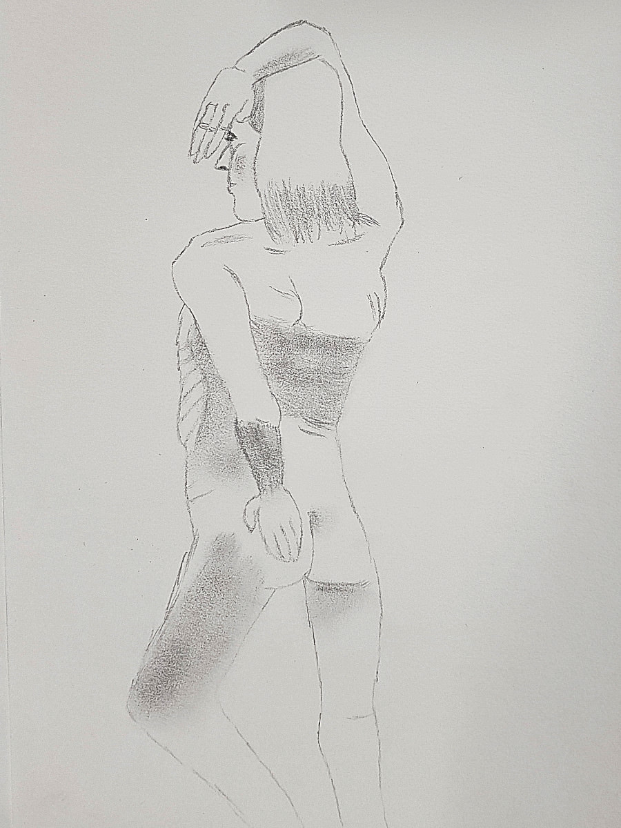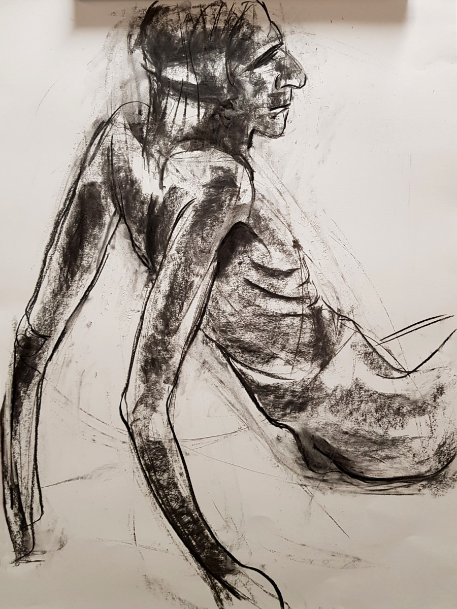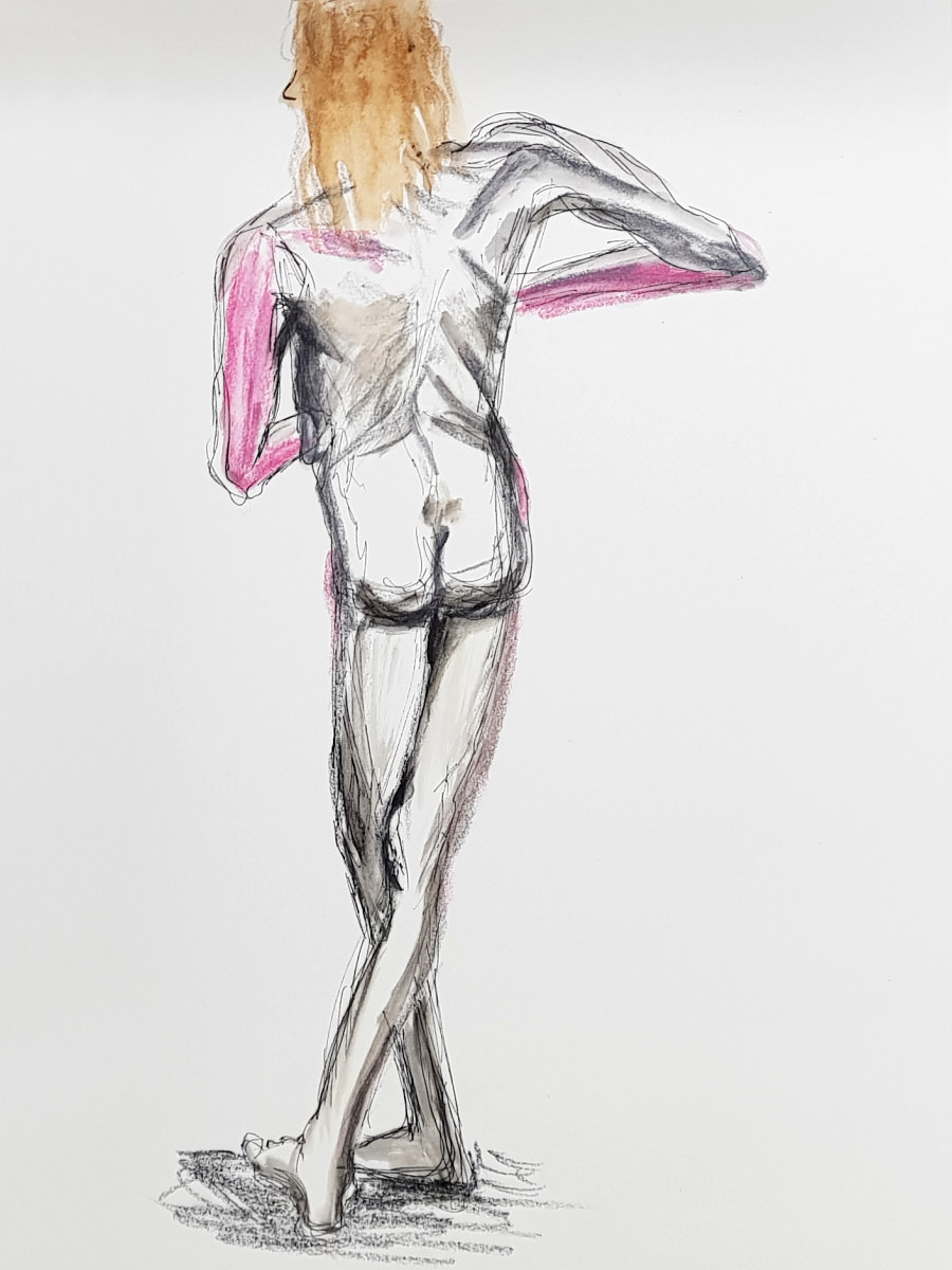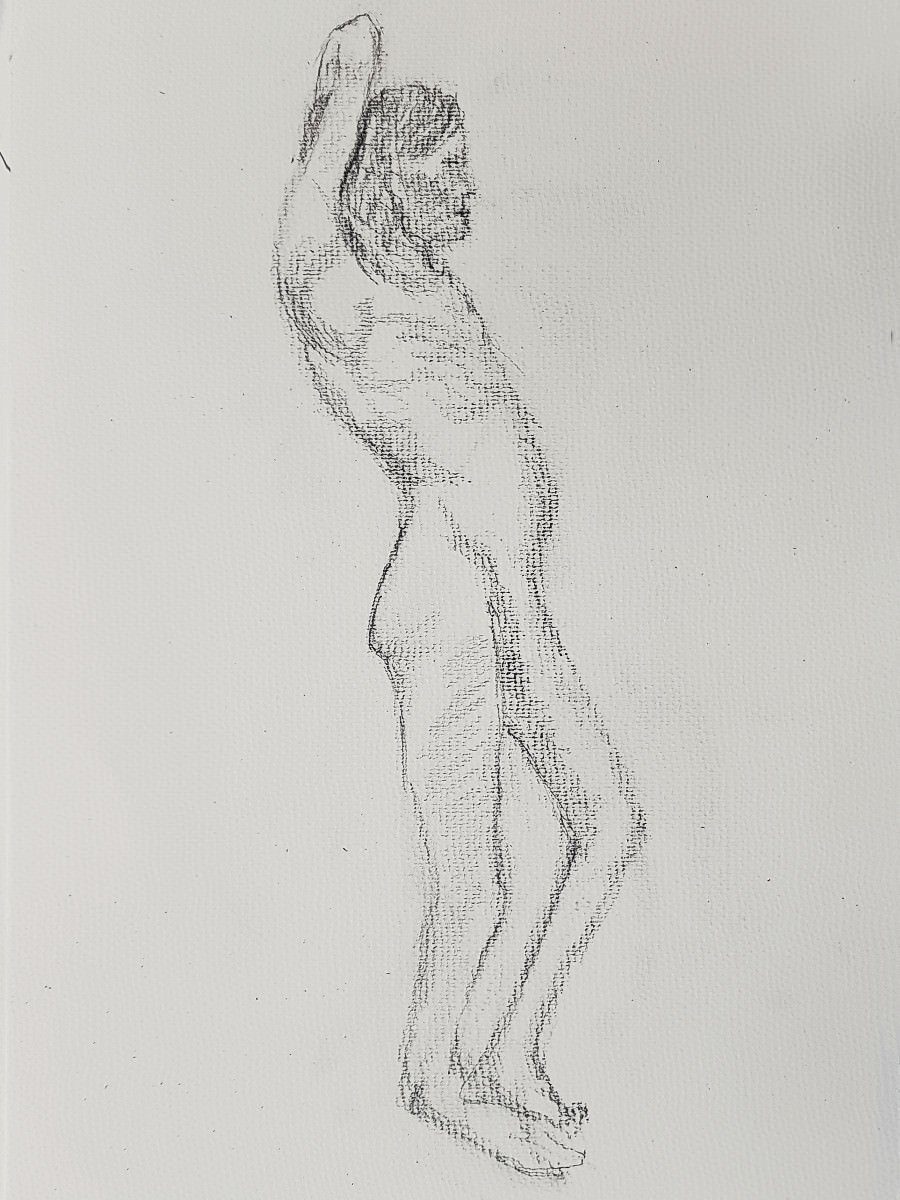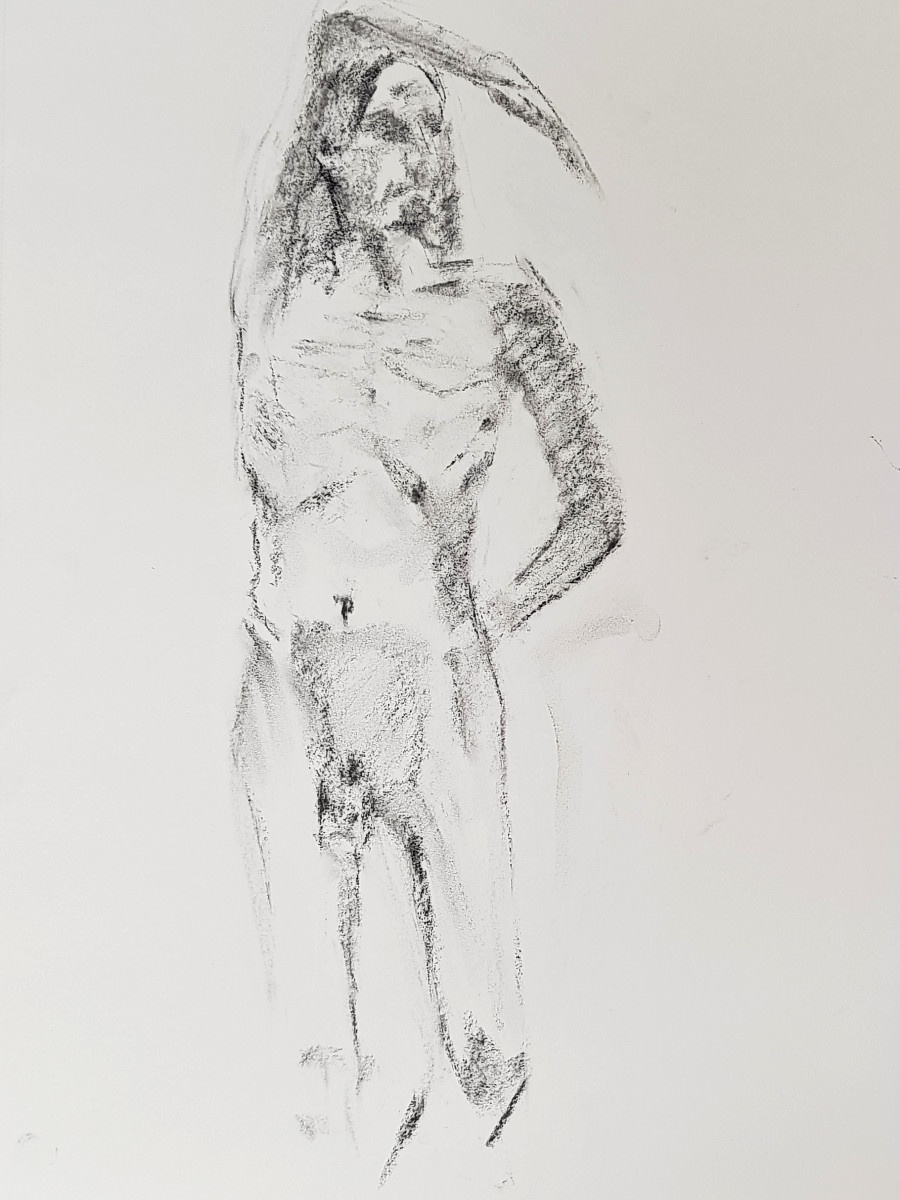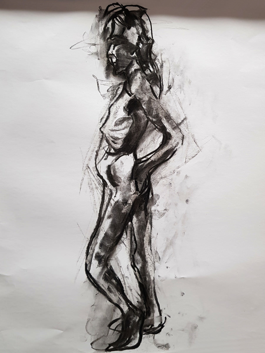 As I’ve said previously, poses with costume and props can be fun but the purist in me still favours working in an uncluttered open space as an unadorned nude figure using only body and inspiration to form creative challenges. It’s what I was able to do in this session, working in the round, mostly standing, or sometimes seated on the floor.