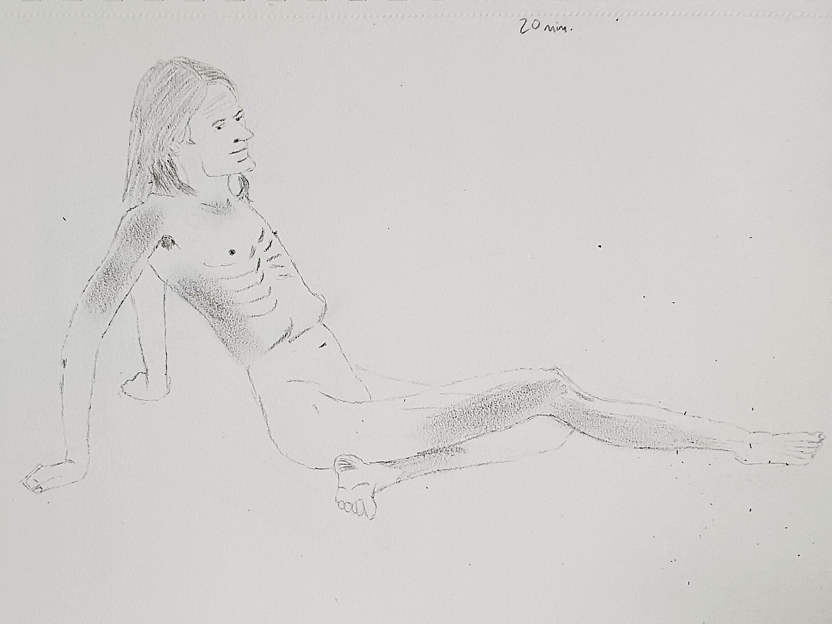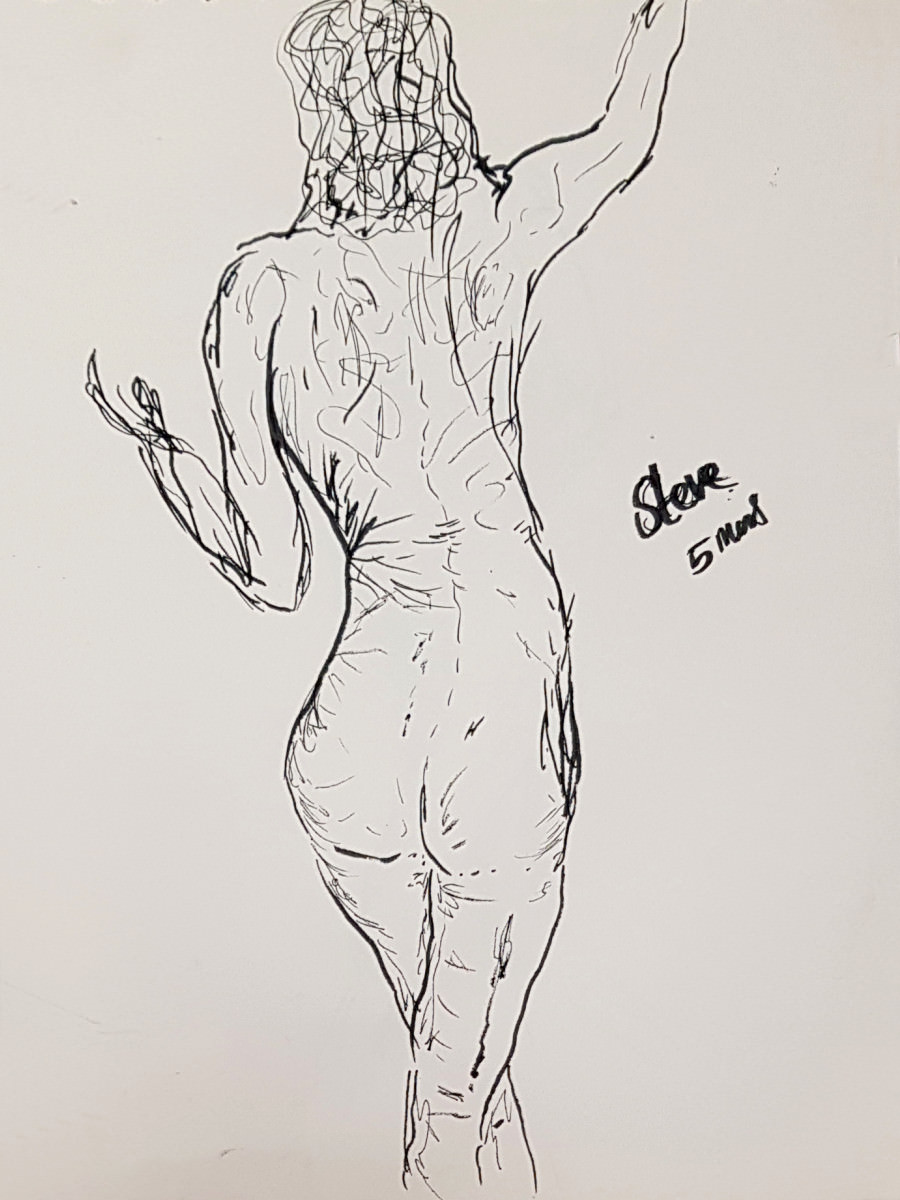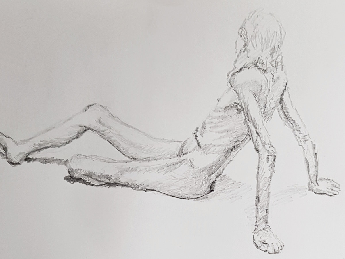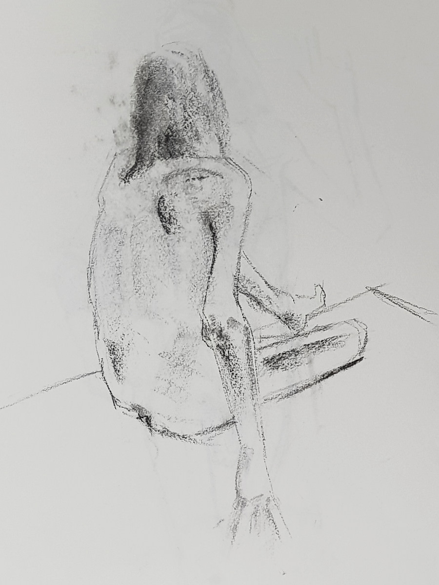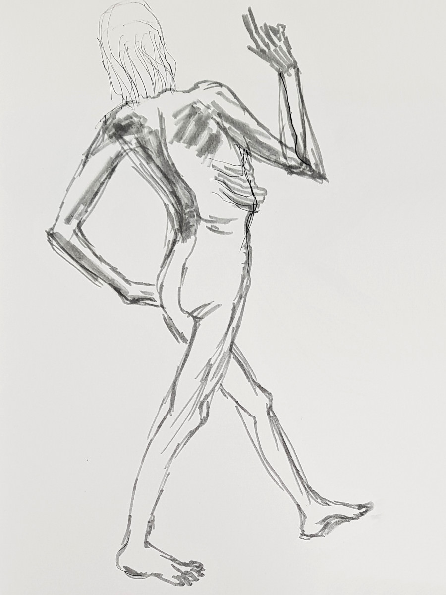 As I’ve said previously, poses with costume and props can be fun but the purist in me still favours working in an uncluttered open space as an unadorned nude figure using only body and inspiration to form creative challenges. It’s what I was able to do in this session, working in the round, mostly standing, or sometimes seated on the floor.