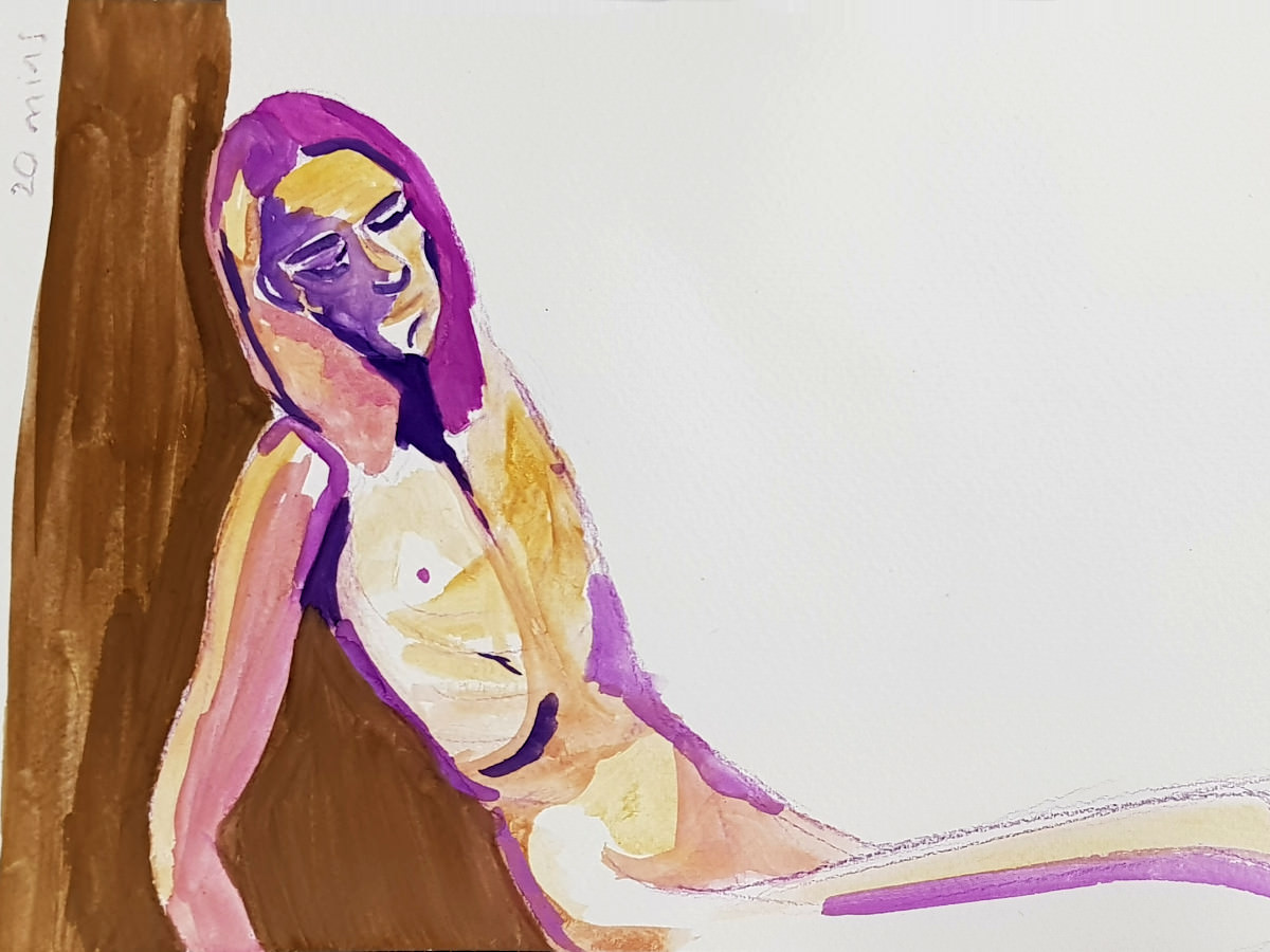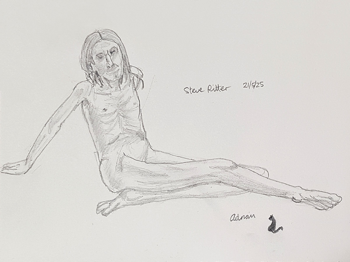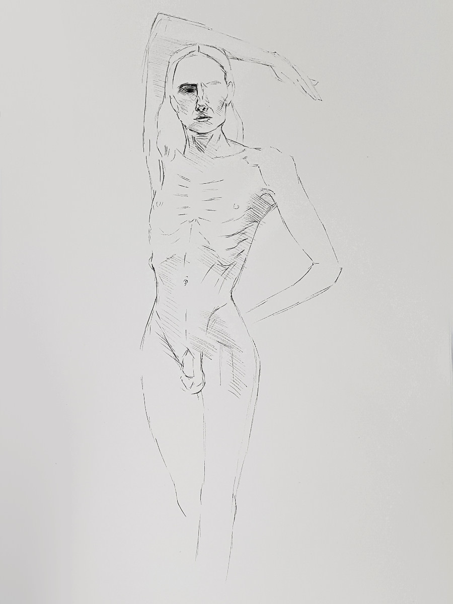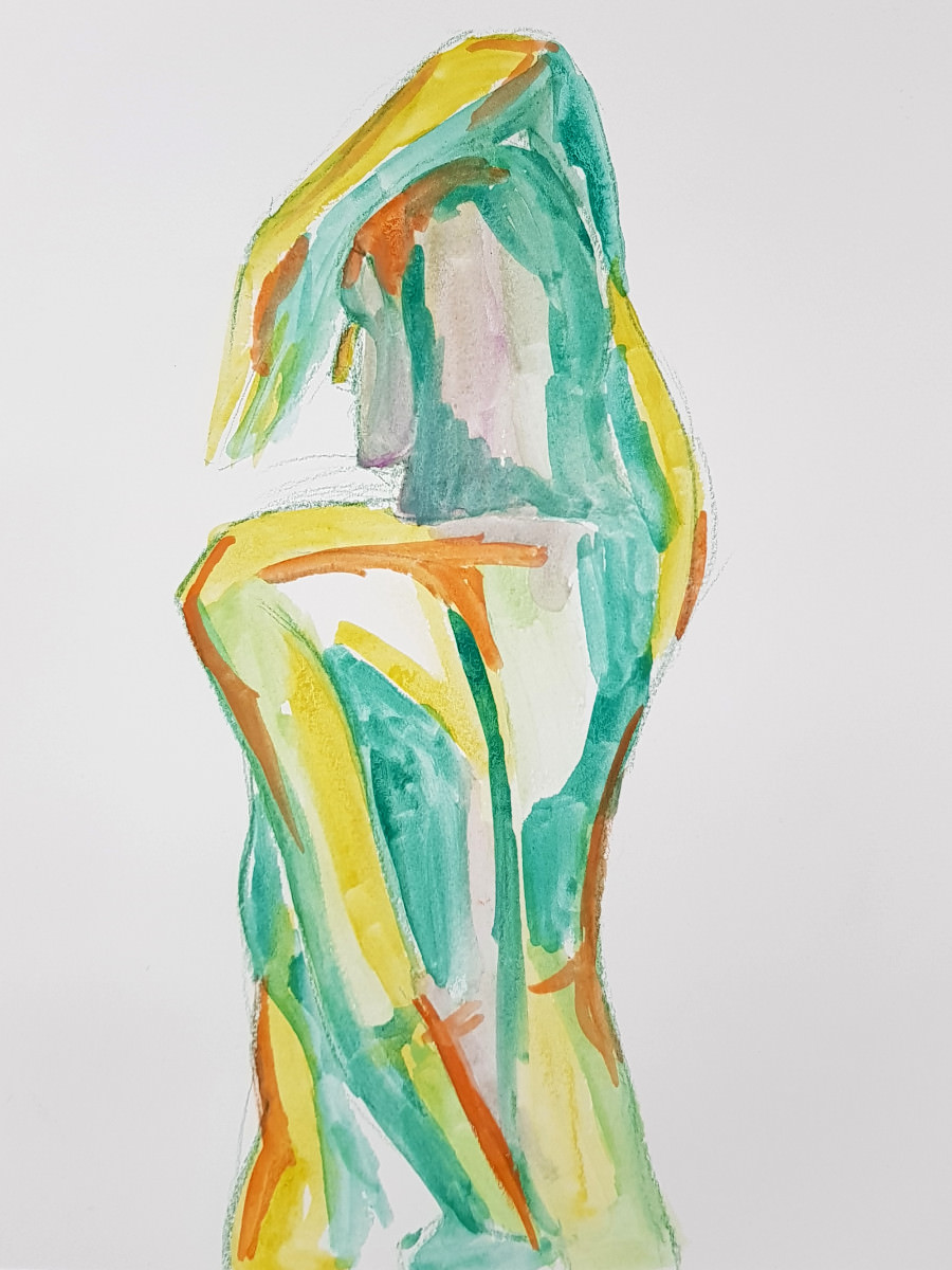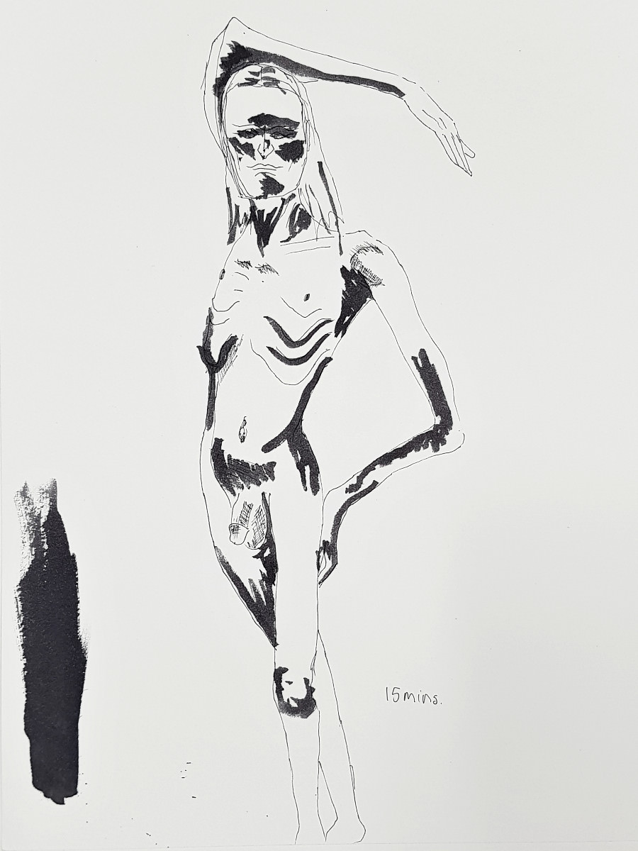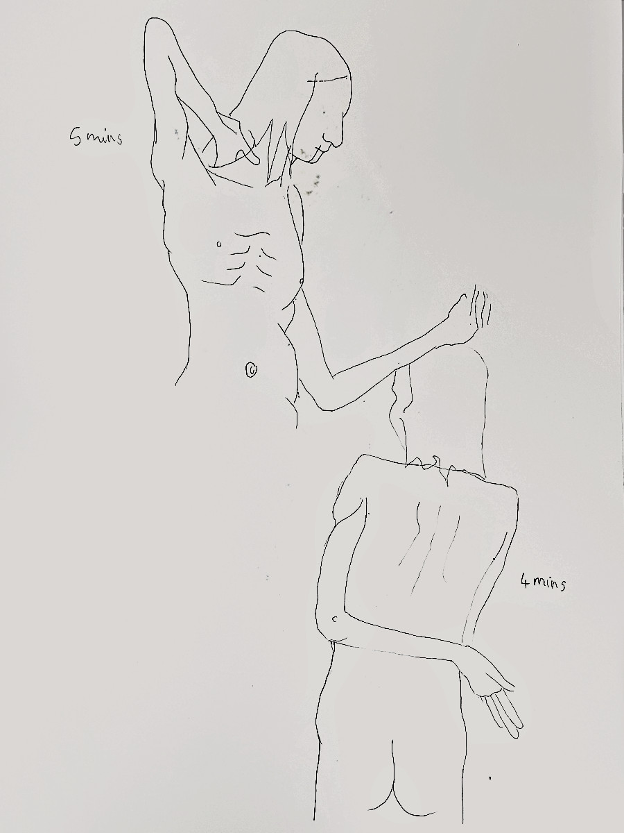 As I’ve said previously, poses with costume and props can be fun but the purist in me still favours working in an uncluttered open space as an unadorned nude figure using only body and inspiration to form creative challenges. It’s what I was able to do in this session, working in the round, mostly standing, or sometimes seated on the floor.