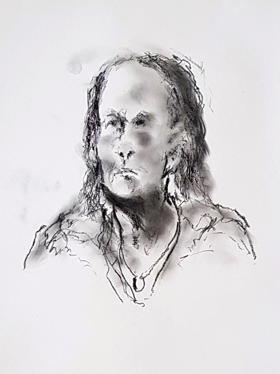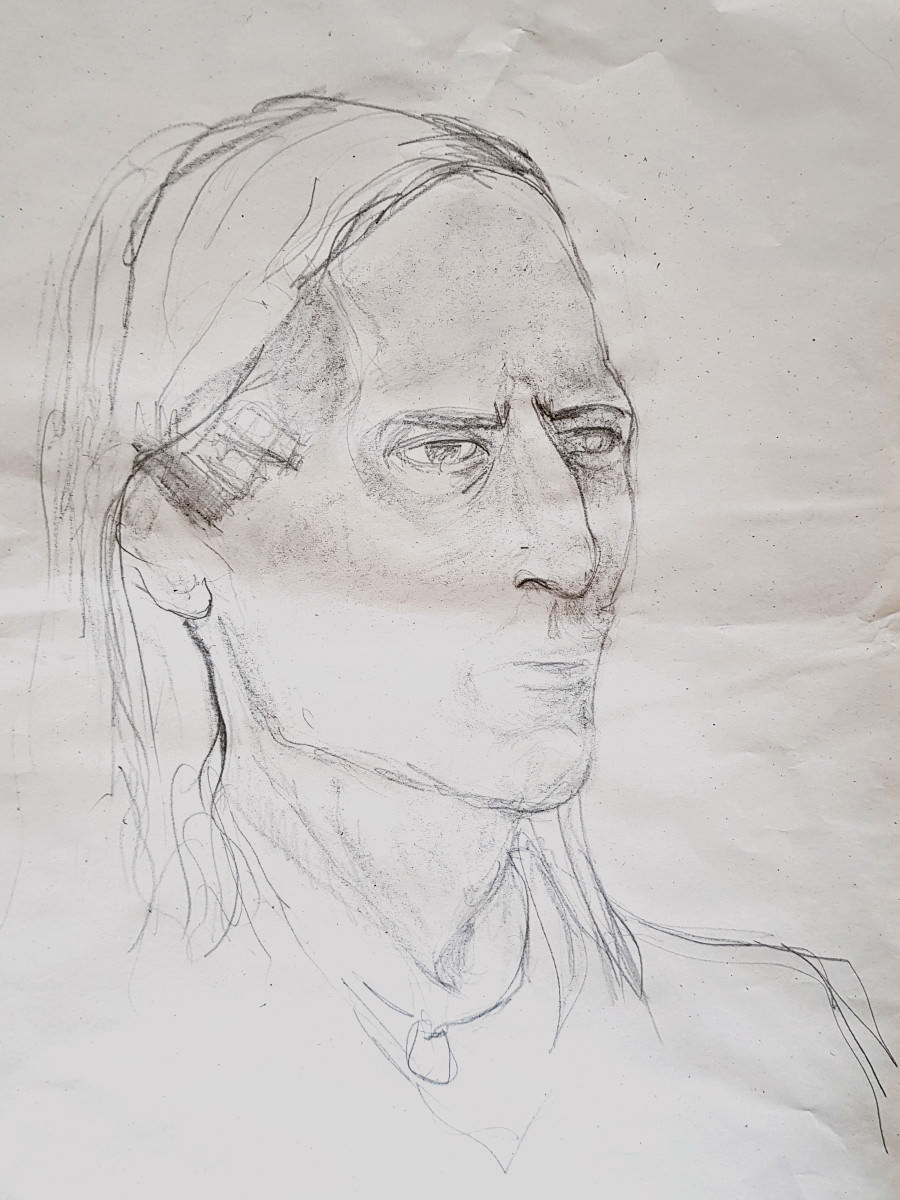 Only a handful of artists joined us, fewer than expected, but then we are entering that time of year when all groups tend to see their numbers dip. The pose plan was a new one for me at a portrait class, but was eminently sensible: three 15-minute warm-ups, seated in a corner of the room, turning 45 degrees after each pose so every artist got a face-on view, a three-quarter view and a profile view; then finally a 1-hour pose.