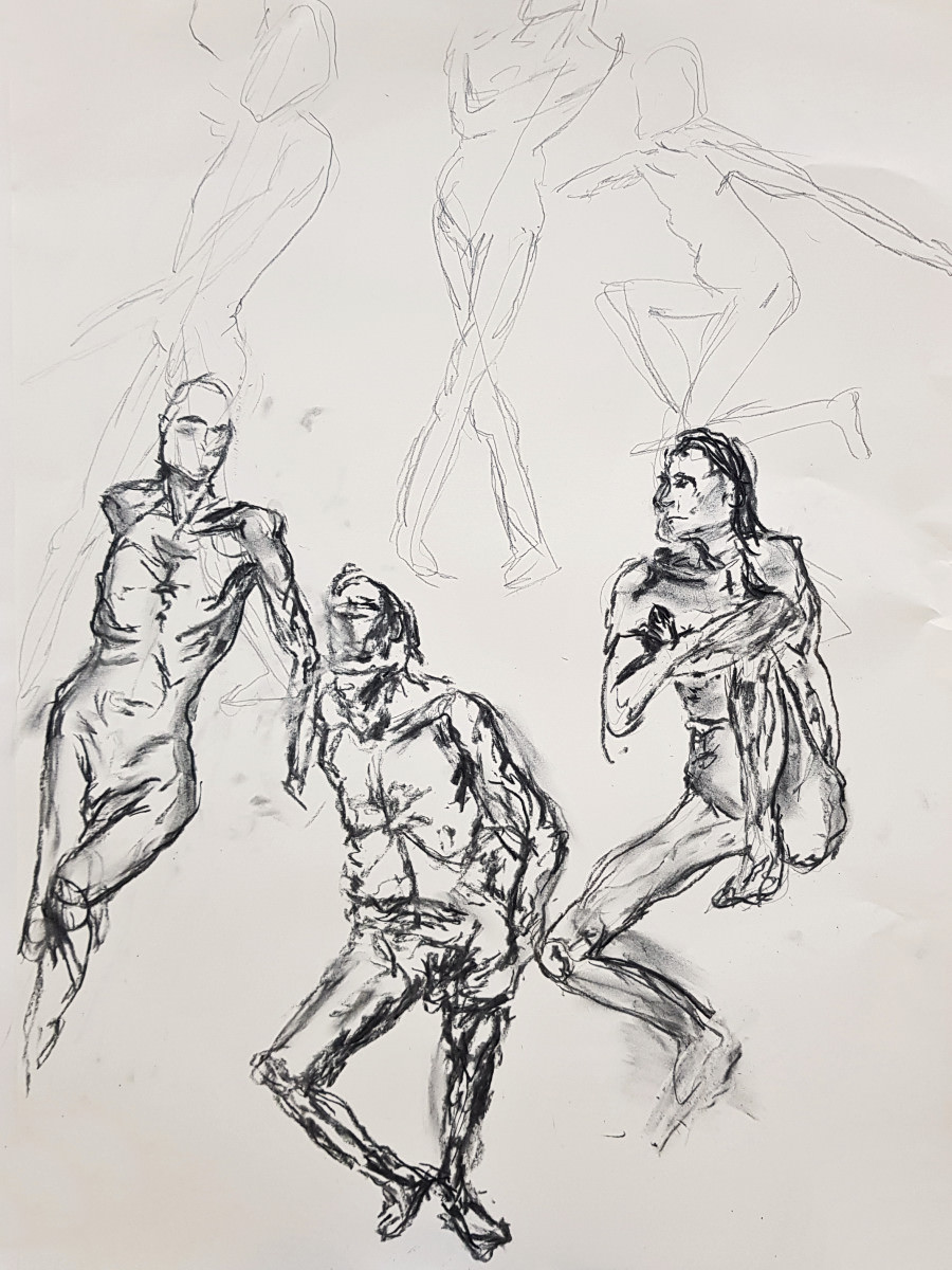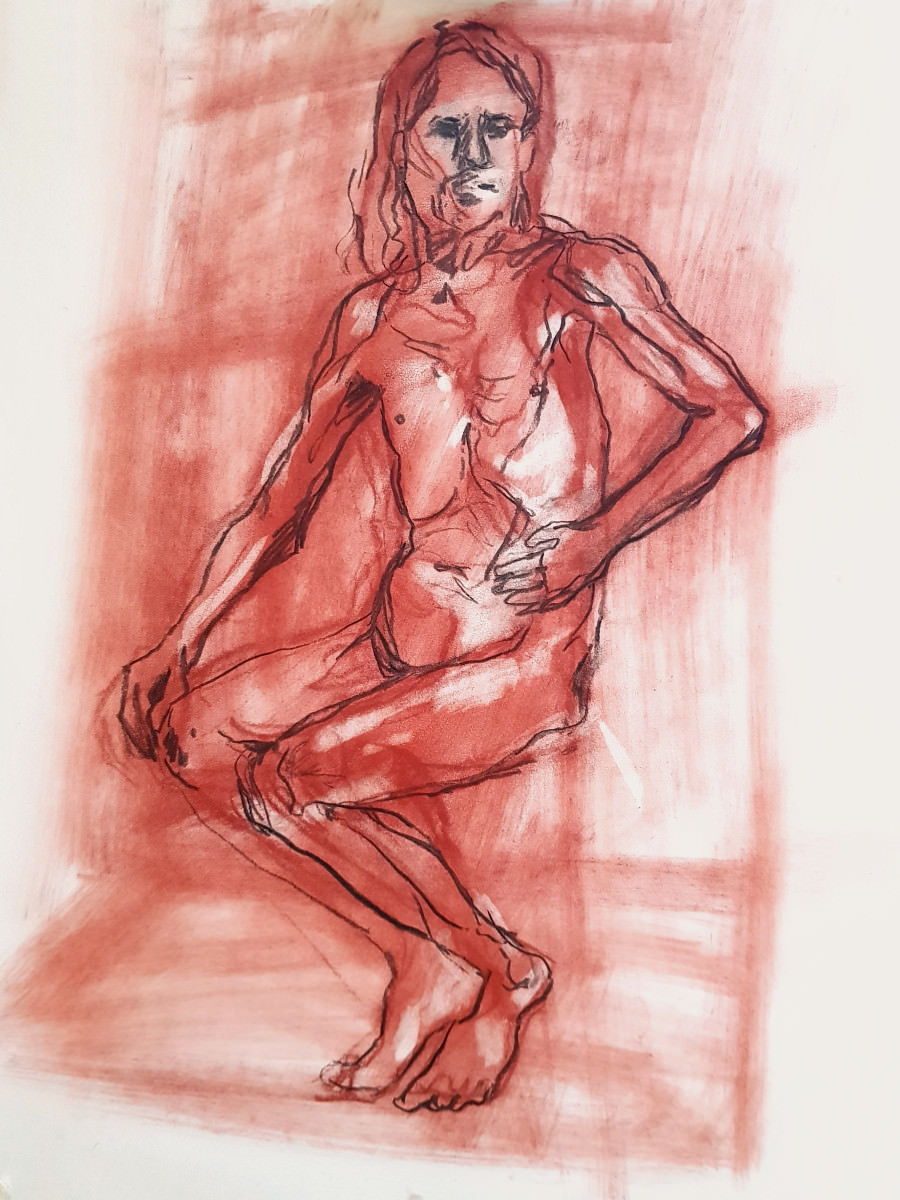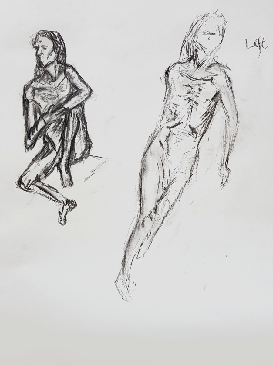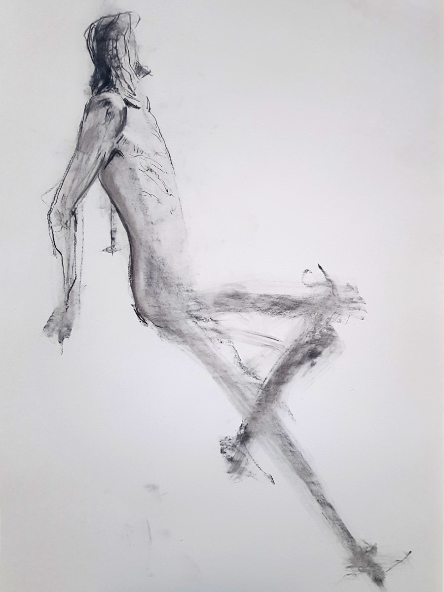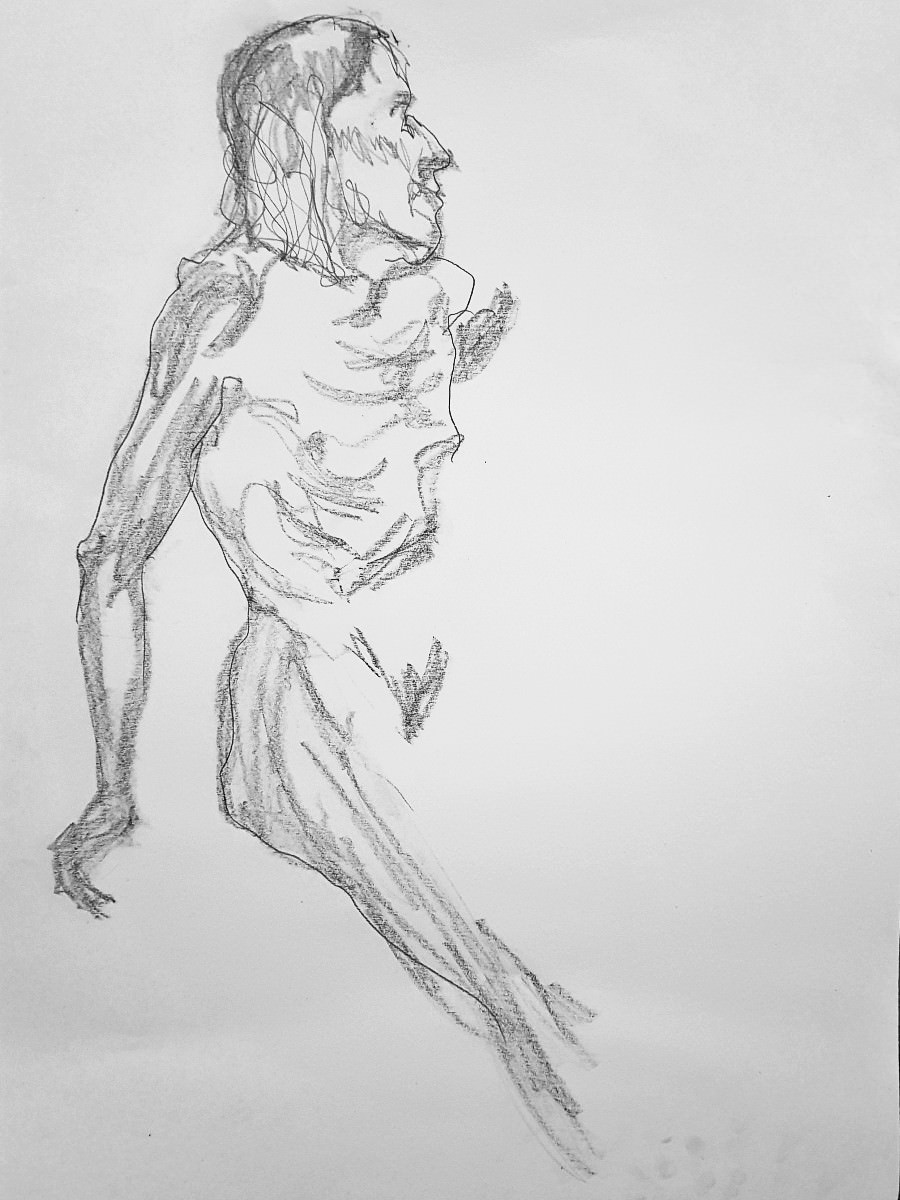I wasn’t the only one feeling the heat. Quite early in our work, an artist had to give up standing at an easel and instead be seated to draw. After our warm-ups, Anne asked me to be seated as well. I gladly complied, and was encouraged to remain seated for all the remaining poses. I could have comfortably stood… but why be a martyr? 🙂