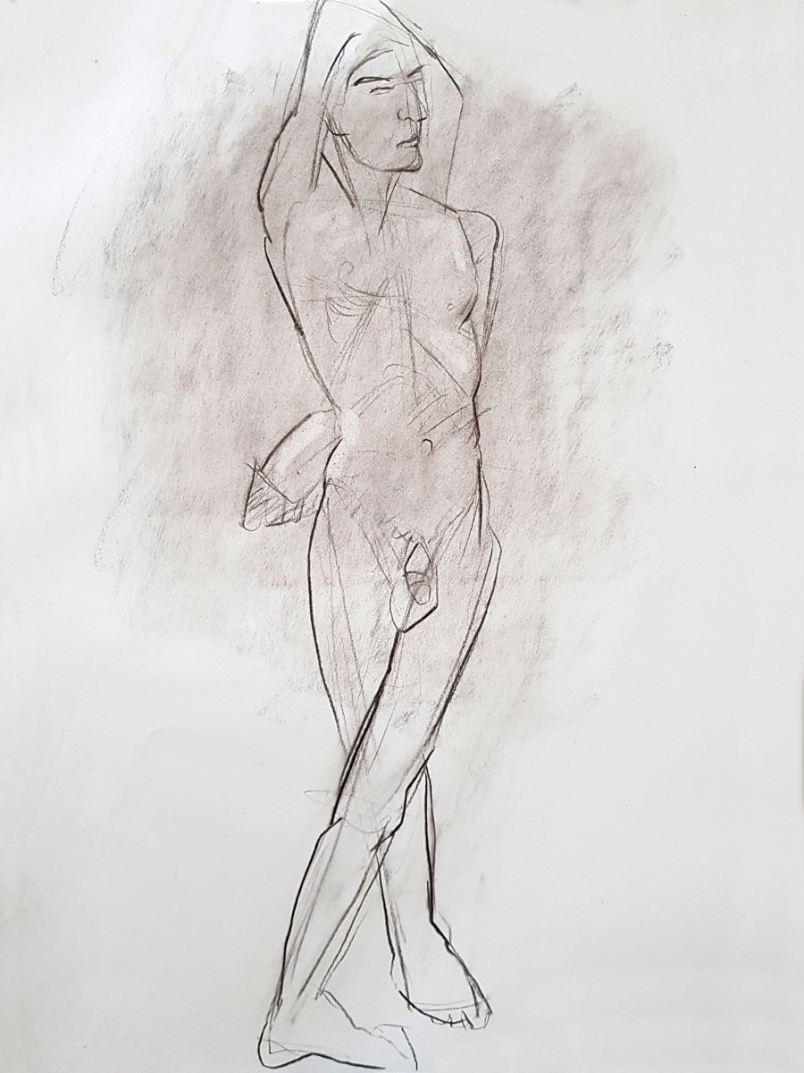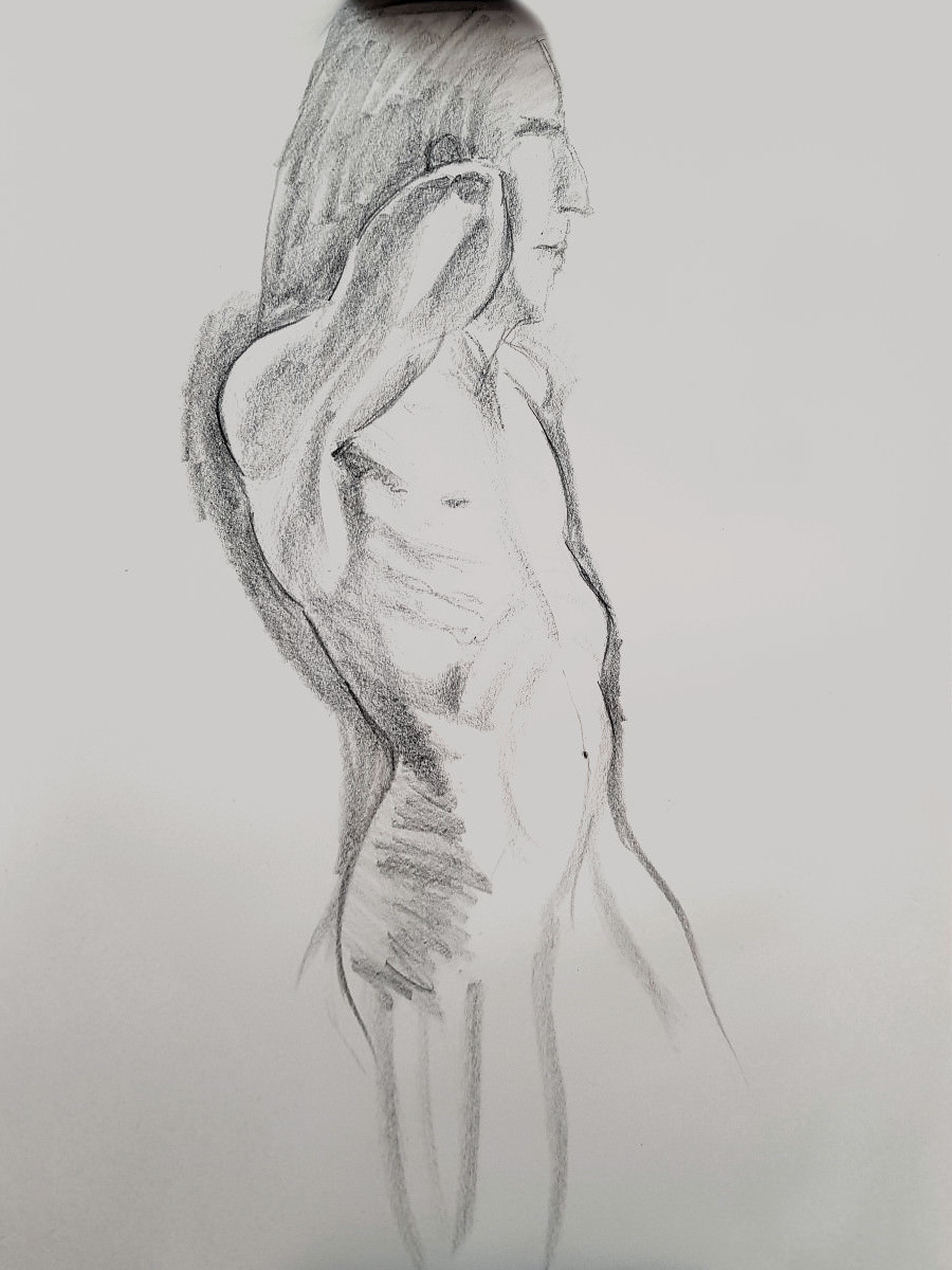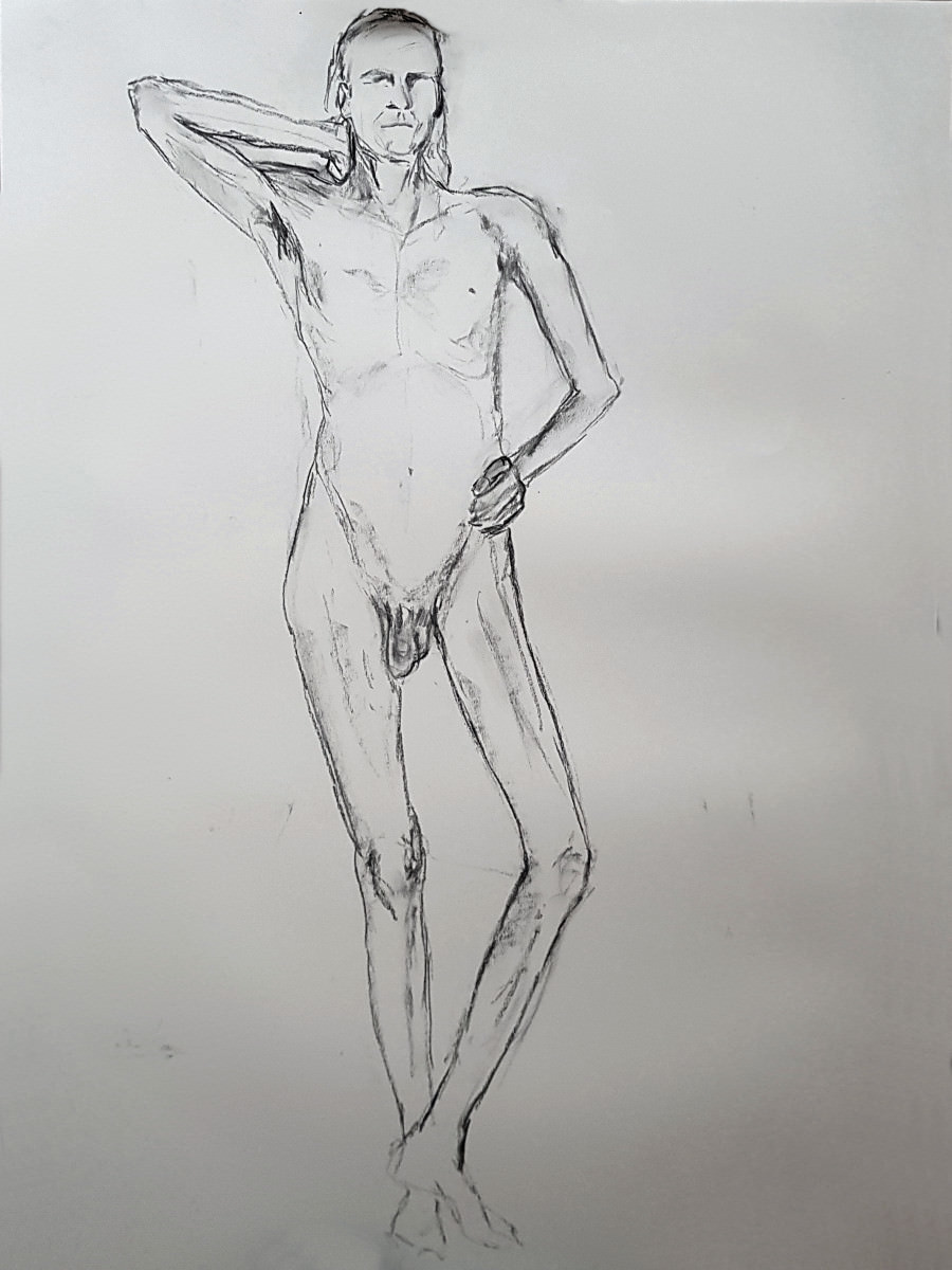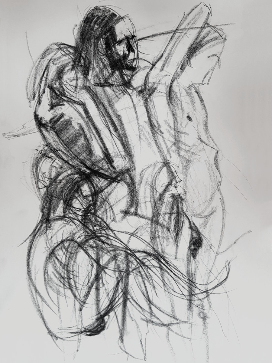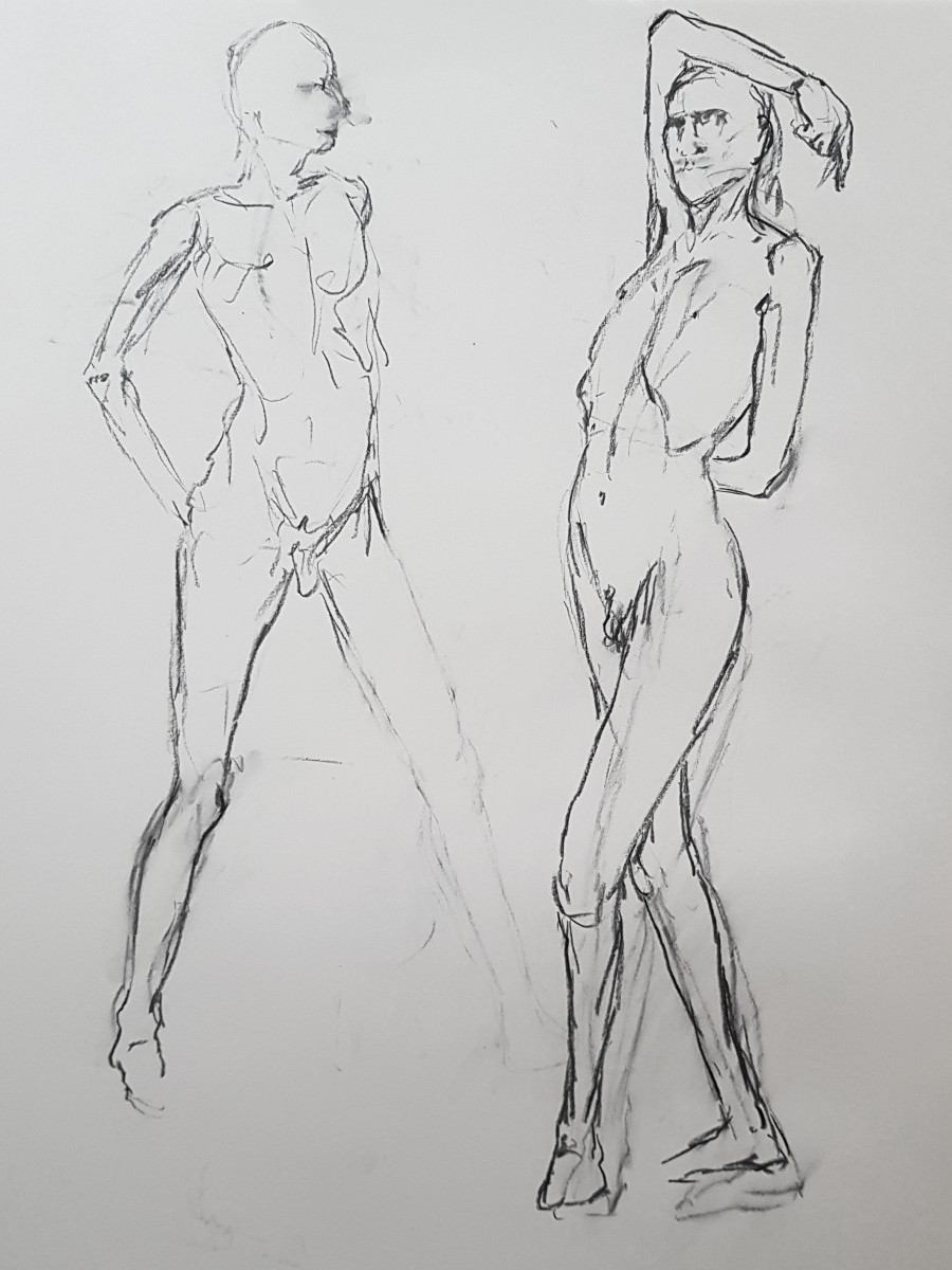 We slowed down after our half-time break, concluding this ‘part 1’ with two 20-minute poses. I felt strong throughout and stood for most poses, including the longer pair. I’d feared I might regret spending two hours walking round the National Gallery’s ‘Siena‘ exhibition before more walking to this job, but my spindly legs coped. Next, part 2…