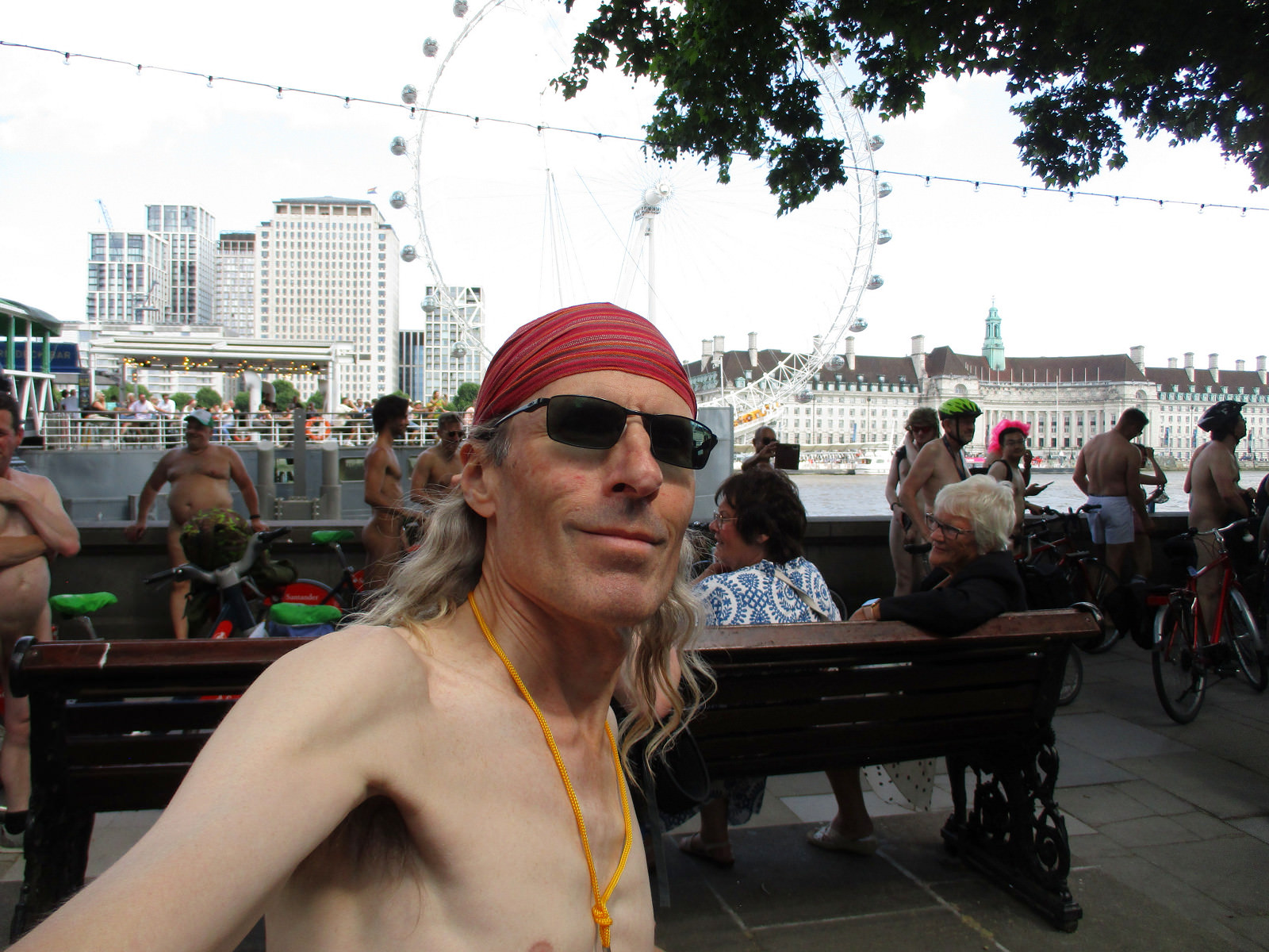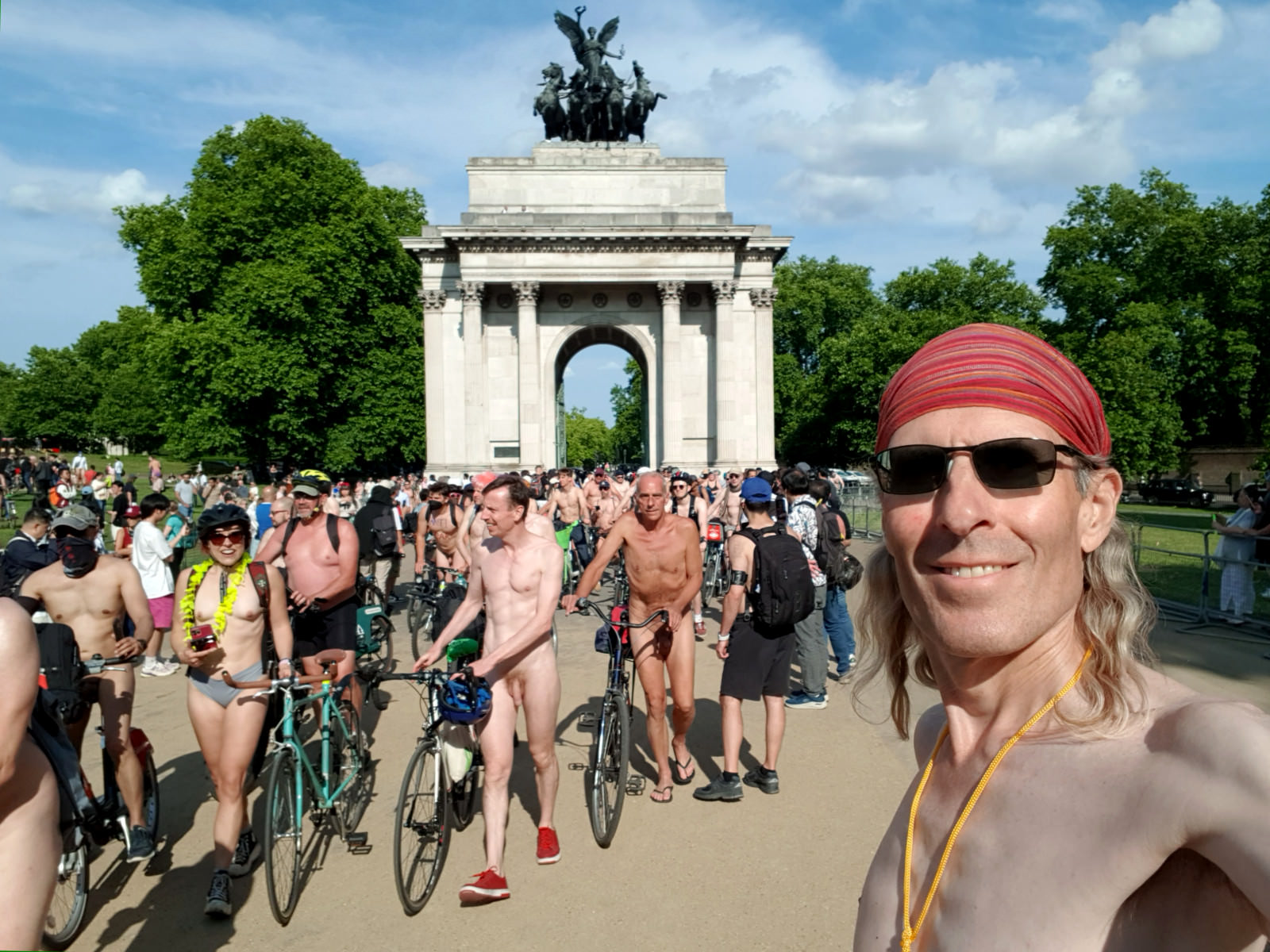It was ideal weather for a World Naked Bike Ride (WNBR). This year, 2025, was set to be the fifteenth time I would take part in WNBR London. I made sure my panniers were loaded with essentials: a bicycle repair kit, a tyre pump, a camera and a whistle. Most importantly, I left plenty of room for my soon-to-be stripped-off clothes.