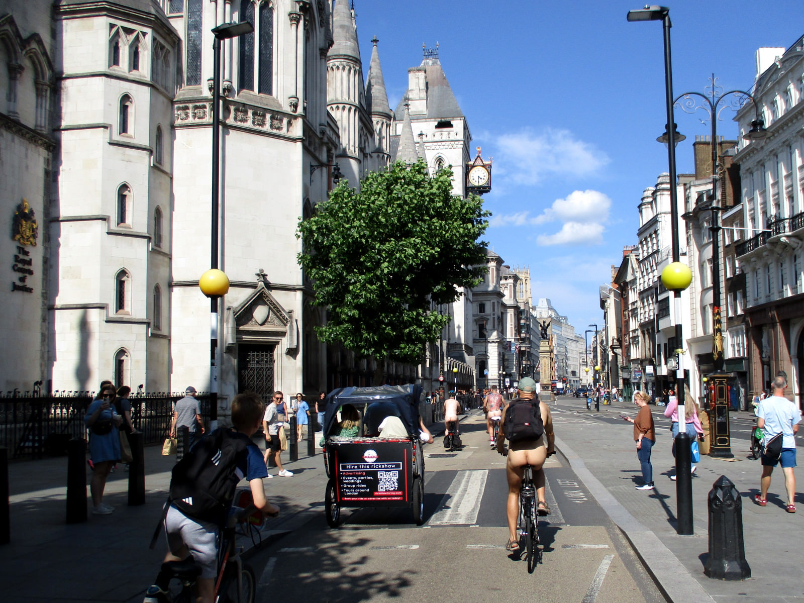 As usual we returned north via Waterloo Bridge. Whilst on the bridge, sheer numbers of buses squeezed us almost to single file. Traffic lights at Strand then clipped us into small groups, some of which didn’t know where to go next. Enough riders missed our Chancery Lane turn that by the time I reached Carey Street, I was utterly alone…