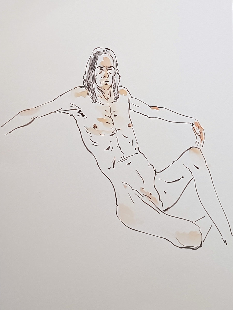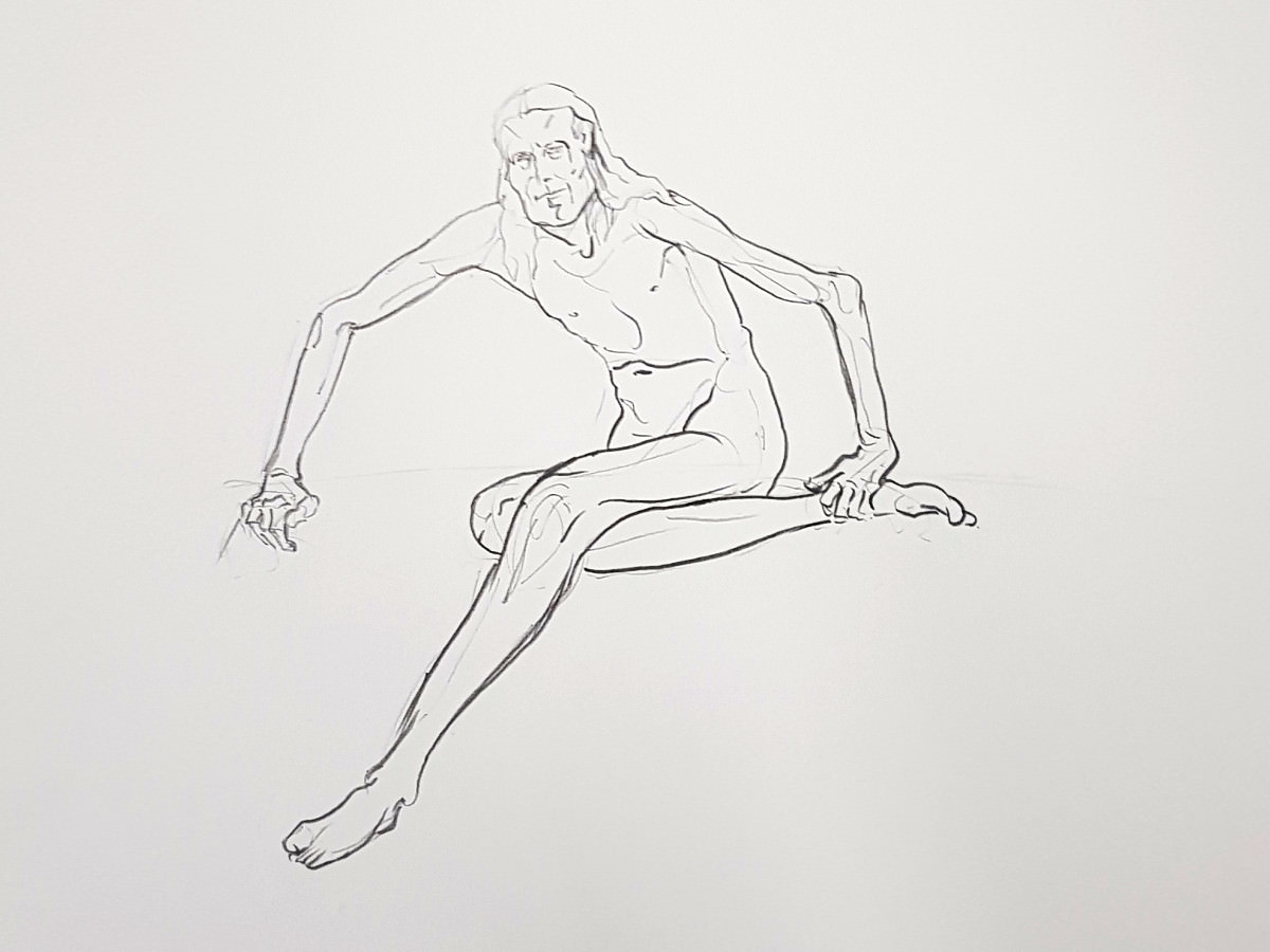Overall this session was a great way to resume after time away. Lots of variety to get my pose brain back up to speed, a nice glass of wine at the half-time interval, and so many staggeringly good drawings – from so few minutes – revealed at the end.