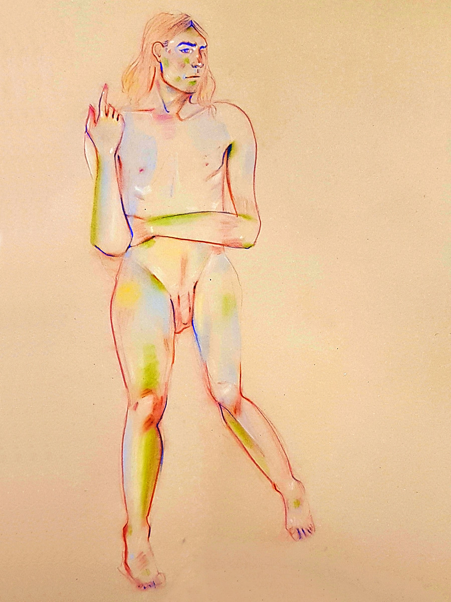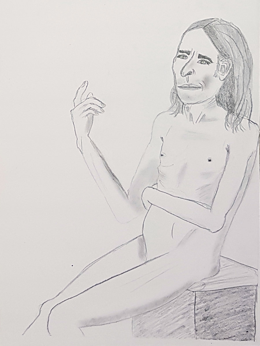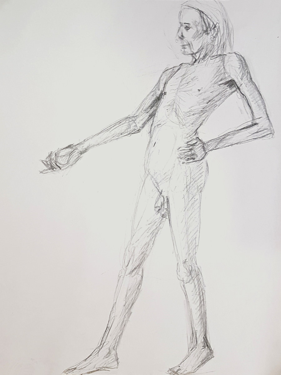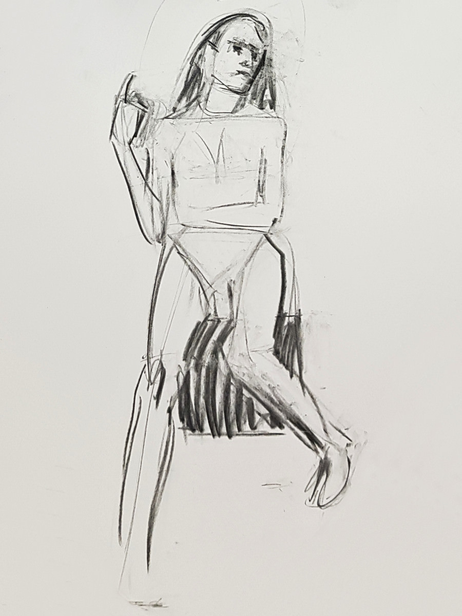 On a pleasant midsummer’s day it was perhaps understandable that we didn’t have a huge turn-out of artists, but still enough to align as a single arc on chairs or at easels. Nice people, talented people; a pleasure to pose for. Some short poses, then the first 20 minutes of a long pose, followed by 40 minutes more after tea and biscuits. 👍