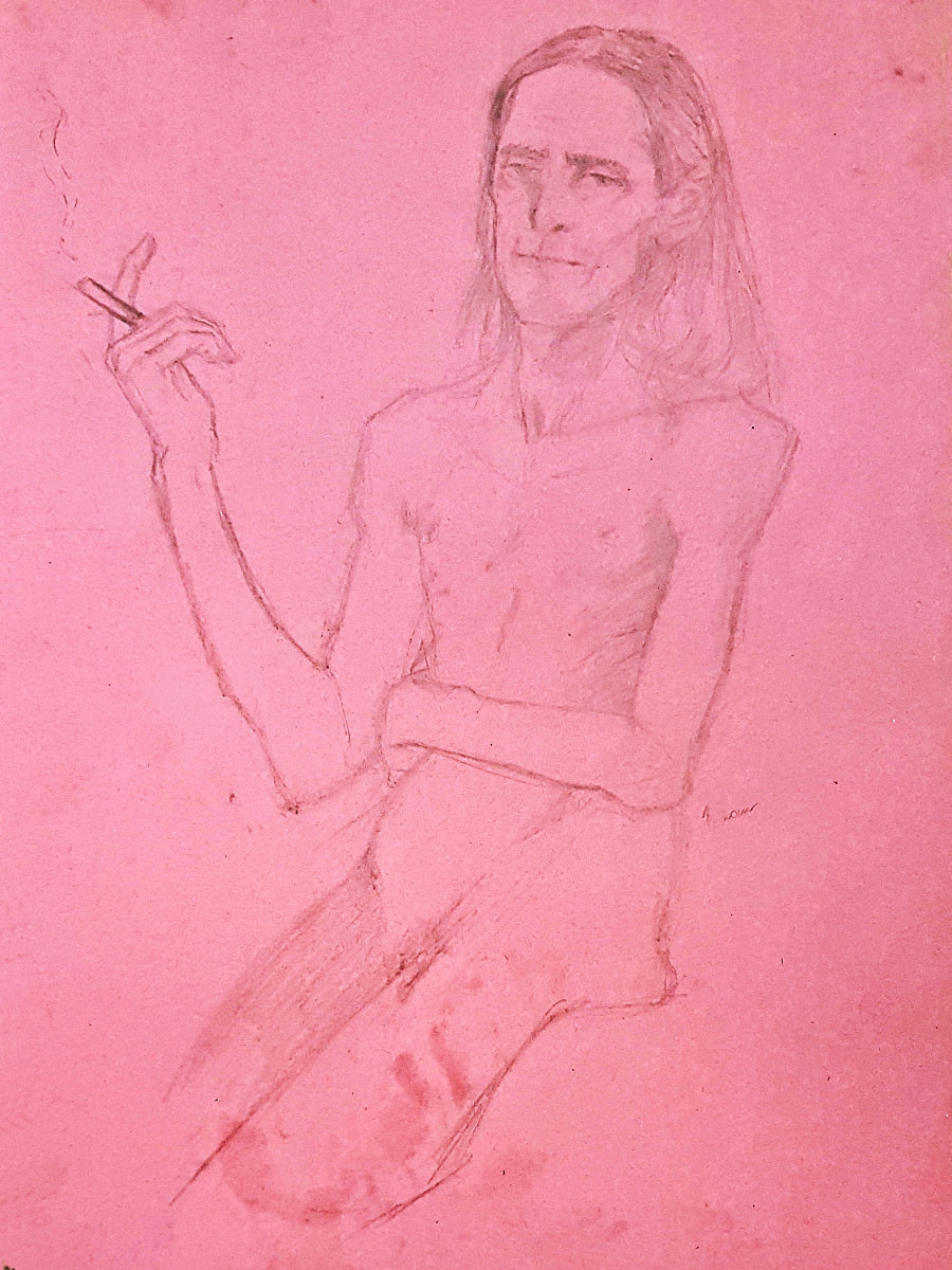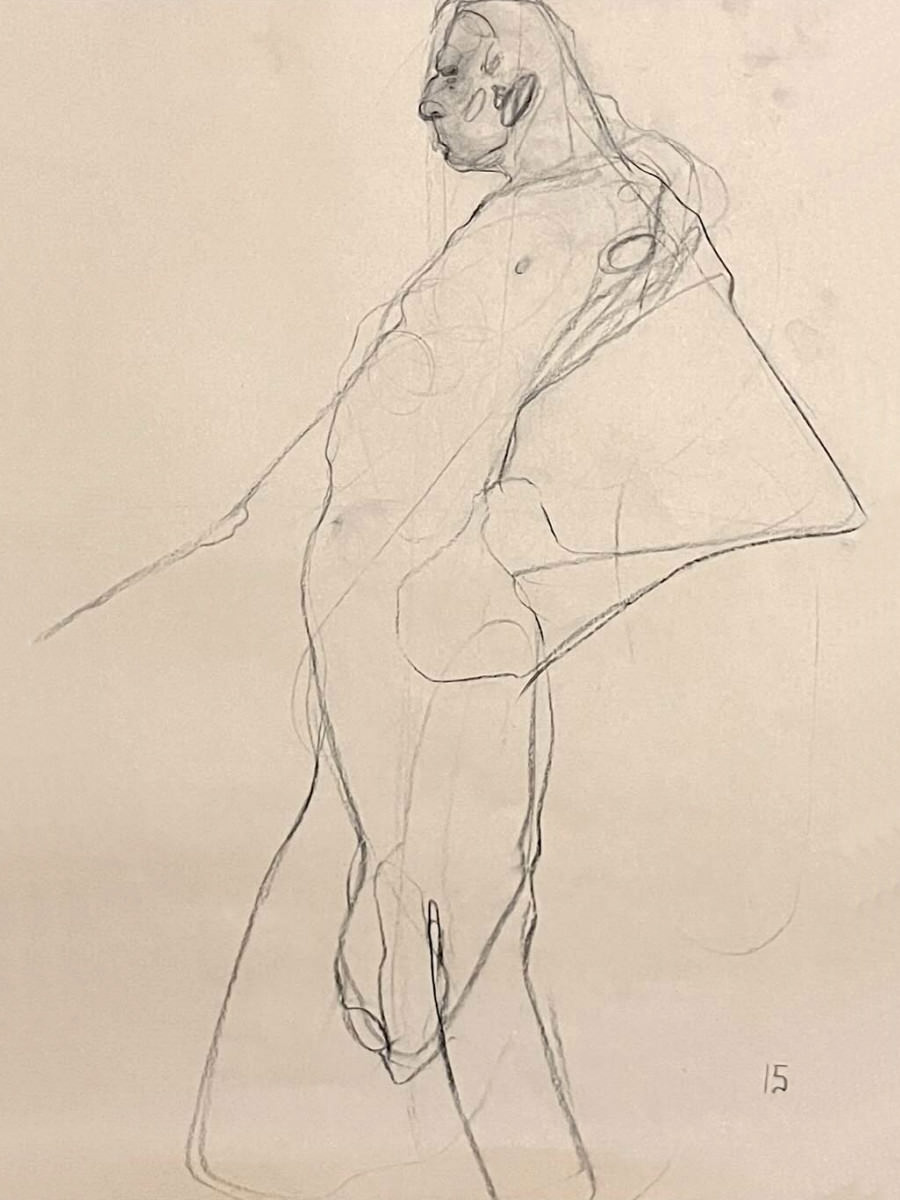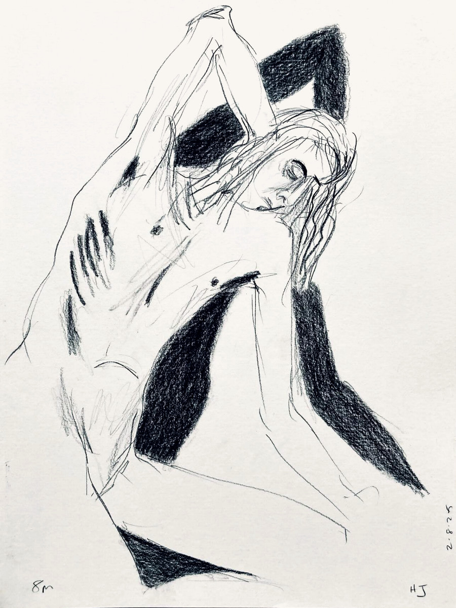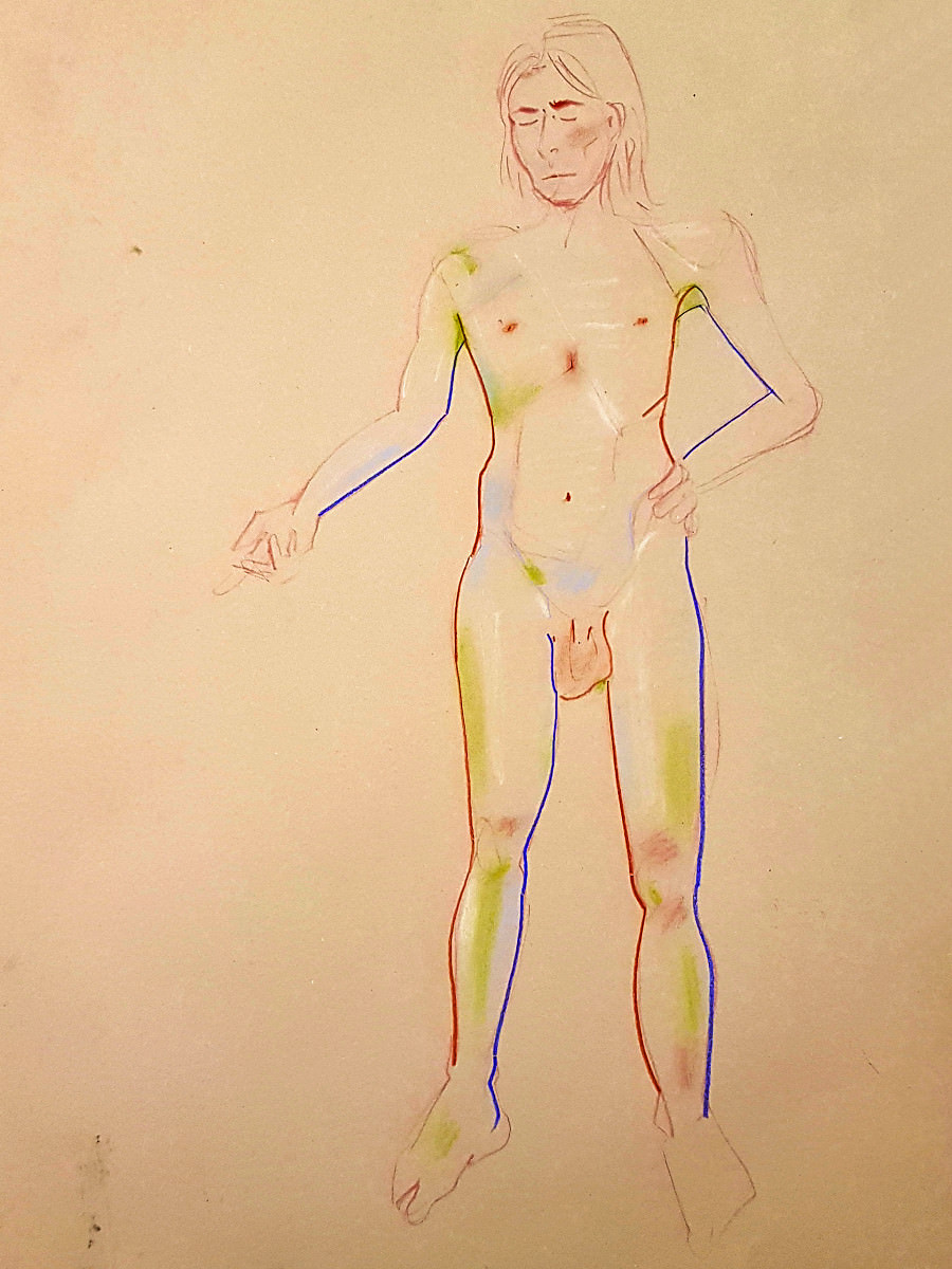 On a pleasant midsummer’s day it was perhaps understandable that we didn’t have a huge turn-out of artists, but still enough to align as a single arc on chairs or at easels. Nice people, talented people; a pleasure to pose for. Some short poses, then the first 20 minutes of a long pose, followed by 40 minutes more after tea and biscuits. 👍