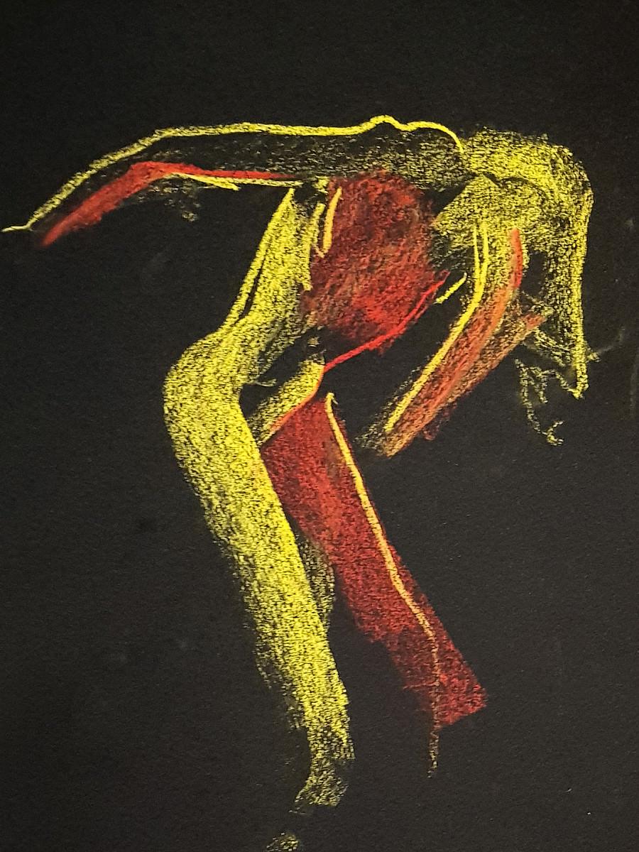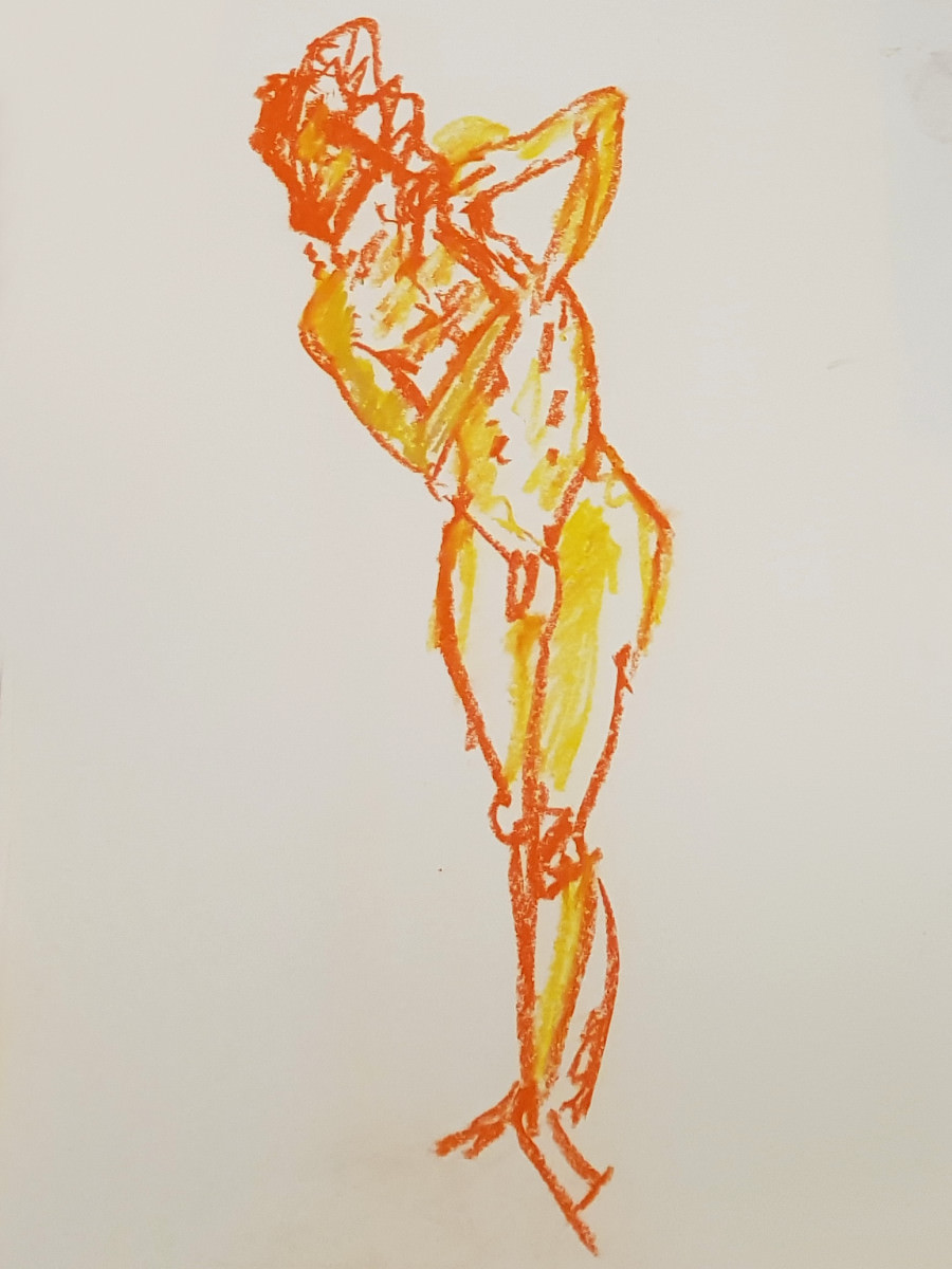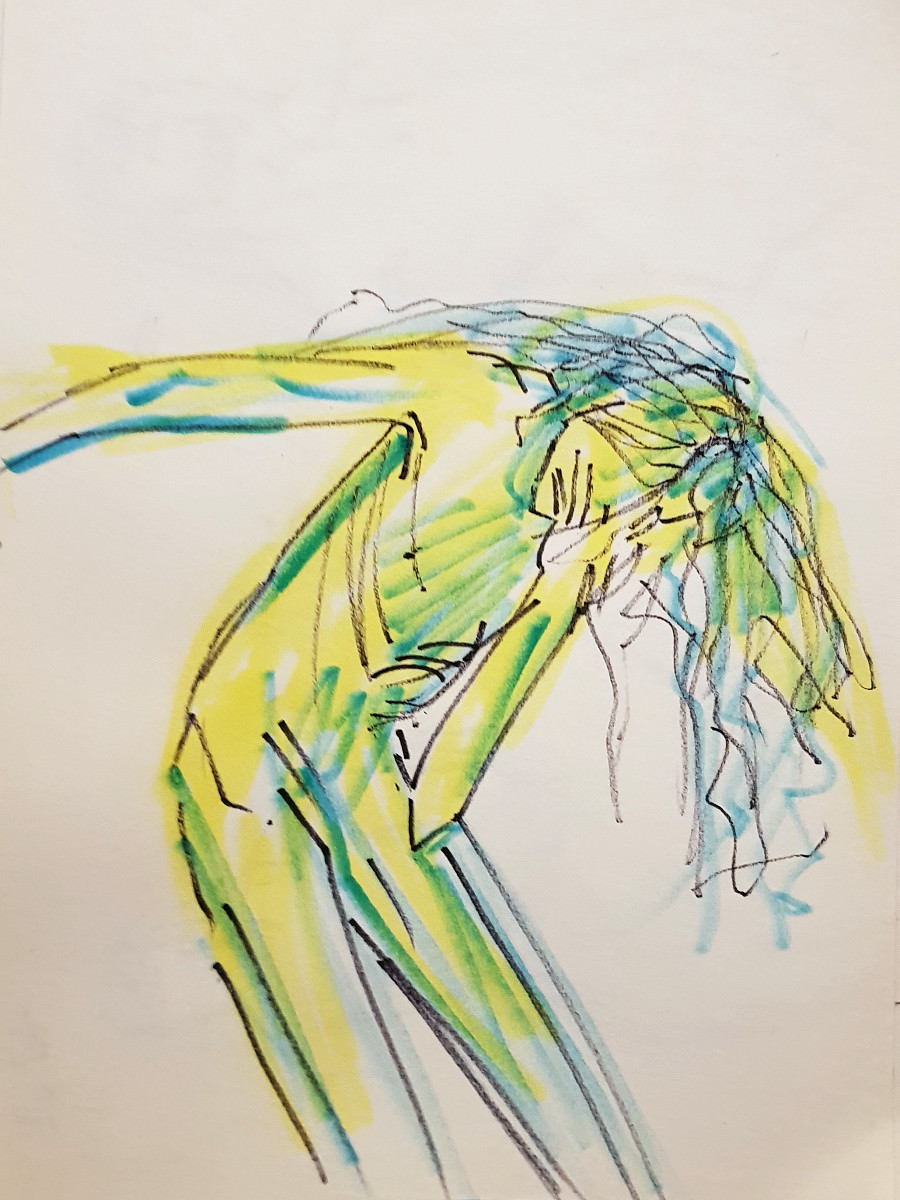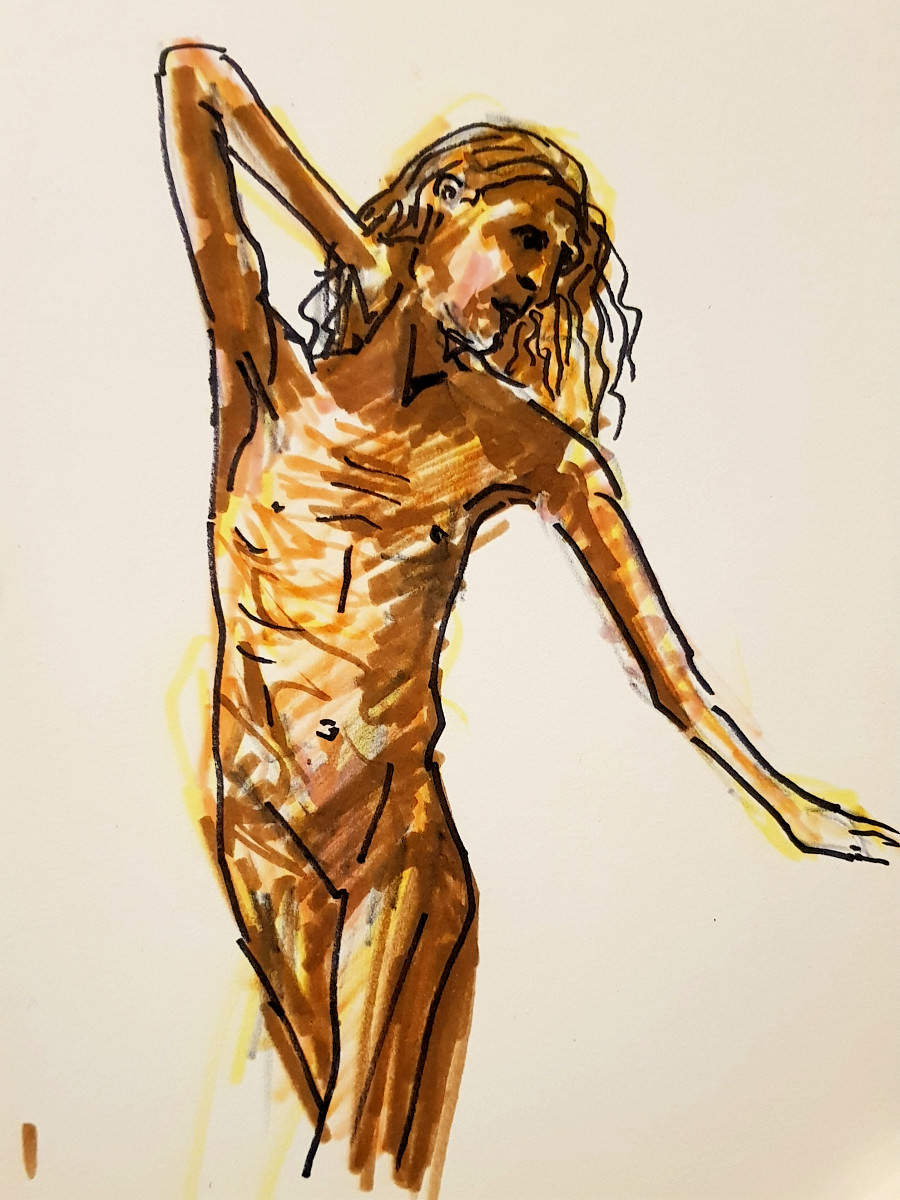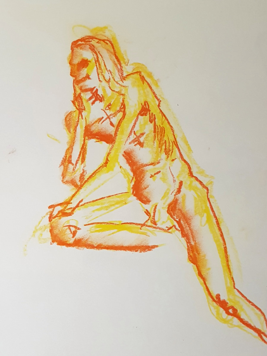 The final pose was a hurty one, as were a couple of the 1-minute / 30-second poses, but I survived. At the end I dressed in a side room then rejoined organiser Catherine Hall and all the artists to admire their creativity. So much freedom of expression, with confident lines and colours in abundance. I love working here. Good to be back.