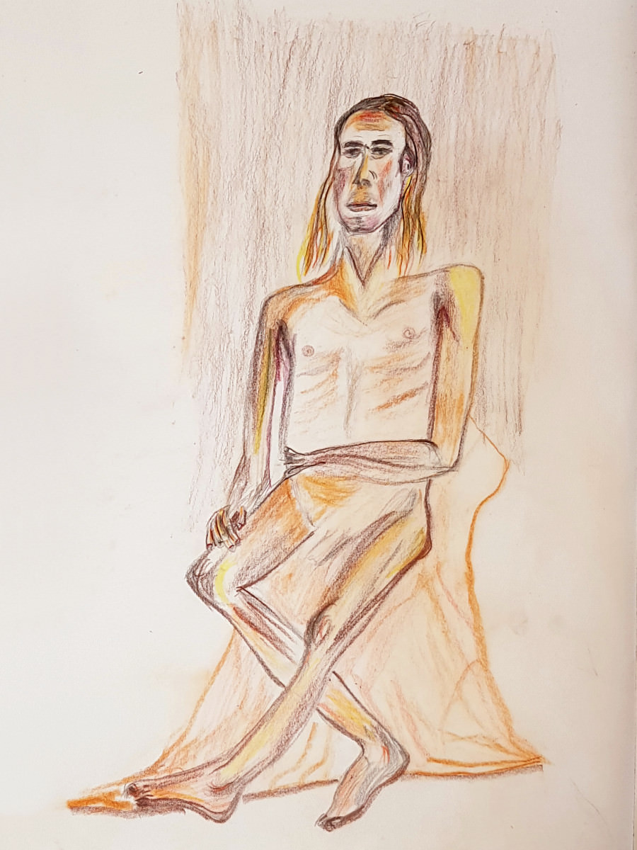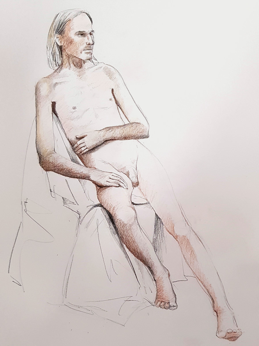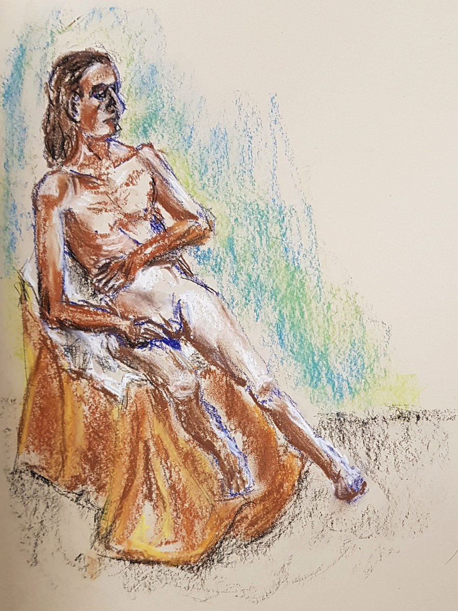 This session was life drawing. We began with four 5-minute warm-up poses ahead of the long pose that would occupy the remainder of the evening, with a break for cakes and refreshments. A couple of artists asked whether I would mind them taking photos of me in pose; I obliged willingly. I feel valued here. I’m happy to go the extra mile.