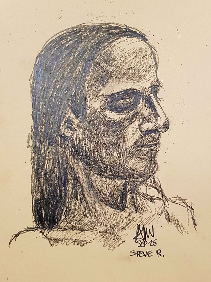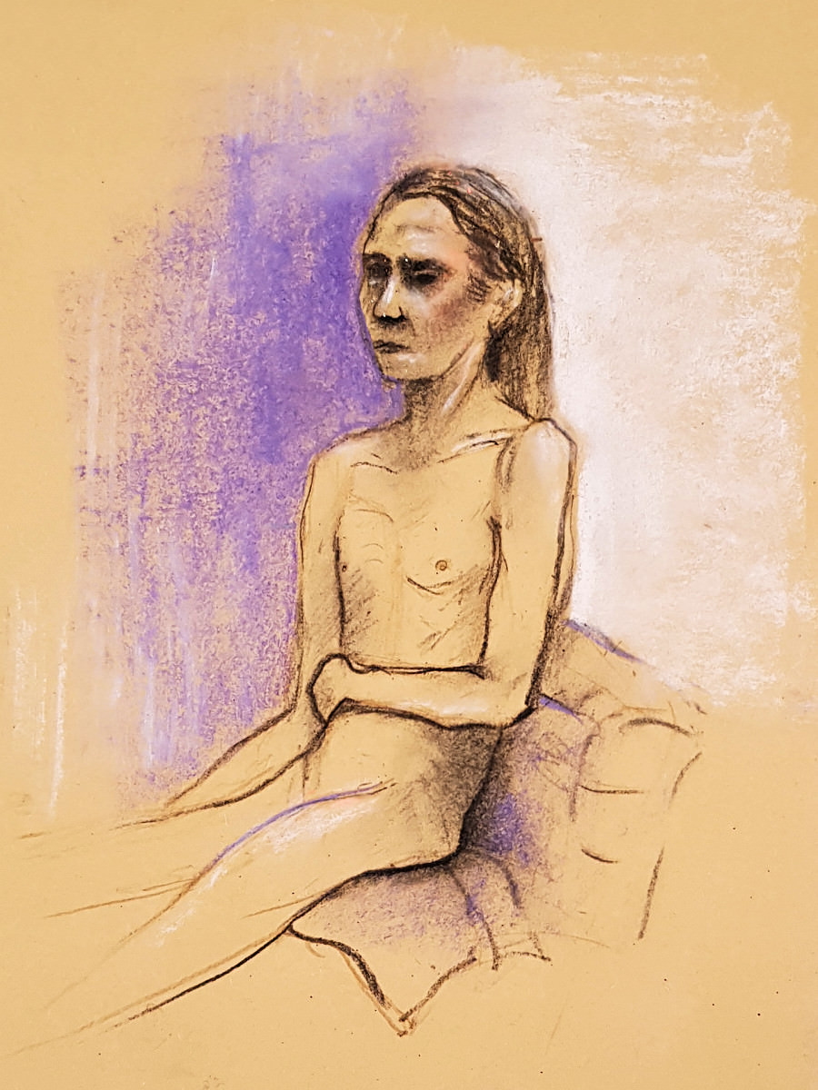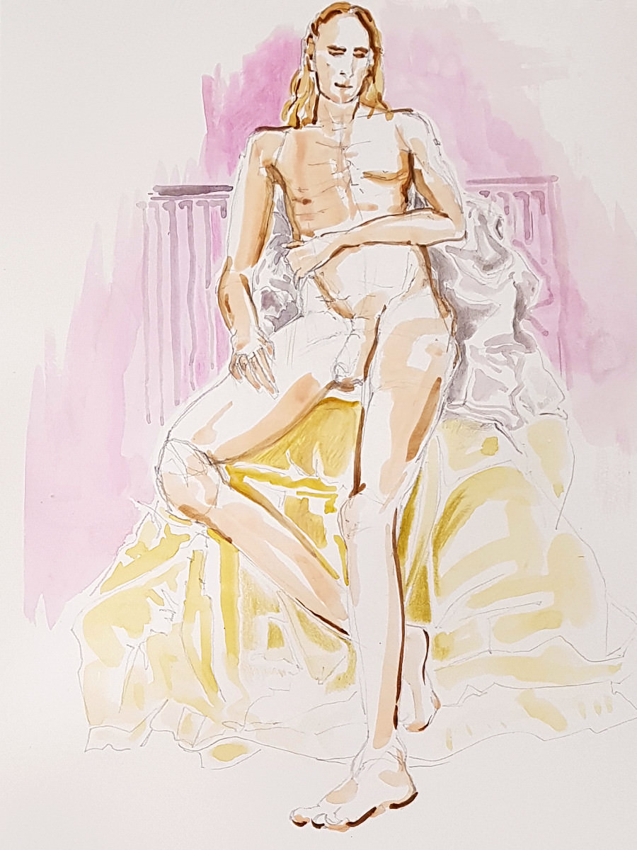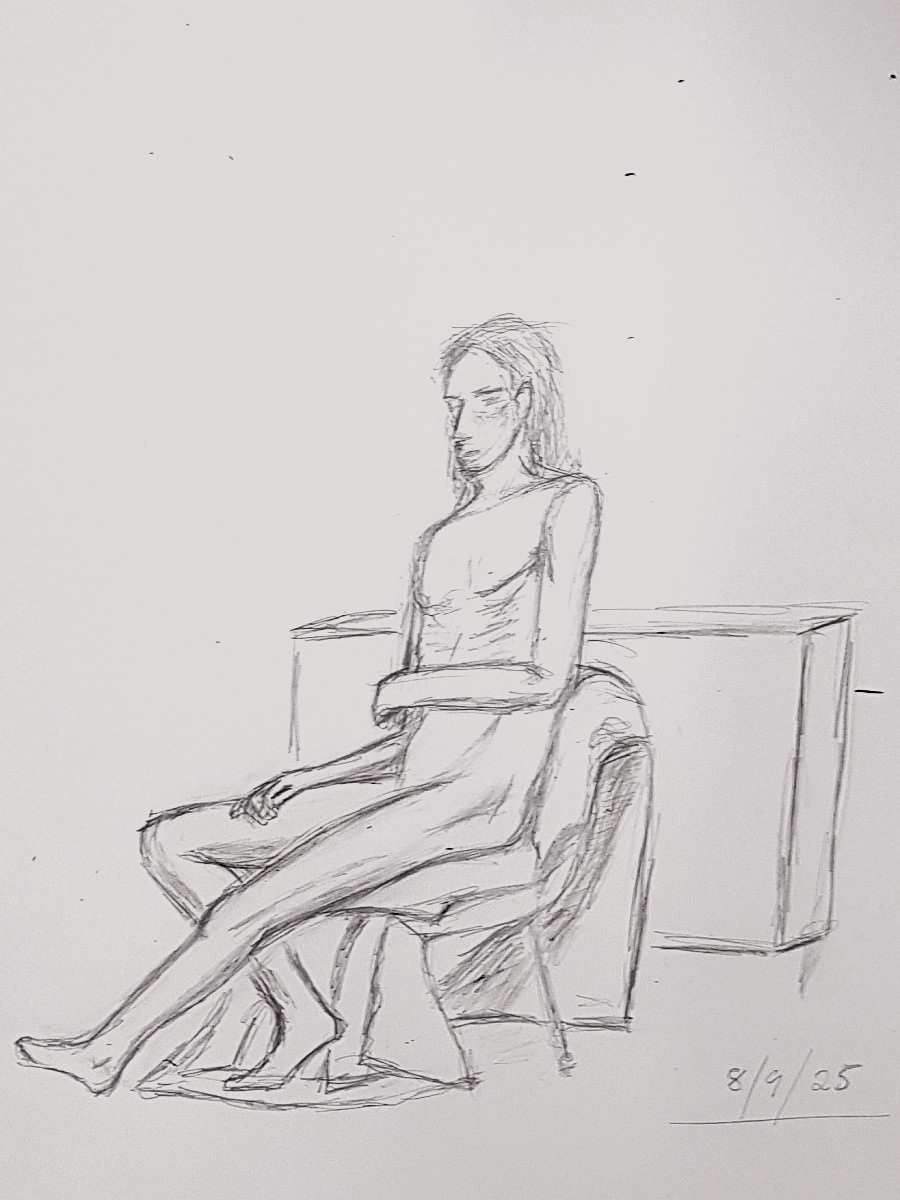 This session was life drawing. We began with four 5-minute warm-up poses ahead of the long pose that would occupy the remainder of the evening, with a break for cakes and refreshments. A couple of artists asked whether I would mind them taking photos of me in pose; I obliged willingly. I feel valued here. I’m happy to go the extra mile.