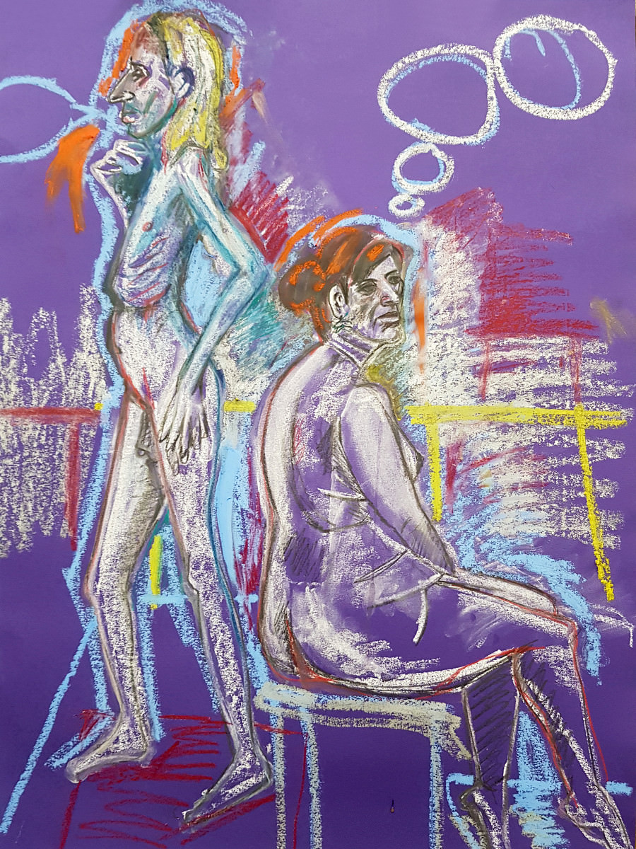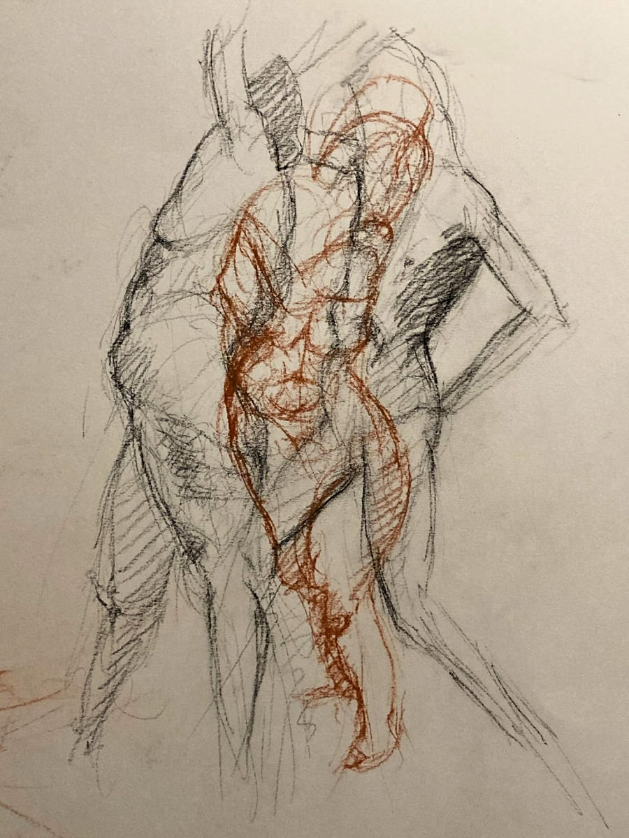 It was a ‘duo’ session only insofar as two models occupied the same pose space. No interaction. I told fellow model Sandra I was happy to stand so maybe she would like to sit, thereby making different levels and shapes within the overall tableau. This was agreed and after three 5-minute warm-ups that’s how we proceeded.