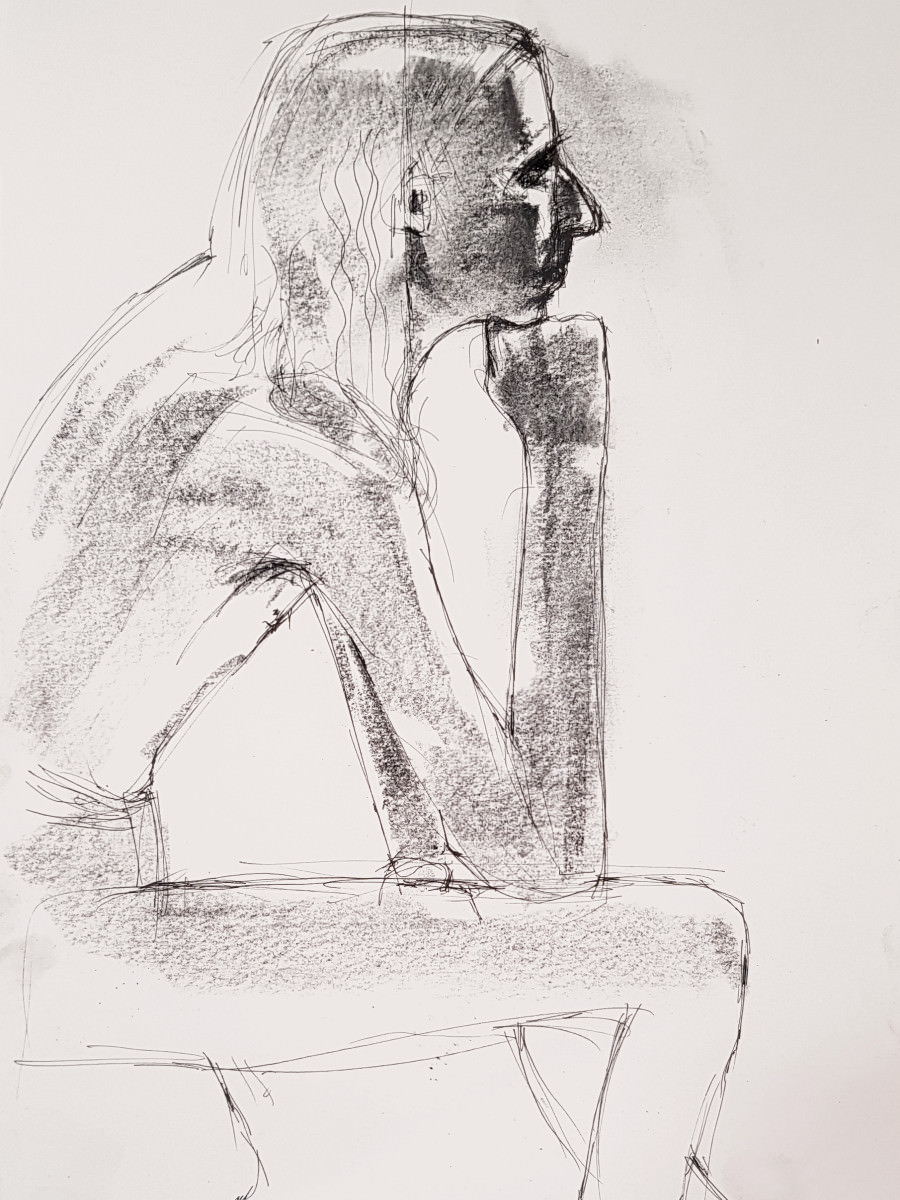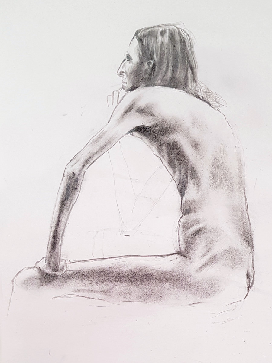 …and so to part 2 of a double session for Tunbridge Wells Life Drawing. During the half-hour interval between part 1 (shorter poses) and resuming for part 2 (long pose) time was spent admiring works that artists made earlier, and eating a modest packed lunch that I myself made earlier. Not quite a full rest and recharge, but sufficient.