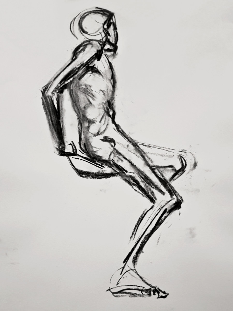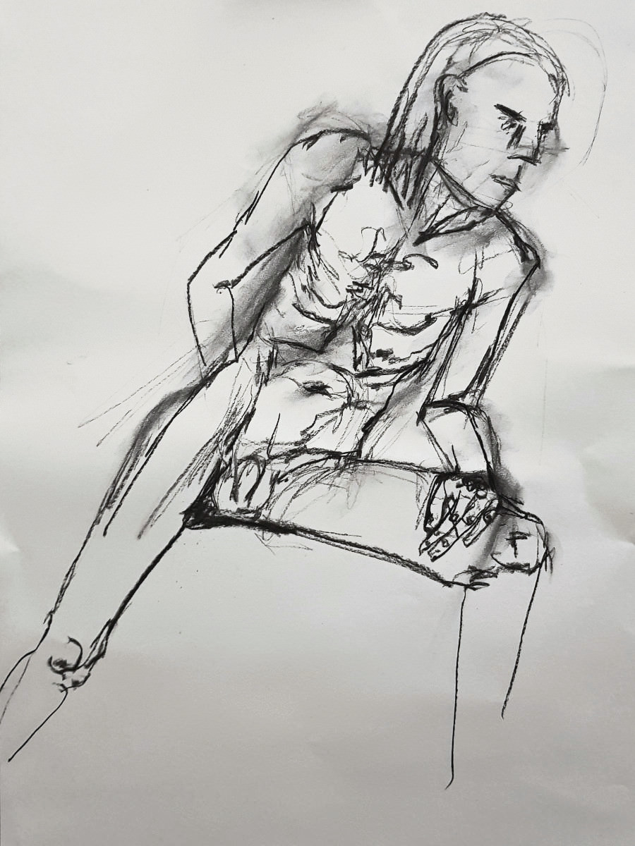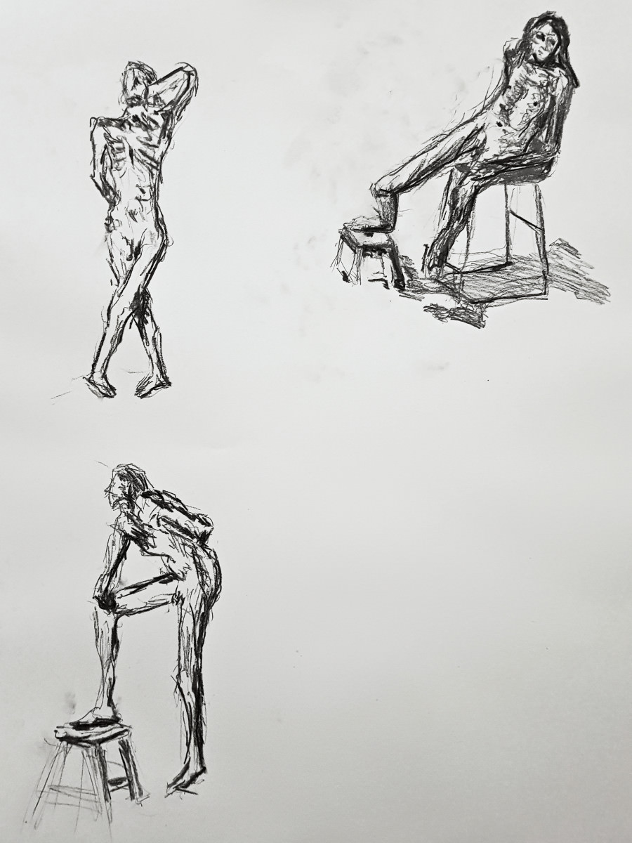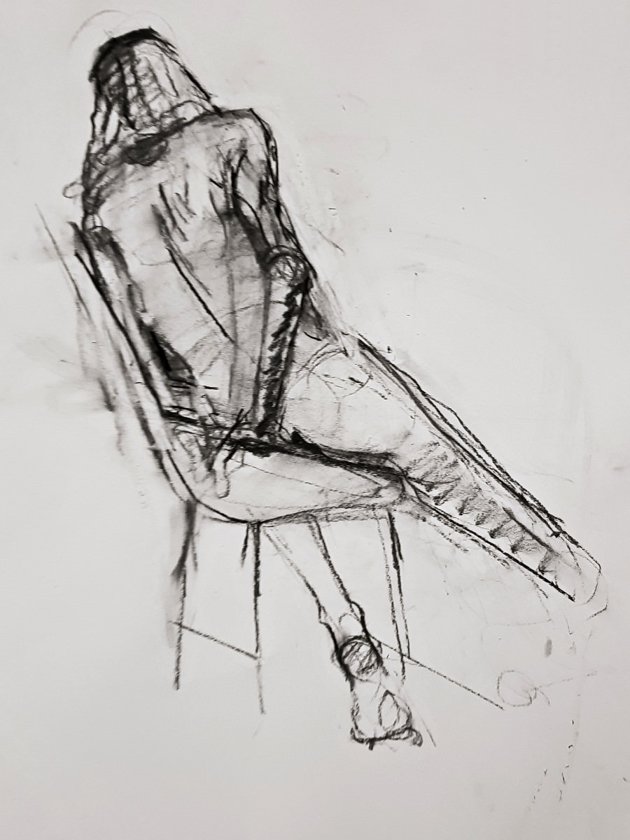 I started with a 15-minute warm-up pose that allowed time for everyone to choose an easel and get settled. Once liberated from sign-in duties by the door, Anne of London Drawing then steered the group through a flurry of quick-fire 2-minute poses followed by loosely-timed longer poses, with suggestions and feedback for artists throughout.