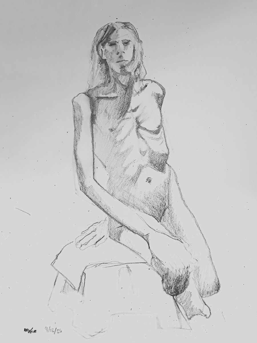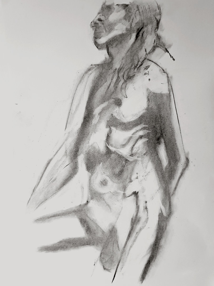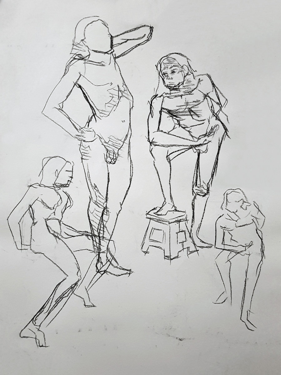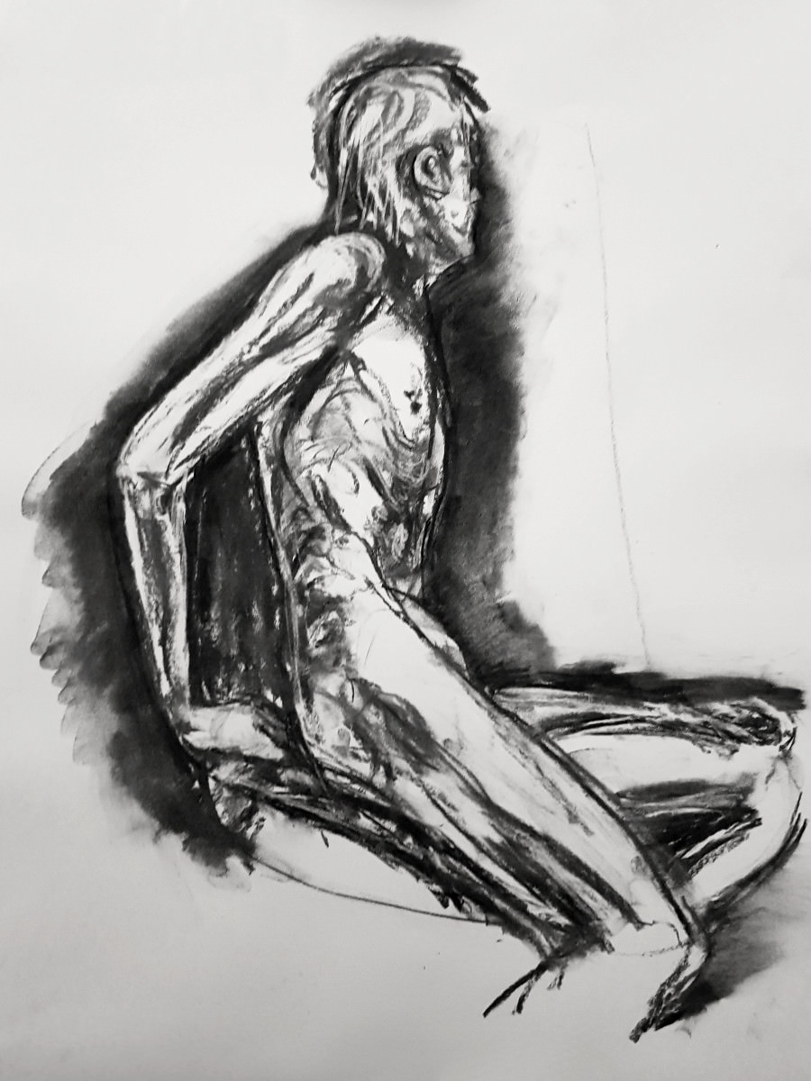 I started with a 15-minute warm-up pose that allowed time for everyone to choose an easel and get settled. Once liberated from sign-in duties by the door, Anne of London Drawing then steered the group through a flurry of quick-fire 2-minute poses followed by loosely-timed longer poses, with suggestions and feedback for artists throughout.