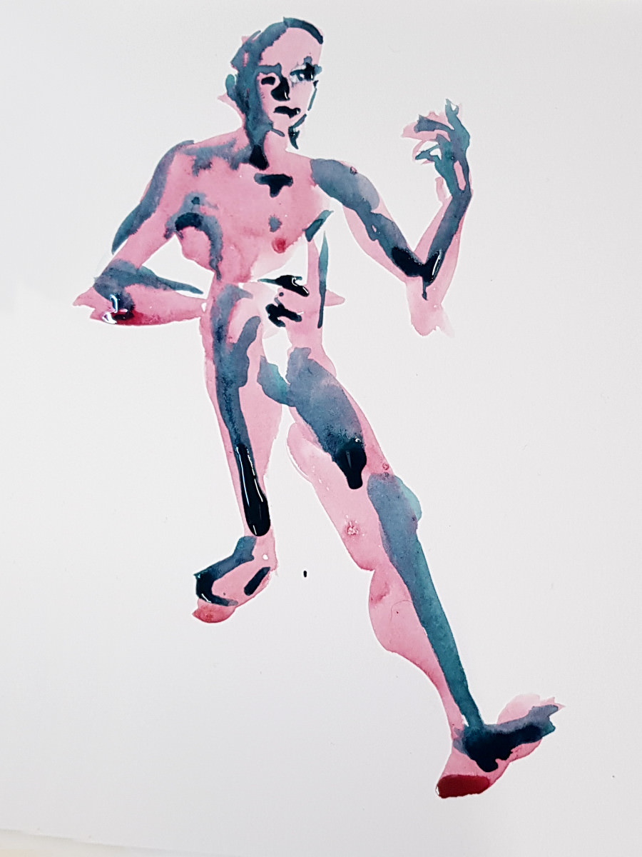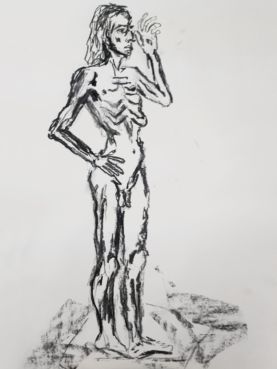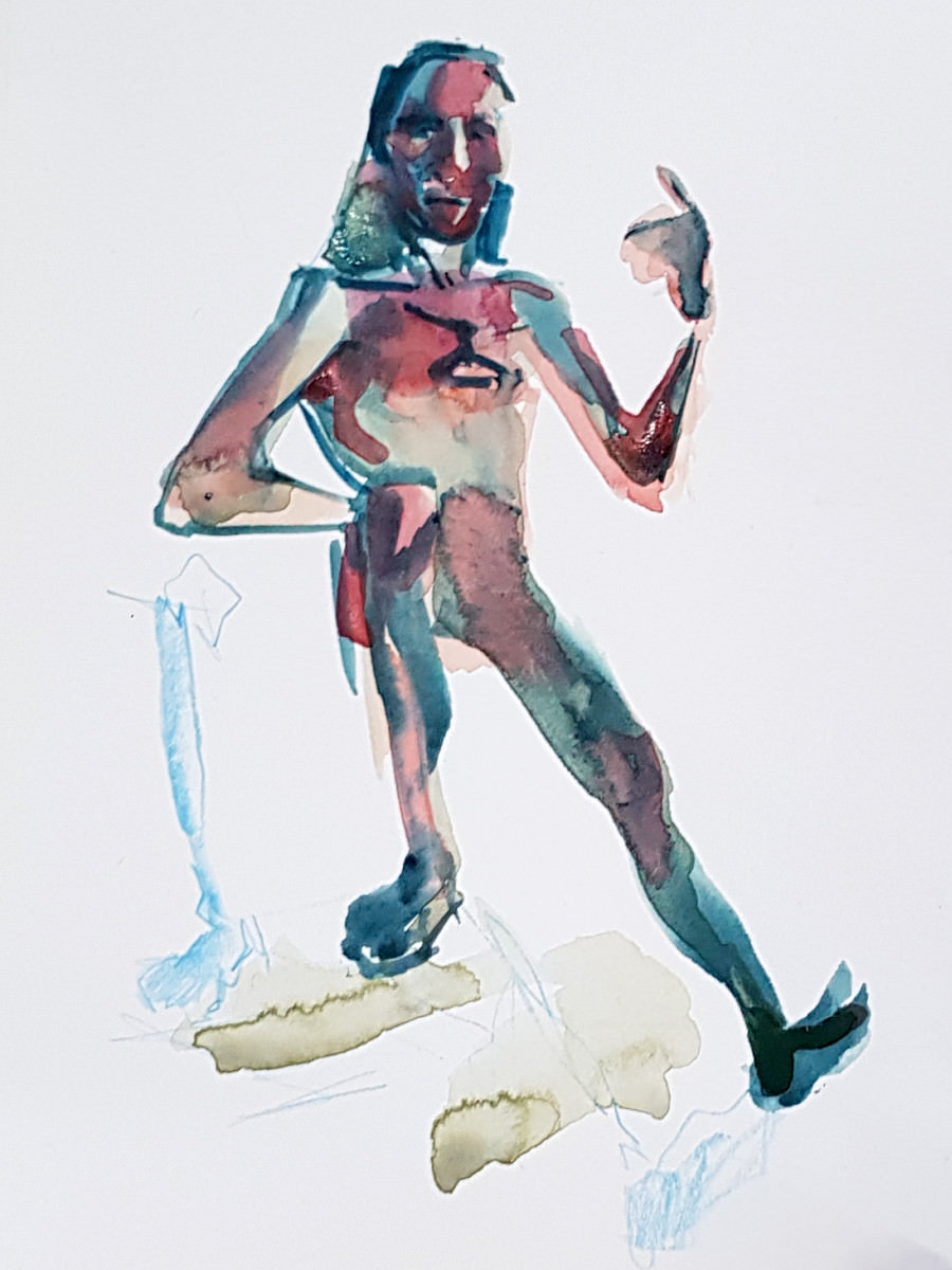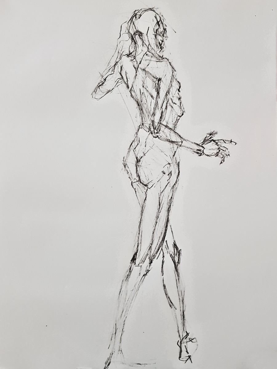 Many artists left during the half-hour between each session, but also a steady flow of newcomers arrived. Tutor Andrea Voisey asked me to start with an 8-minute pose to allow time for everyone to settle. Next, a 2-minute pose while she provided a demo.