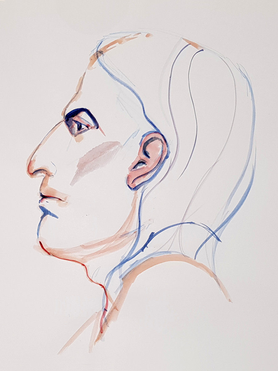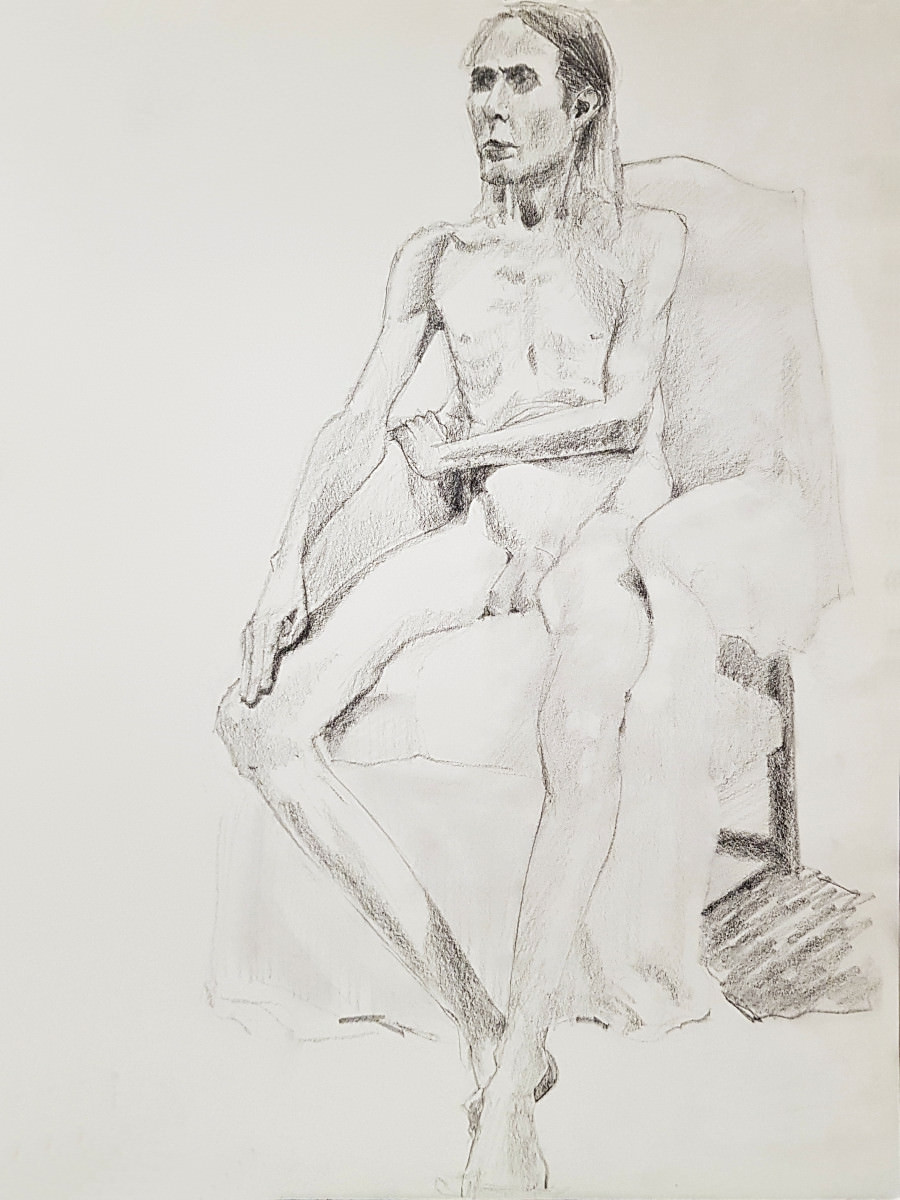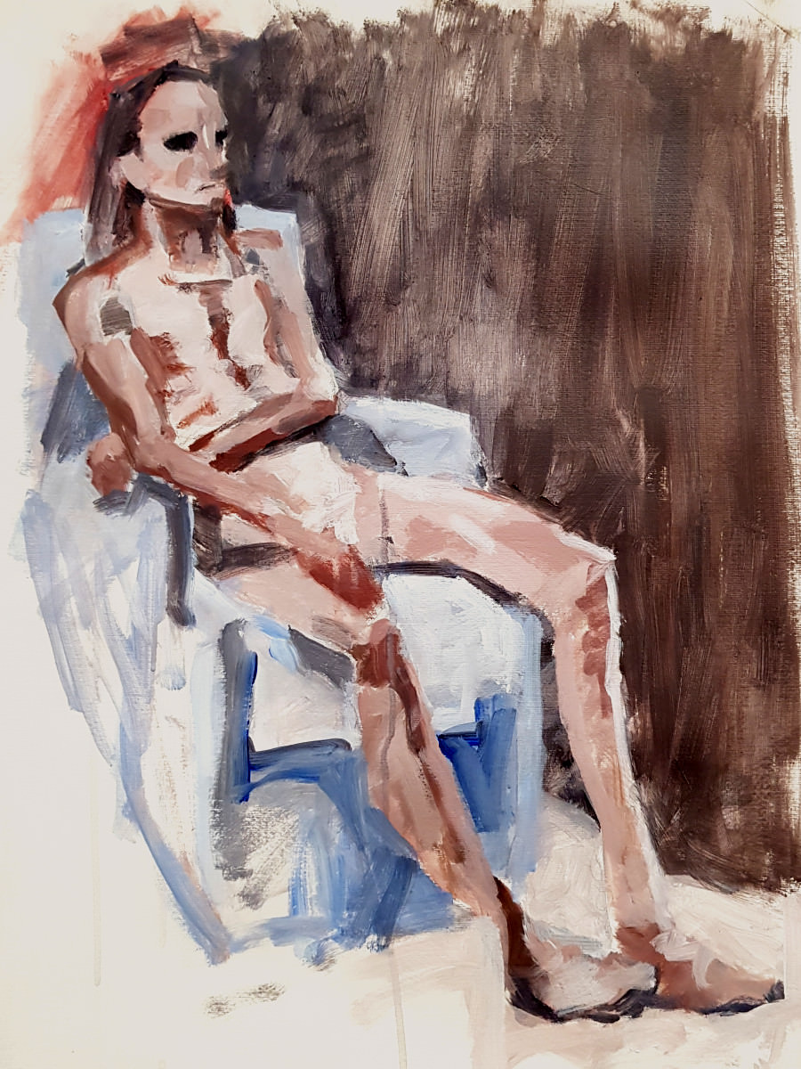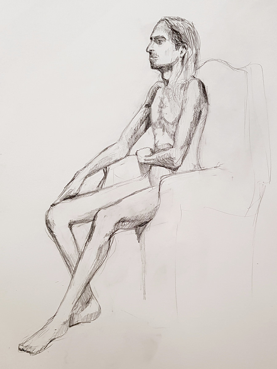 With all these mitigations in place I settled into the armchair. My body was at a gentle tilt and my arms suitably arranged to ease any muscle burdens from my troubled ribs. Thus set, we commenced. Artists toiled at their easels while I sat comfortably enough to need only one stretch-break in the whole 100 minutes. That counts as success.