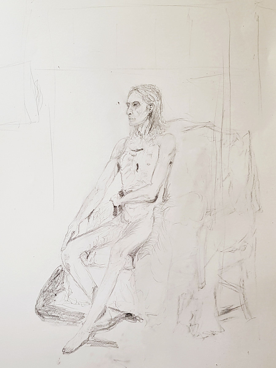 Tutor Victoria Rance provided an armchair for the pose platform, with a blanket over its back and around its sides for an extra warming, cocooning effect. Not much extra, it has to be said, but every little helps. More significantly no fewer than five heaters of various types were organised into an arc at the exposed front of me.