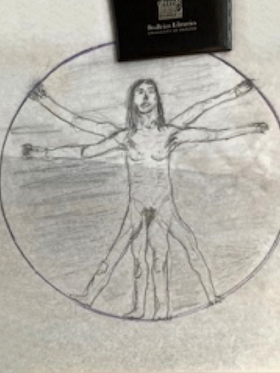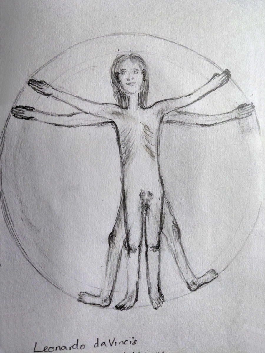Vitruvian Man. The drawing by Leonardo da Vinci. You know the one, described on Wikipedia as depicting: “a nude man in two overlapping standing positions, inscribed within a circle and a square“. Well, for this online session run by Joanna McCormick the time had come for me to be that man.