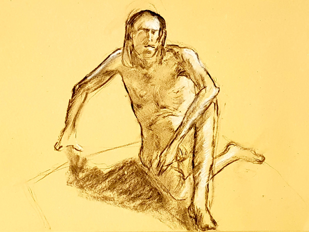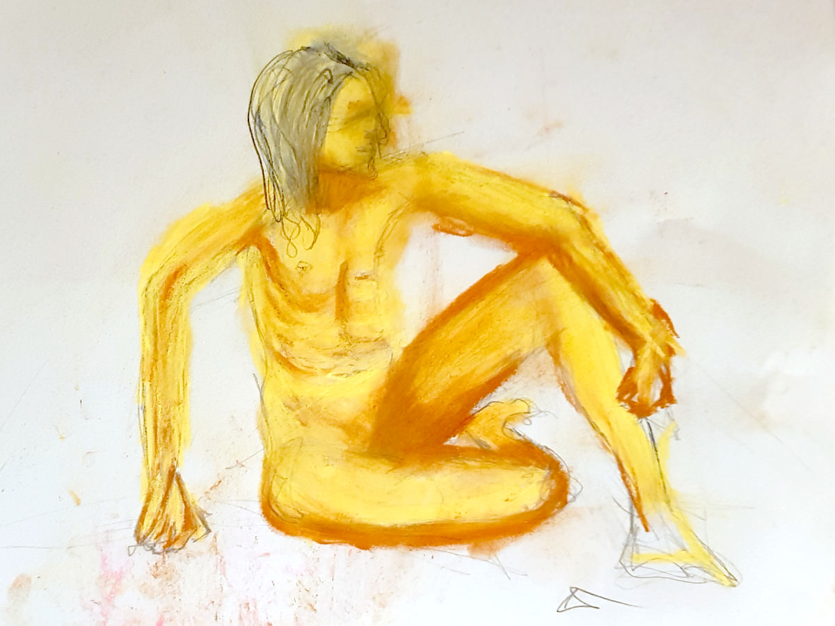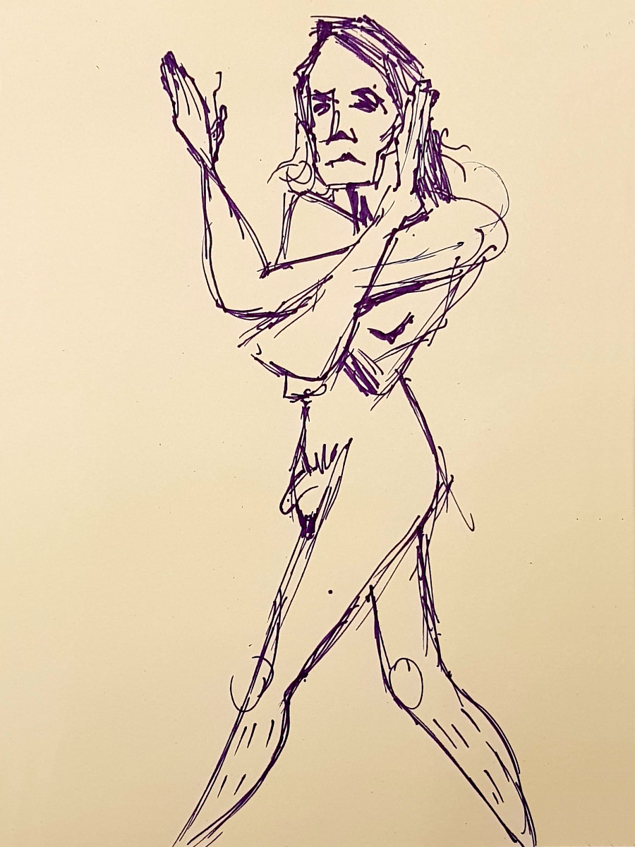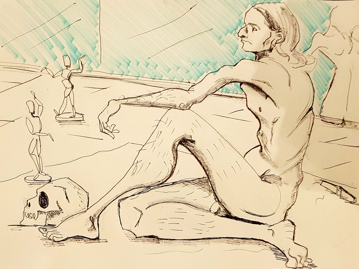 We were in the Picturehouse’s Community Space, not in front of the silver screen but in front of a whole wall of mirrors. It was my first time modelling for this group, and my first meeting with its organiser, fellow life model ‘Fat Meg‘. As requested, I’d sent Meg some photos for promo material, from which one of me holding a wooden mannequin figure – taken during a ‘How to Draw‘ session at The Conservatoire – was used.