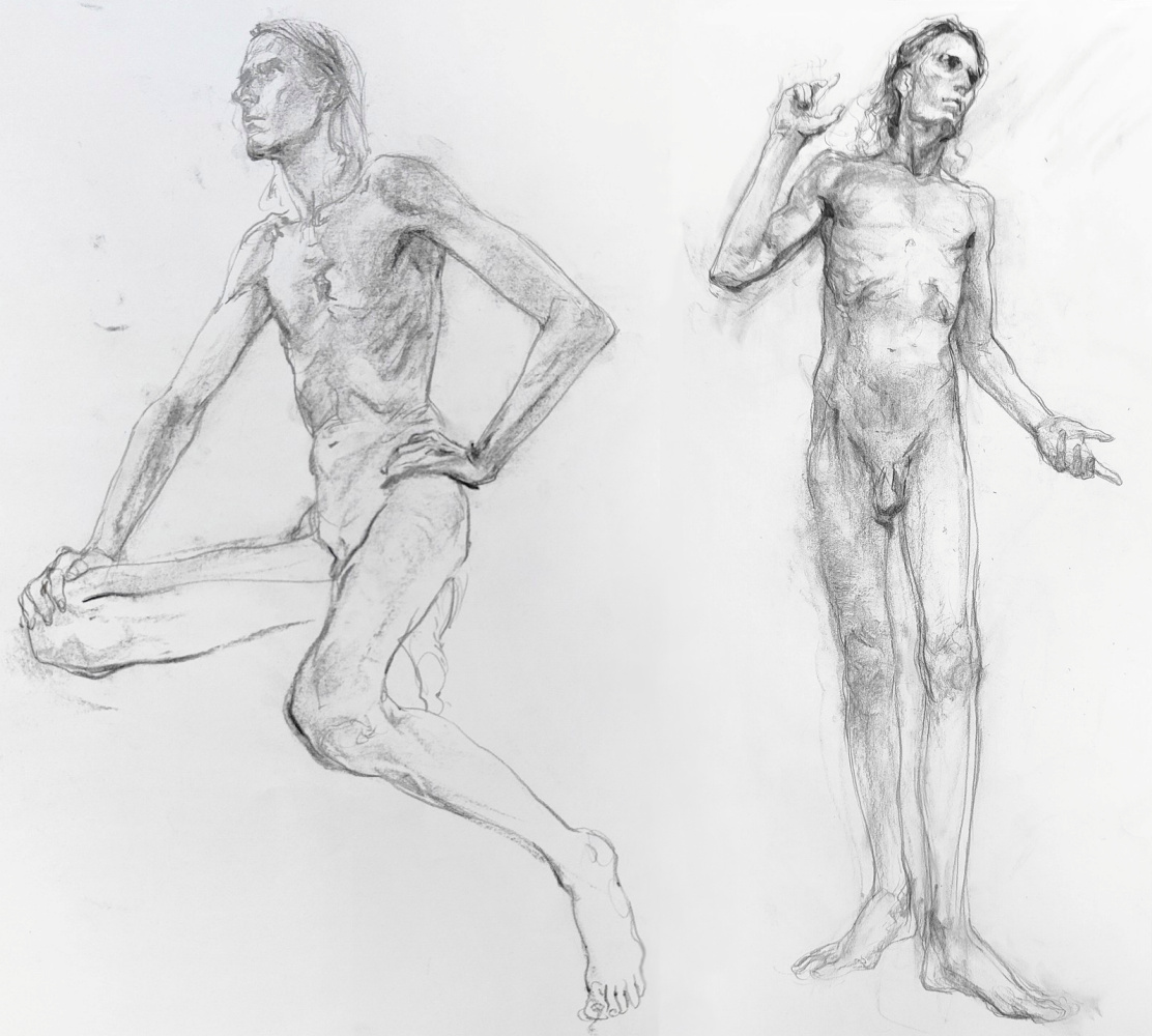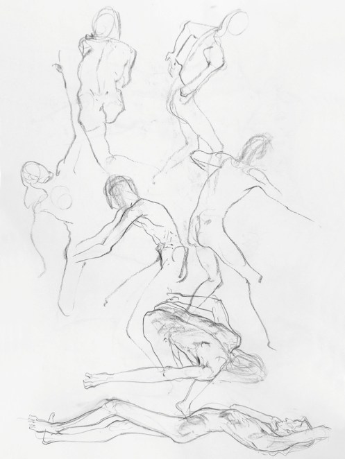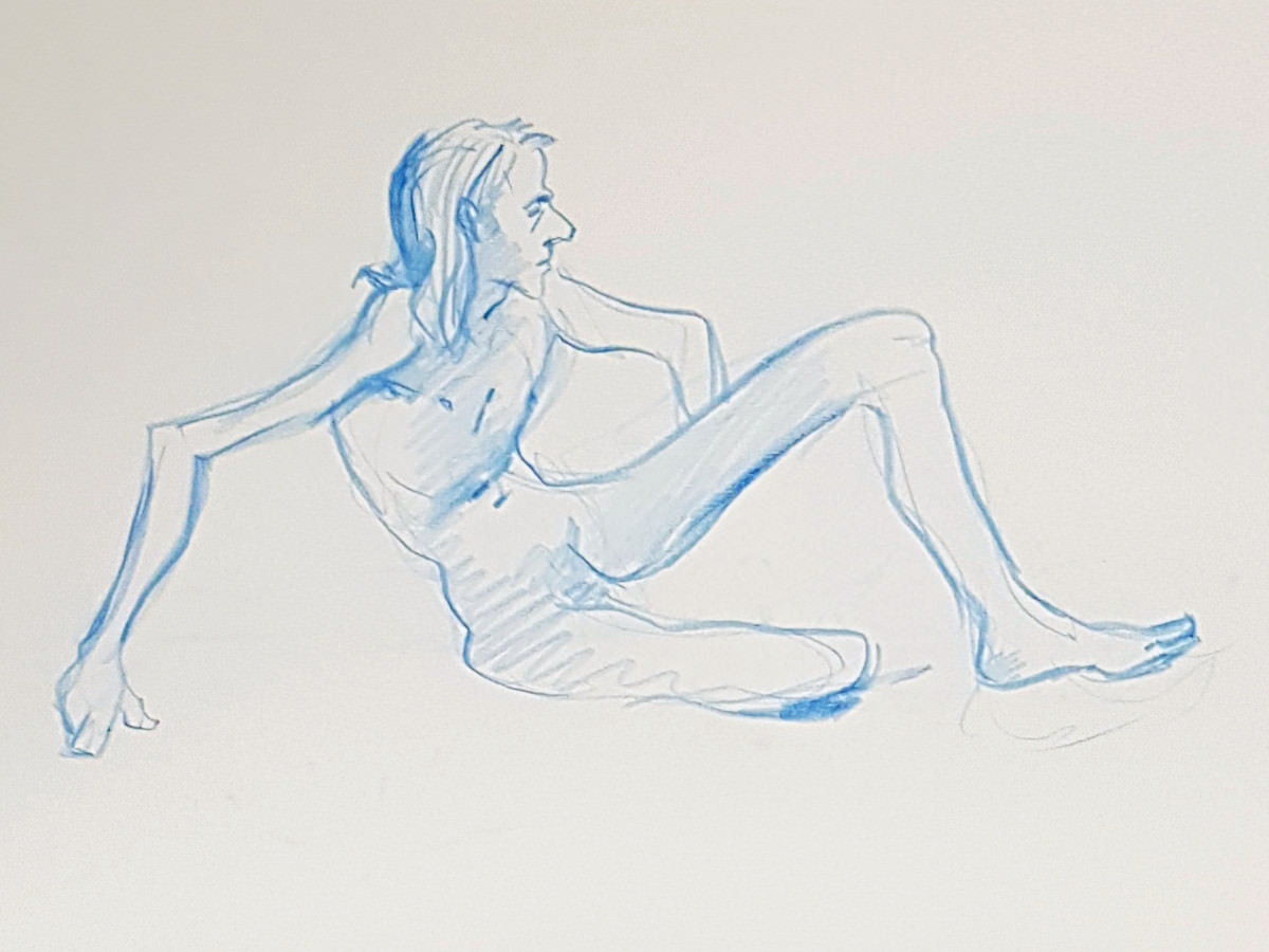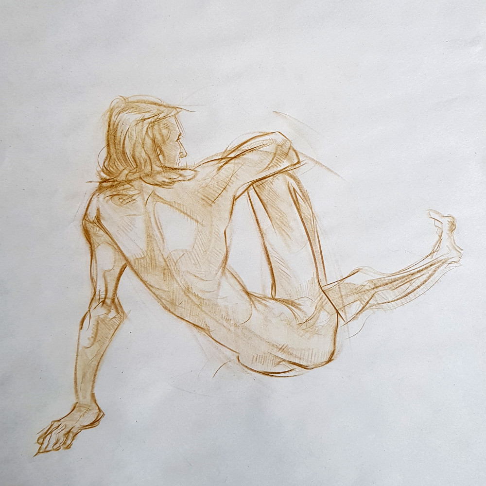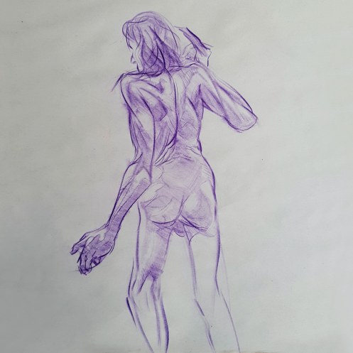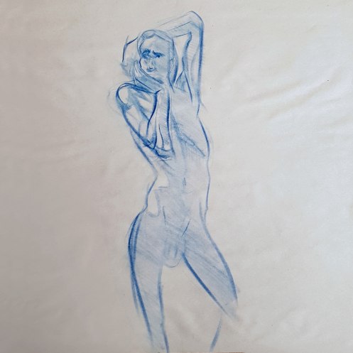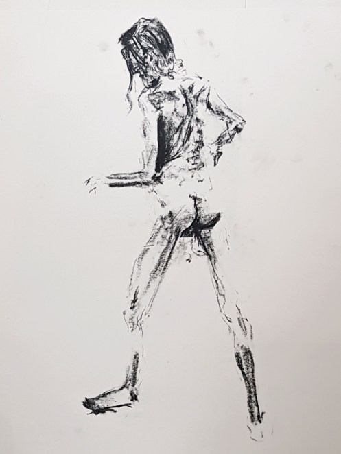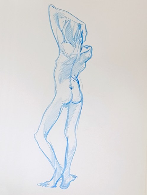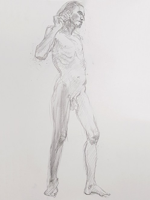 I’ve probably said before but it’s worth saying again: on a long pose, make the period before the first break last as long as possible. The reason? We relax when creating a new pose, but we must tense our muscles to recreate it – it’s not possible to relax the same way twice. I had one more arm-stretch before the session reached its end. And then: the artworks… such wonderful drawings! A particularly rewarding session.