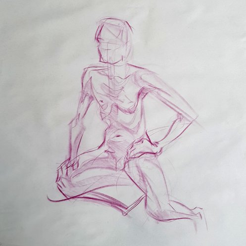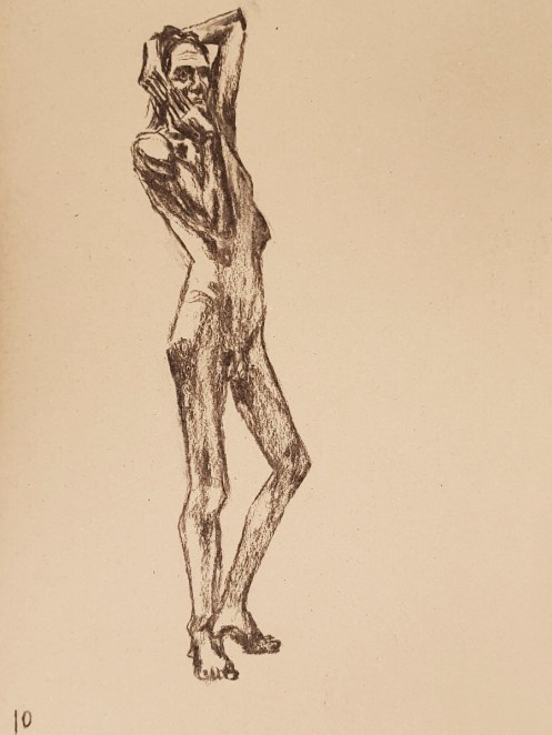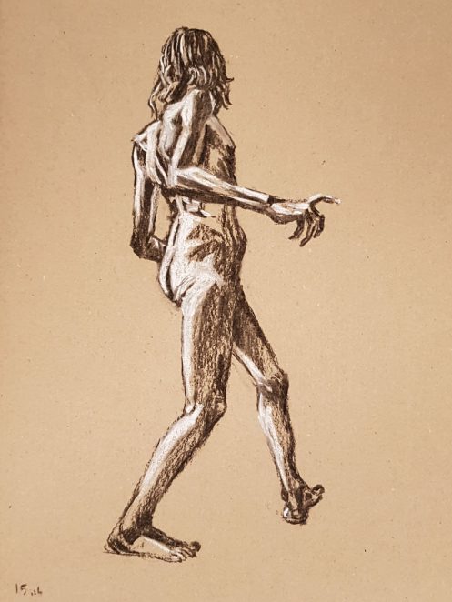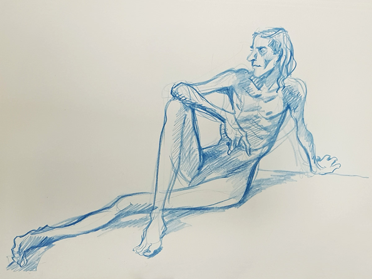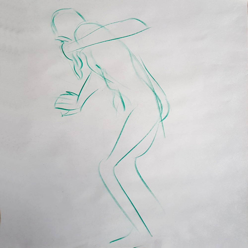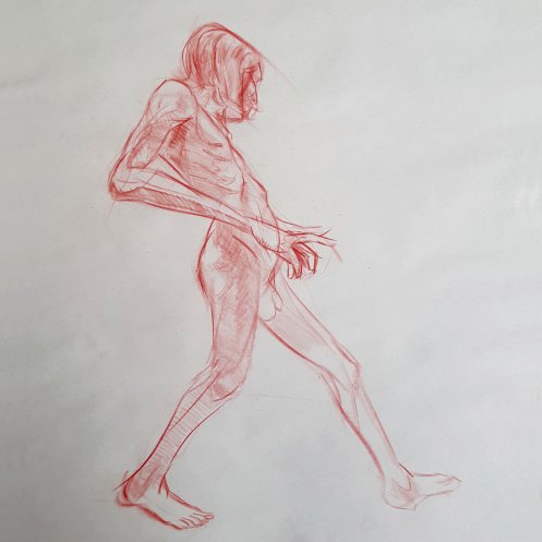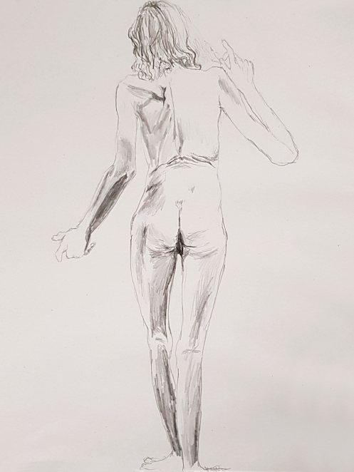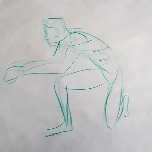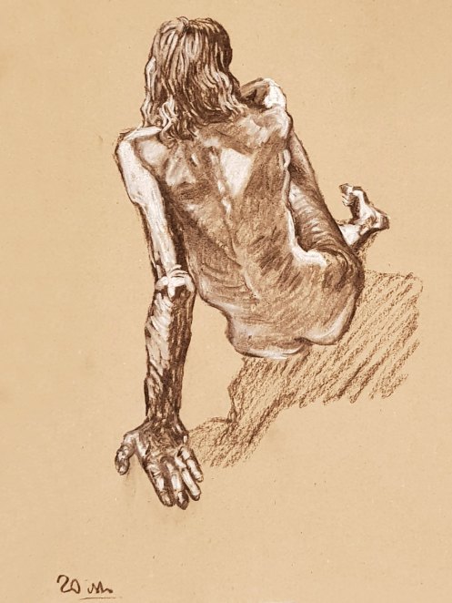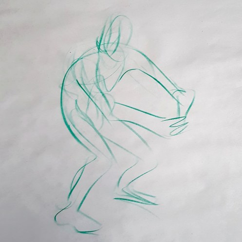I’ve probably said before but it’s worth saying again: on a long pose, make the period before the first break last as long as possible. The reason? We relax when creating a new pose, but we must tense our muscles to recreate it – it’s not possible to relax the same way twice. I had one more arm-stretch before the session reached its end. And then: the artworks… such wonderful drawings! A particularly rewarding session.