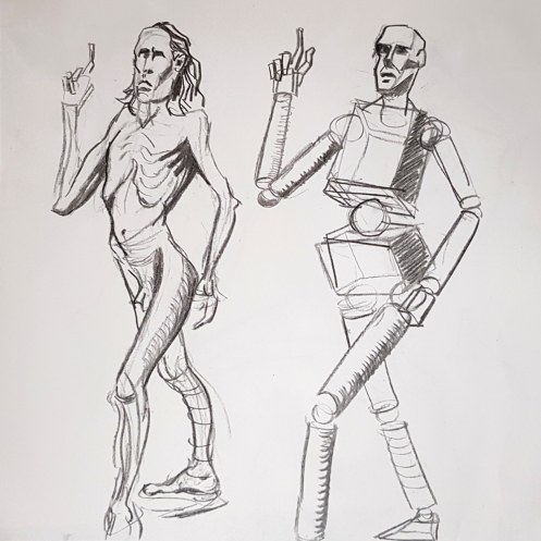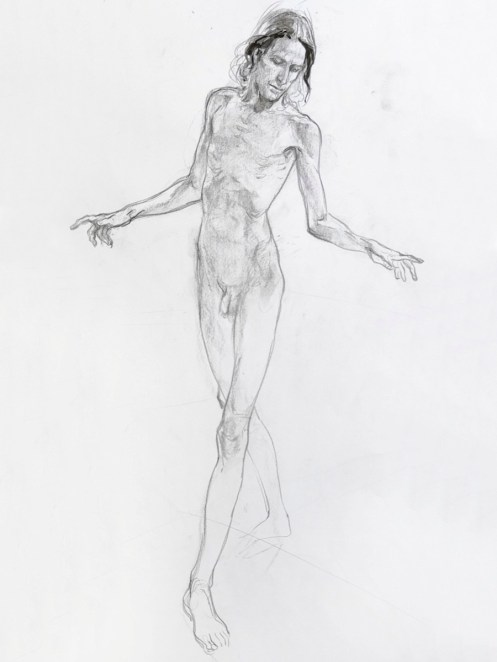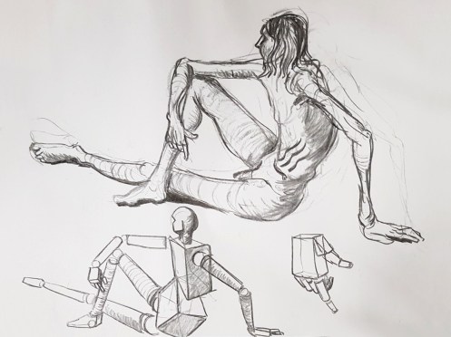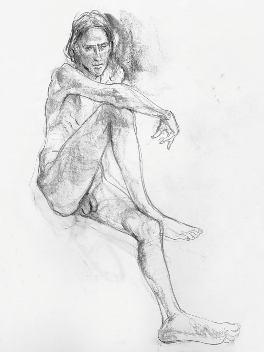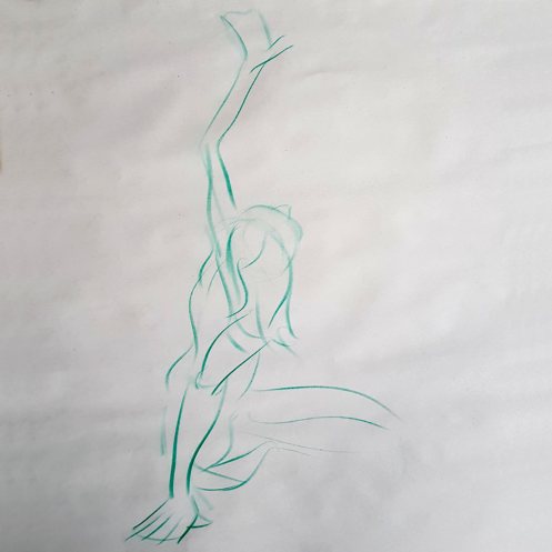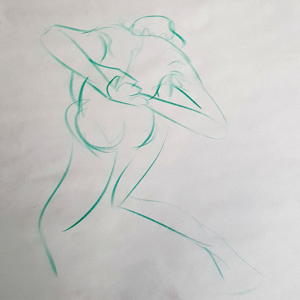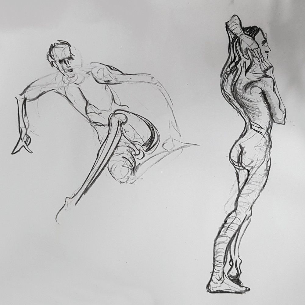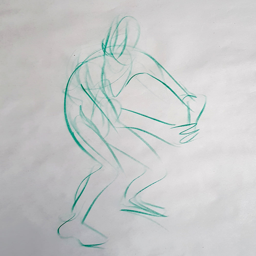 I’ve probably said before but it’s worth saying again: on a long pose, make the period before the first break last as long as possible. The reason? We relax when creating a new pose, but we must tense our muscles to recreate it – it’s not possible to relax the same way twice. I had one more arm-stretch before the session reached its end. And then: the artworks… such wonderful drawings! A particularly rewarding session.