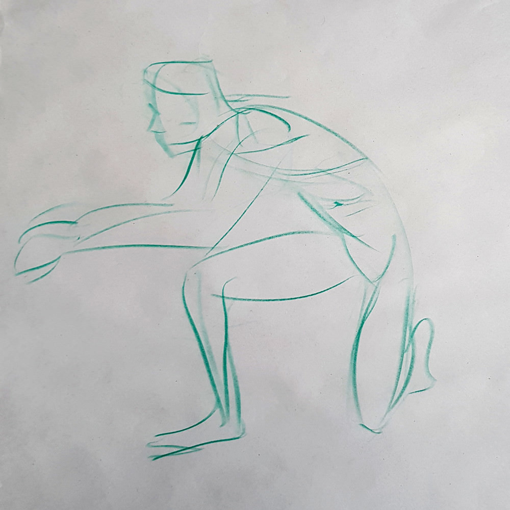 My angular short poses had been well received, so I was asked to provide something similar for the long pose. A pose that can be held for 5 minutes cannot necessarily be held for 95, but with a couch and careful consideration we concocted a compromise. I endured a chilly first 40 minutes up to our break, then repositioned the heaters so our next 50 minutes were tolerable enough for me to agree extending by 5 minutes more. It had been a tough, peculiar gig, but a nice painting justified it… just. 🙂