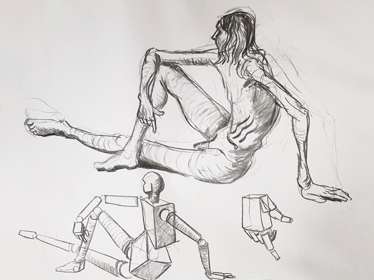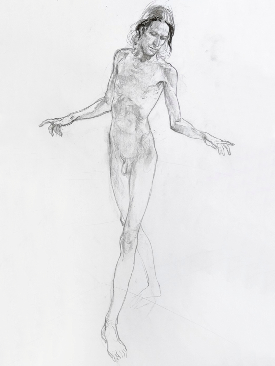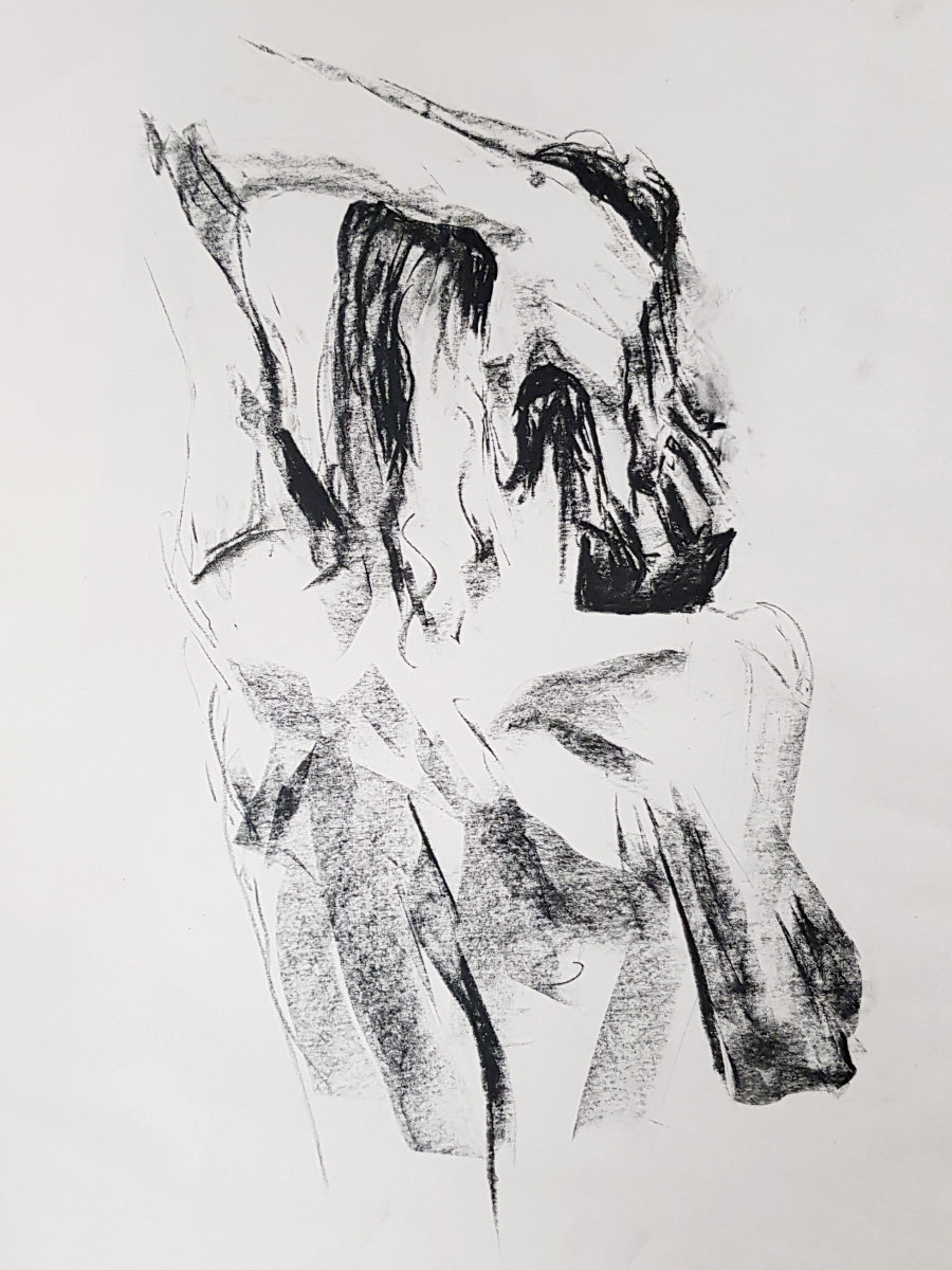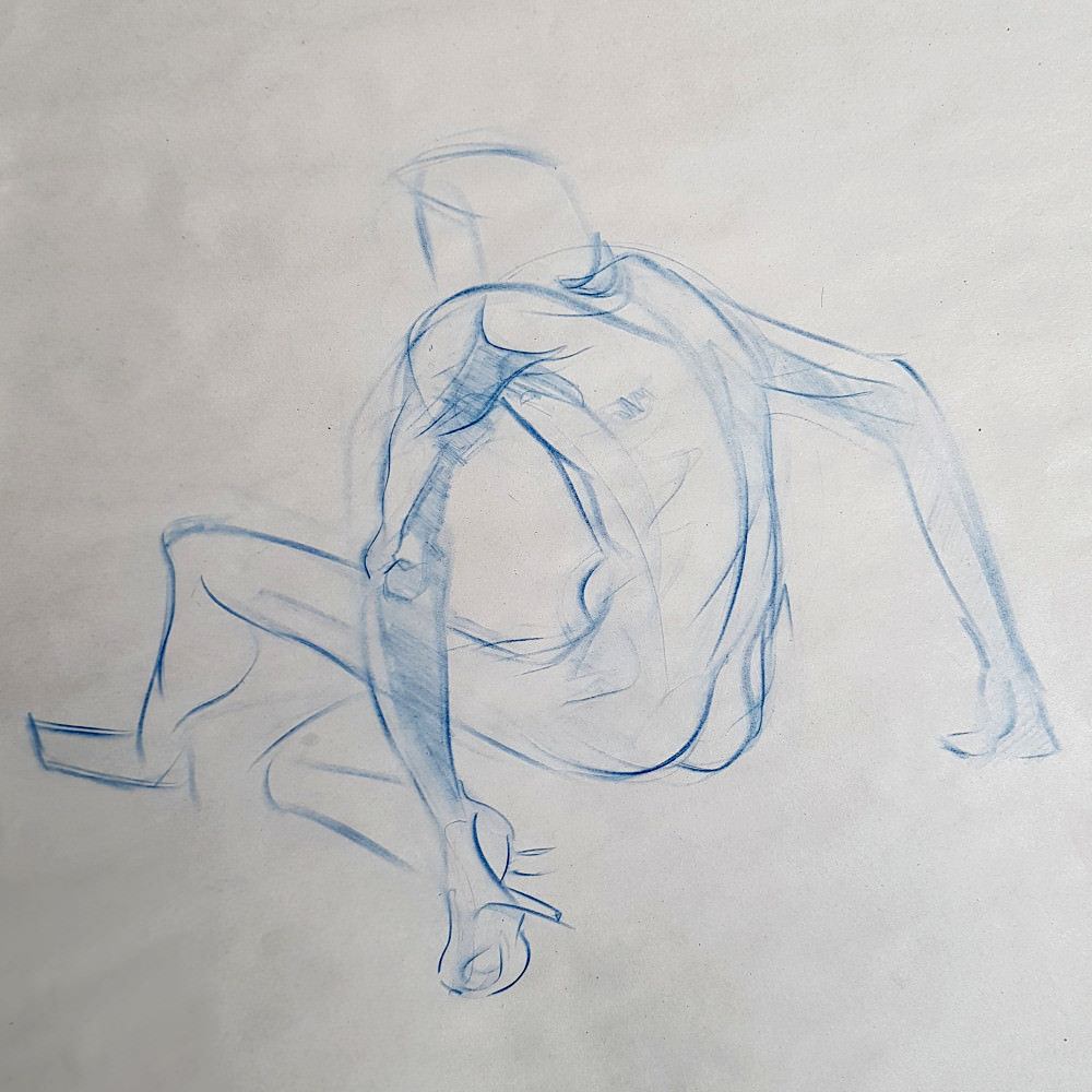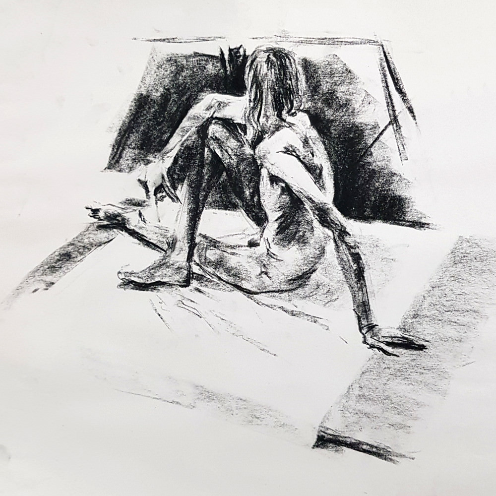 “Clothes back on?” You heard correct. This was group organiser Jennifer’s concept: I would first pose for 5 minutes clothed, then strip off and hold the exact same pose for 5 minutes naked. Artists would draw me nude each time – first from imagination, next from observation – and compare. Great fun: the art of mentally undressing strangers!