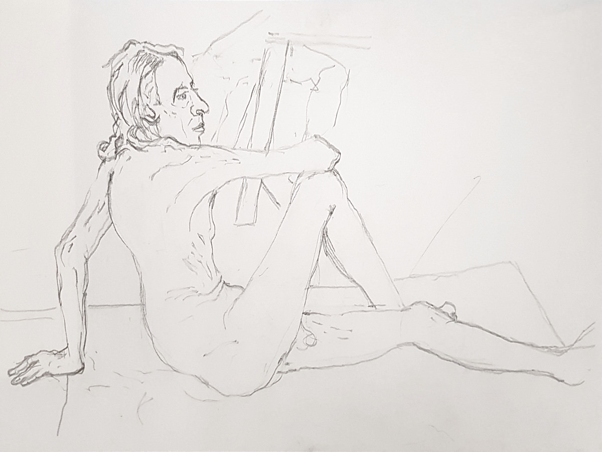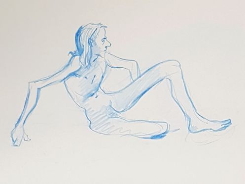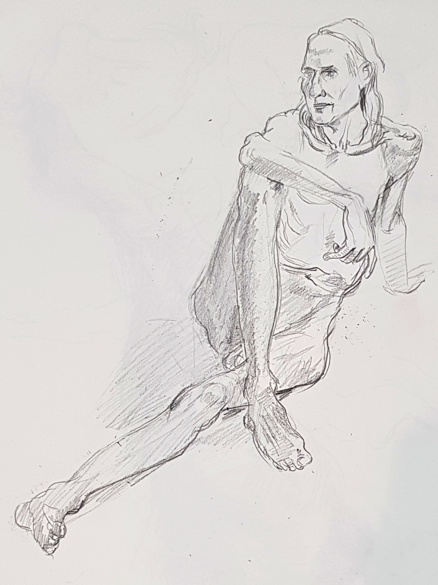Energised by the originality of our dressed/undressed poses, I became careless with subsequent selections and adopted a needlessly uncomfortable kneeling position for the next 12 minutes. When set free from tearing tightness in tendons and toes, I was kinder to myself in choosing a side-saddle seated pose for 12 minutes to our break.