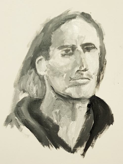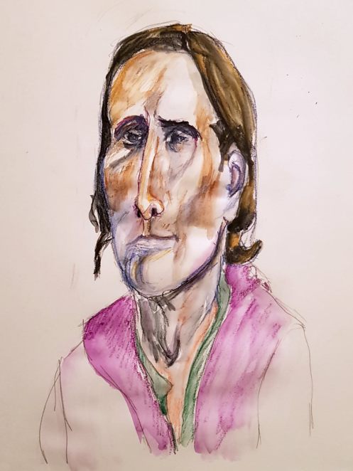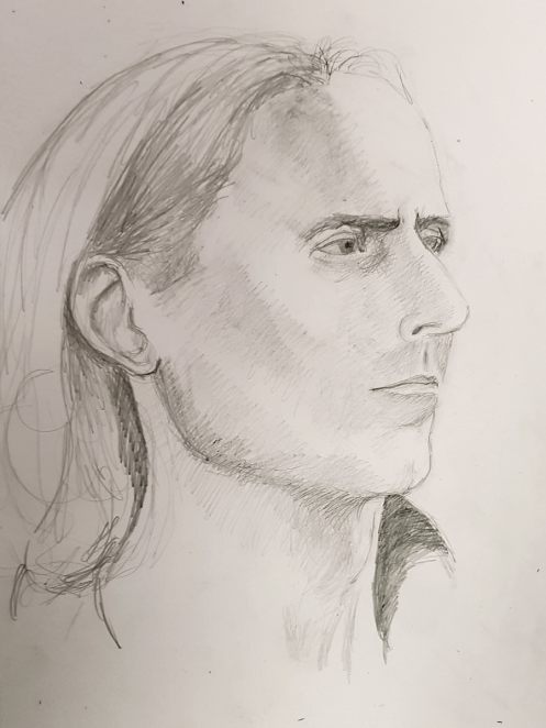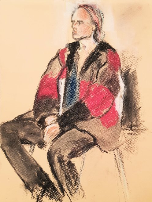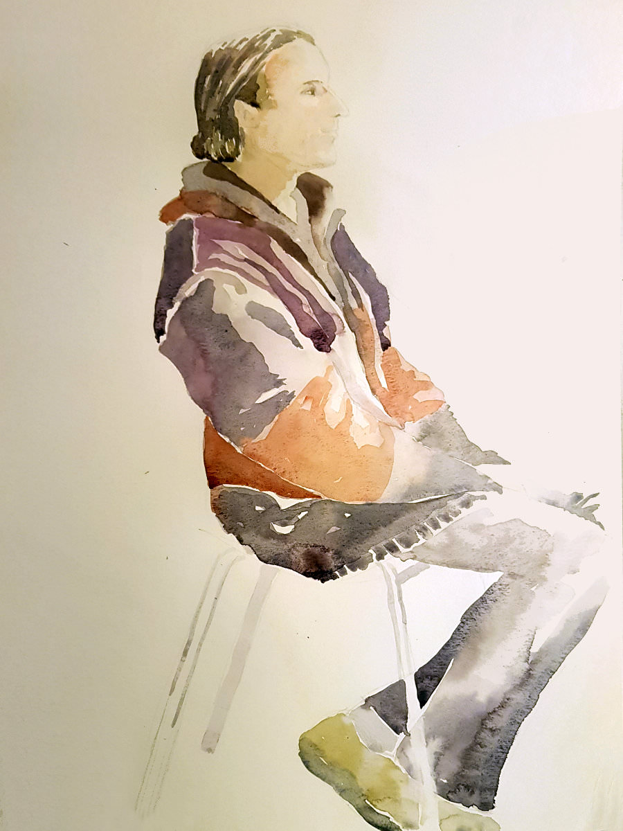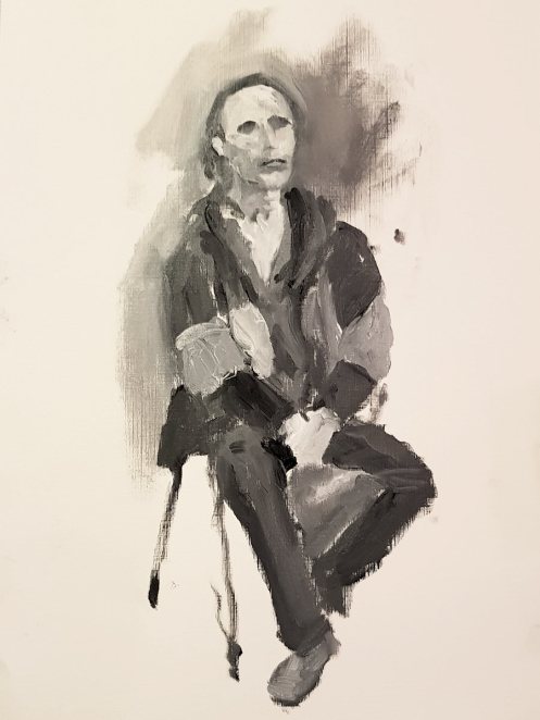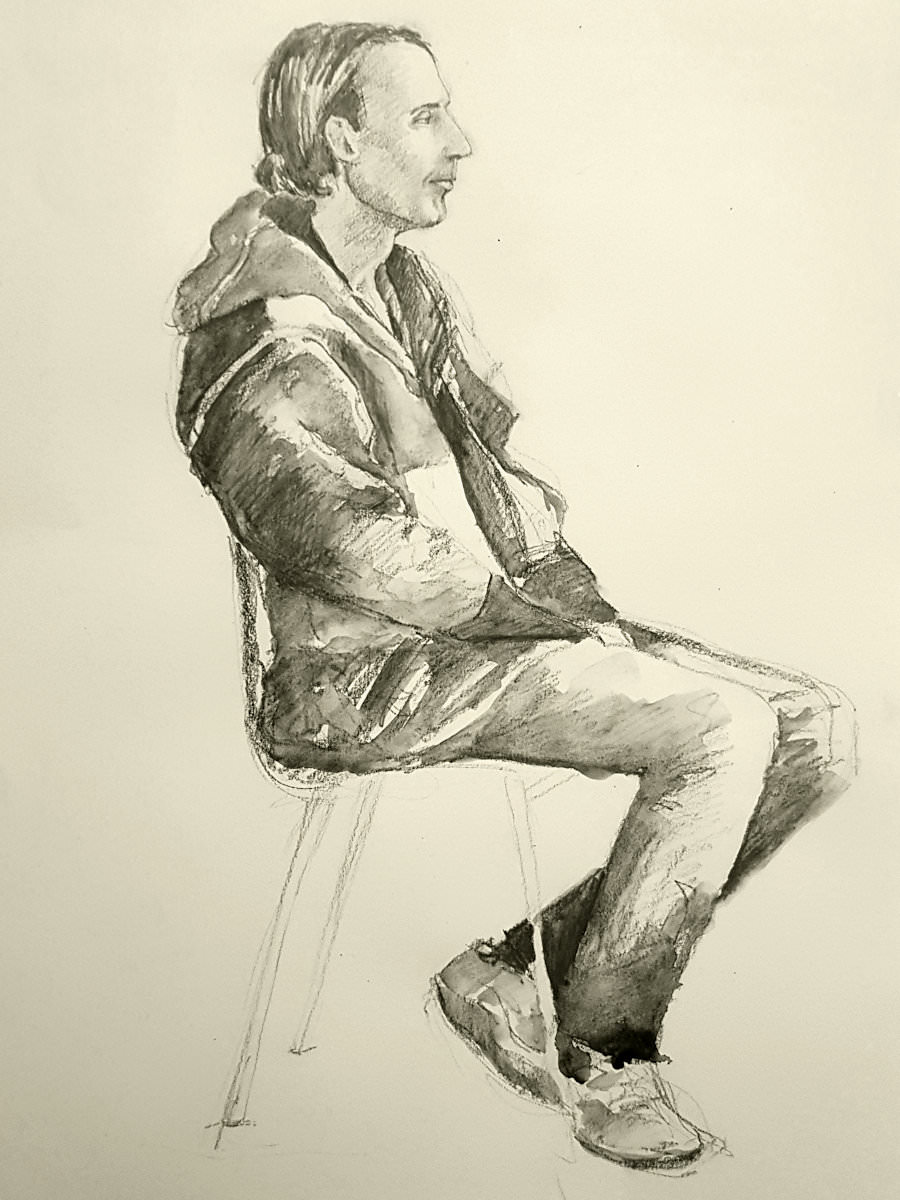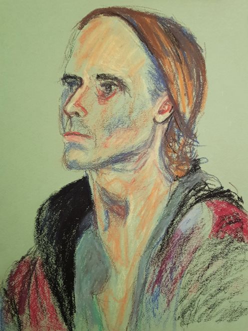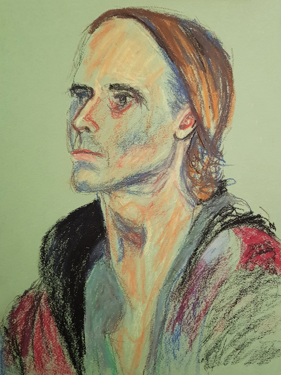This January portrait sitting for The Croydon Art Society started as the offer of a life model booking in September last year. Alas, I wasn’t free for that date; neither could I make their next date in November, but my diary was open for January. It being winter, they thoughtfully reserve this session for clothed posing.