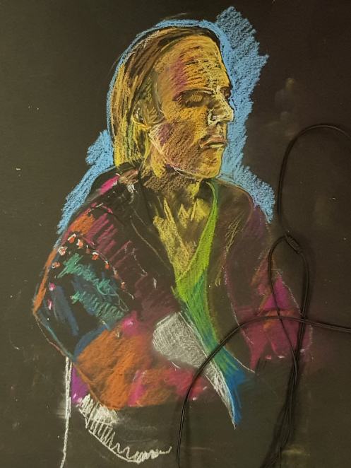 Time never dragged; neither did the notorious soporific effects of portrait posing ever take a hold. Weirdly the third of every seven 20-minute pose periods seemed to race by. K+E on Soundcloud played us through till, at the finish, when the last periods of the last session had at last accelerated away, I turned away from my putty, rose from my comfy chair and… gazed upon the most exquisite drawing of me ever made.