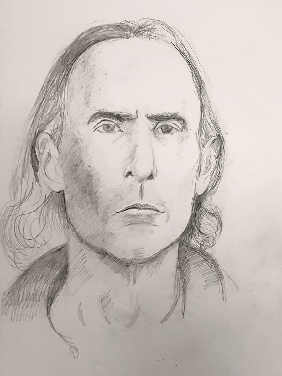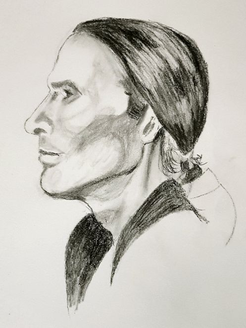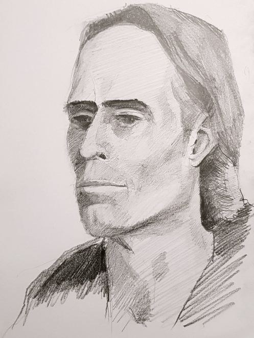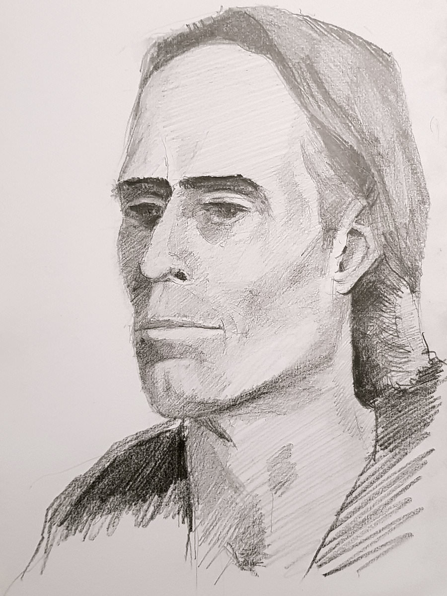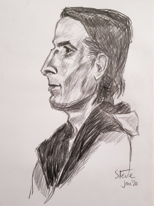After two pleasant evenings life modelling for artists at Hutton Community Centre in June and July last year, I was invited by group organiser Stephanie Mills to pose for portraiture at her home studio. Having beheld the astoundingly fine quality of her art, I needed no encouragement to accept. The intended drawing would be developed over multiple sittings, each one lasting 3 hours. Work commenced on 8 August 2019.