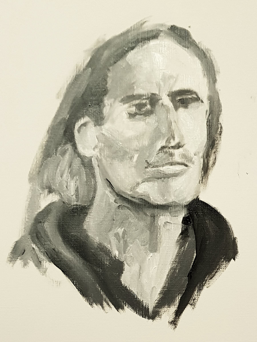 That first session set the pattern for all that followed. I stared at my gaze point on the far wall for seven periods of 20 minutes, with five timed breaks of 5-minutes plus one break of 15-minutes giving us the full 3 hours. Measurements and marks were made, some blocking-in began, and then… nearly five months elapsed. Even art has to wait for the right moments on a long journey. We resumed on 3 January 2020.