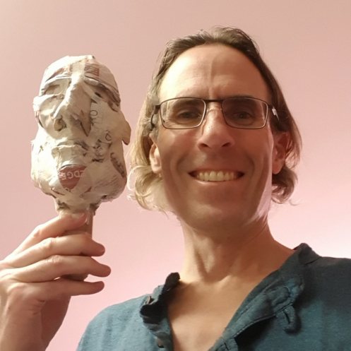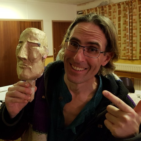 Over the years I’ve been artistically recreated in many styles with diverse media, but this was the first time I’d been fashioned out of papier-mâché. Initially I wasn’t aware what happening and was thus perplexed by sounds of paper tearing and scrunching, but I love my little 3D double – photos at half-time and full-time. Uncannily me!