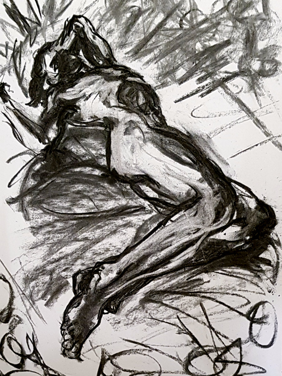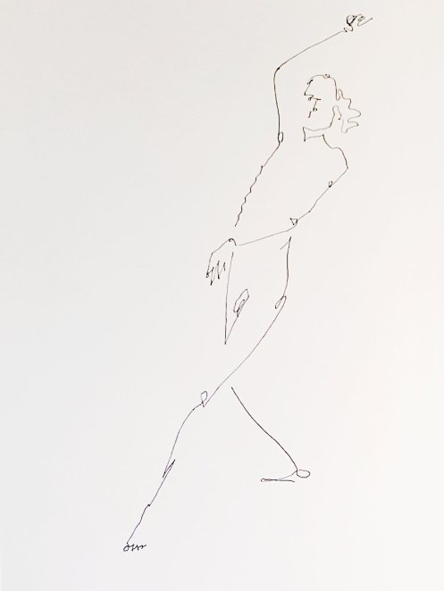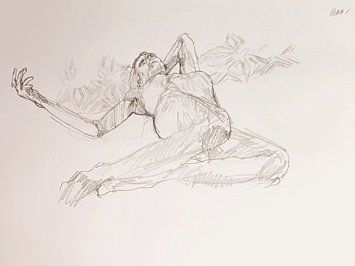 After the opening sequence, two 5-minute poses and two 10-minute poses brought us to an interval, at which point I exchanged my token for a tasty white wine. The session was well attended and exuded positive energy; I gave my dynamic best within an oval of seated artists, while Leo offered just the right measure of encouragement and tips.