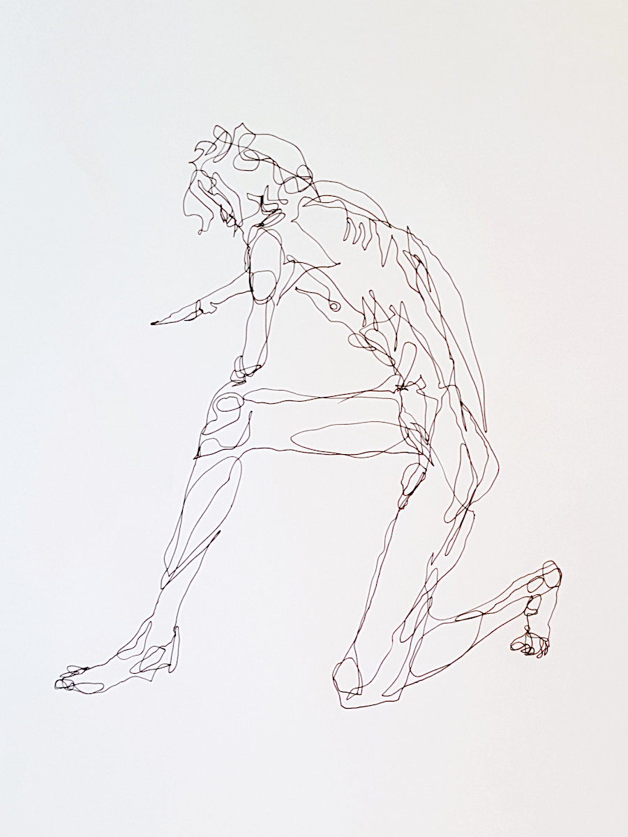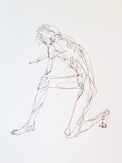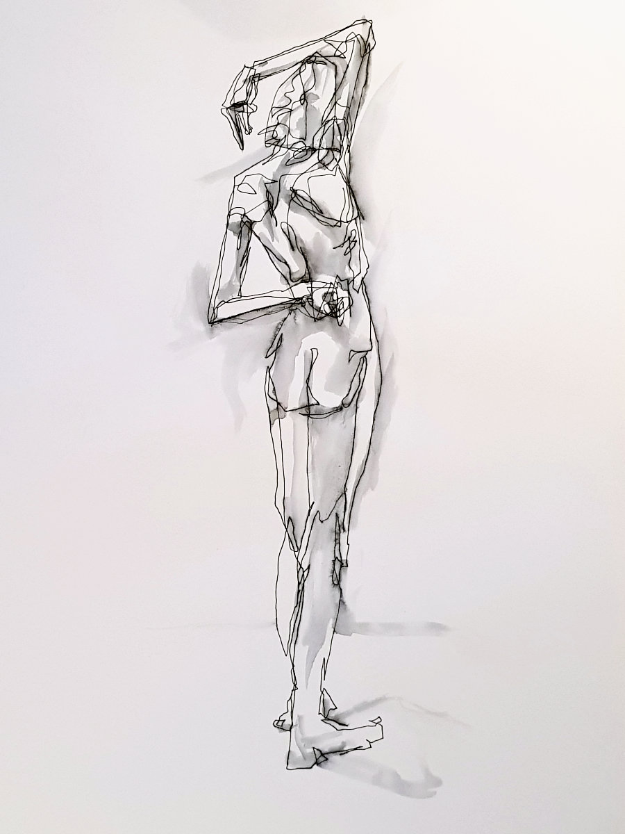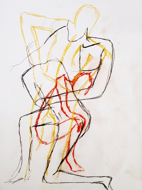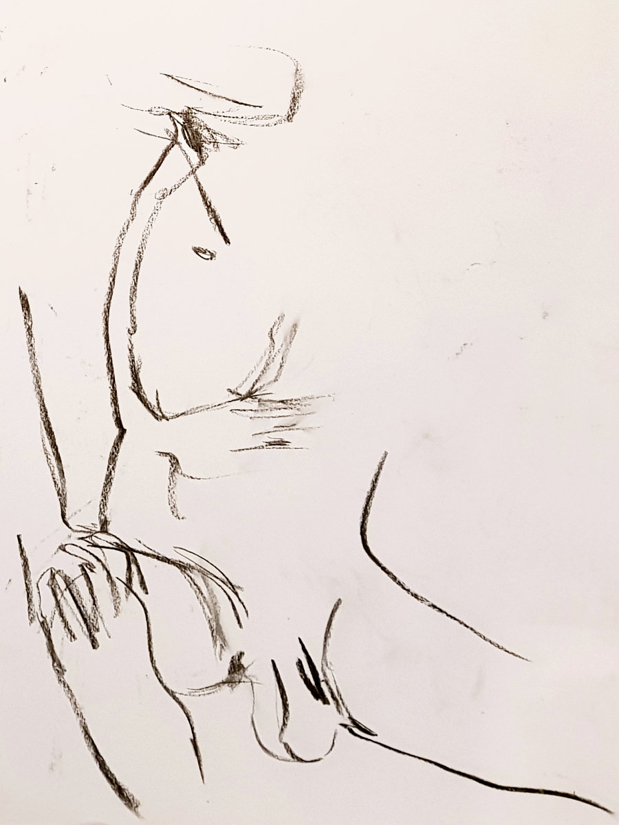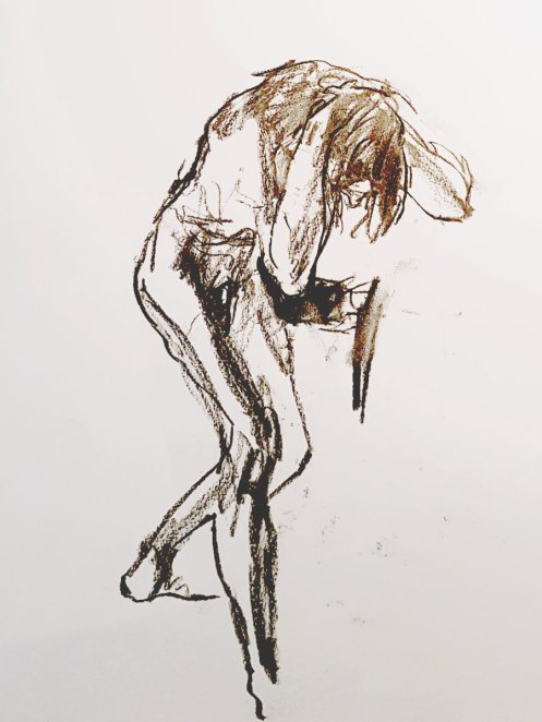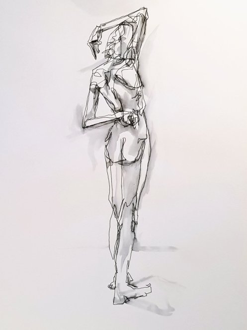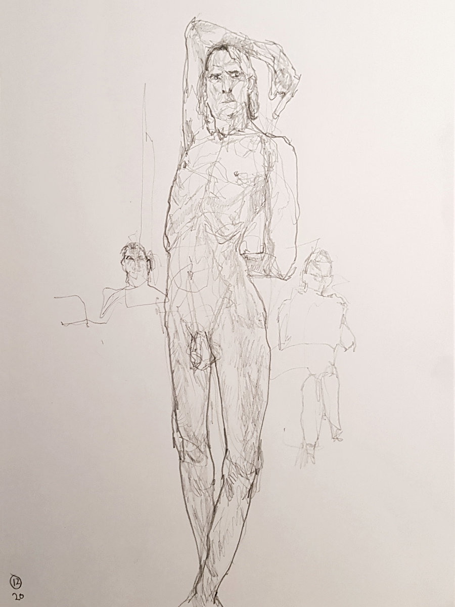 As usual for the restart we had a democratic vote on pose time preferences, with two of 15-minutes winning by a landslide. First I arranged myself onto a low stool with my limbs angled or extended, then completed the session by standing straight with arms bent, hands at the back of my neck and crooked elbows above my head.