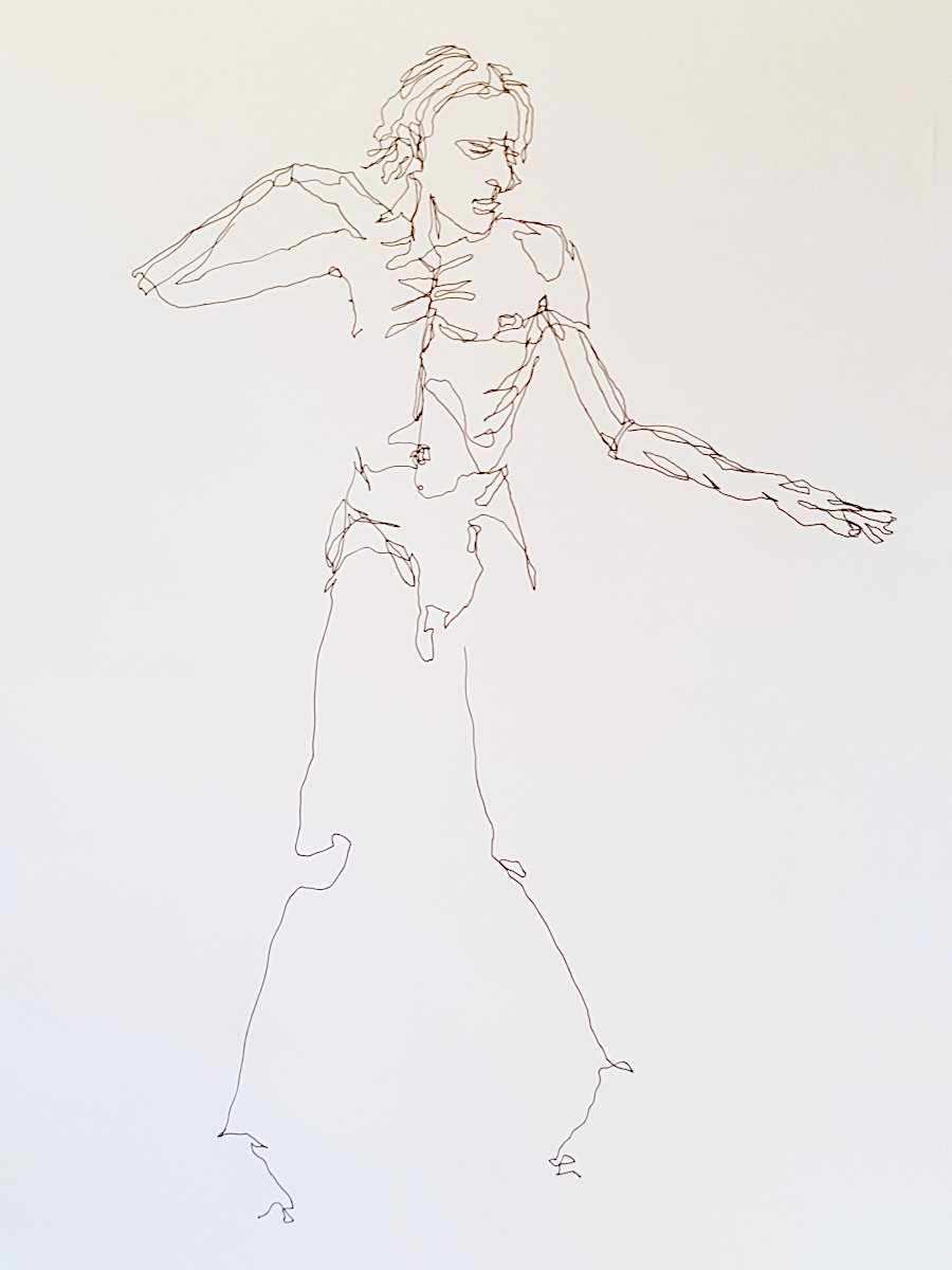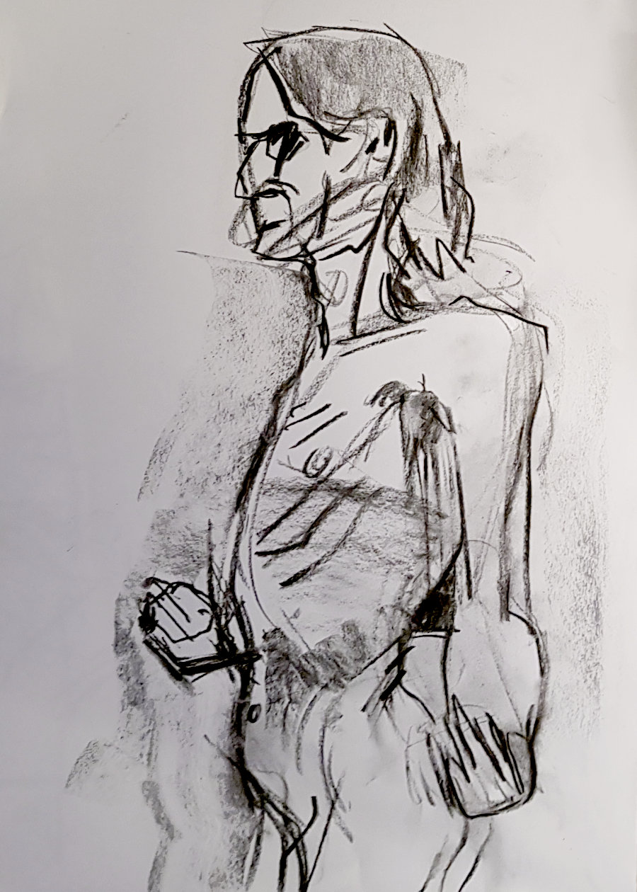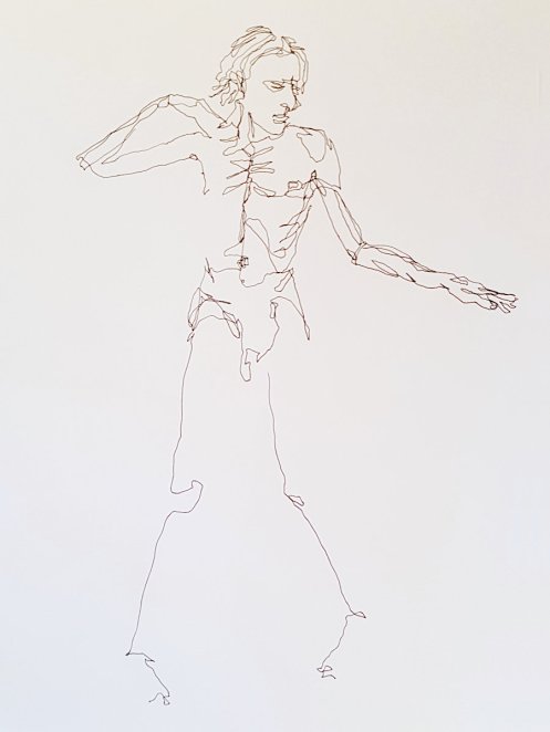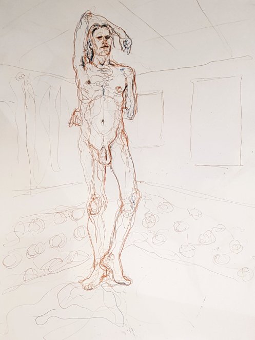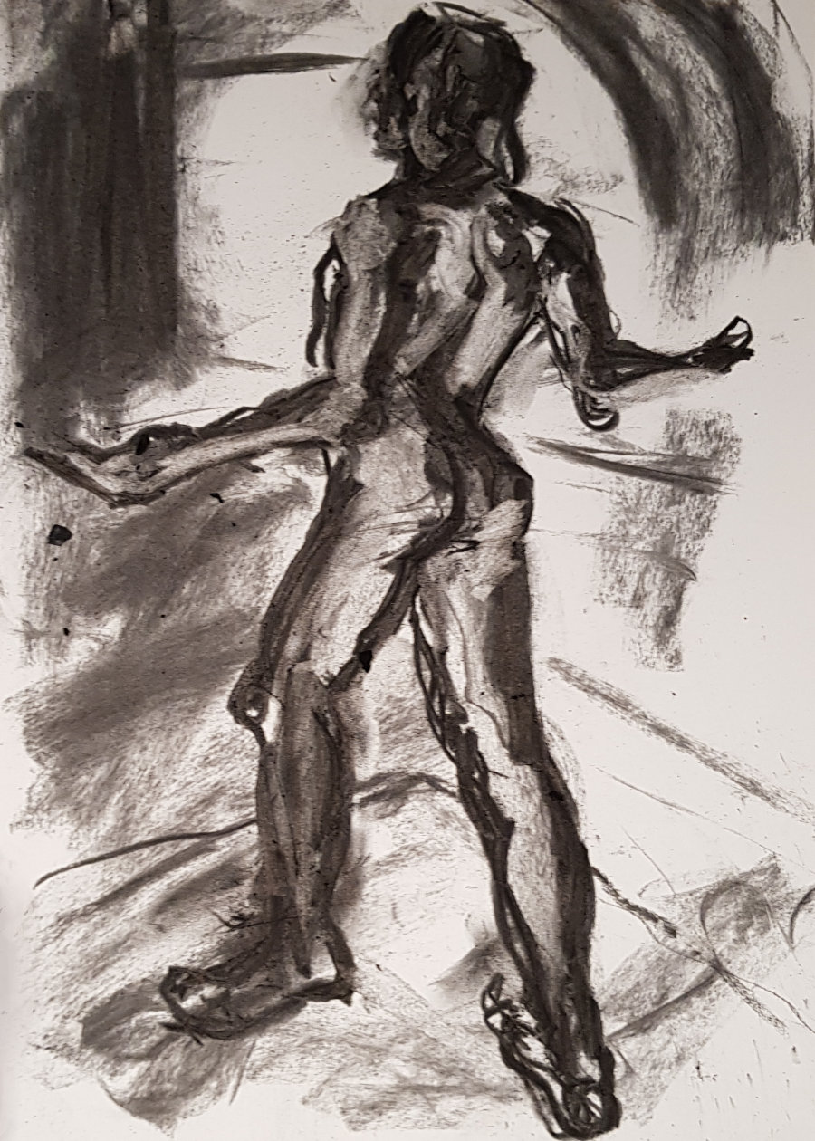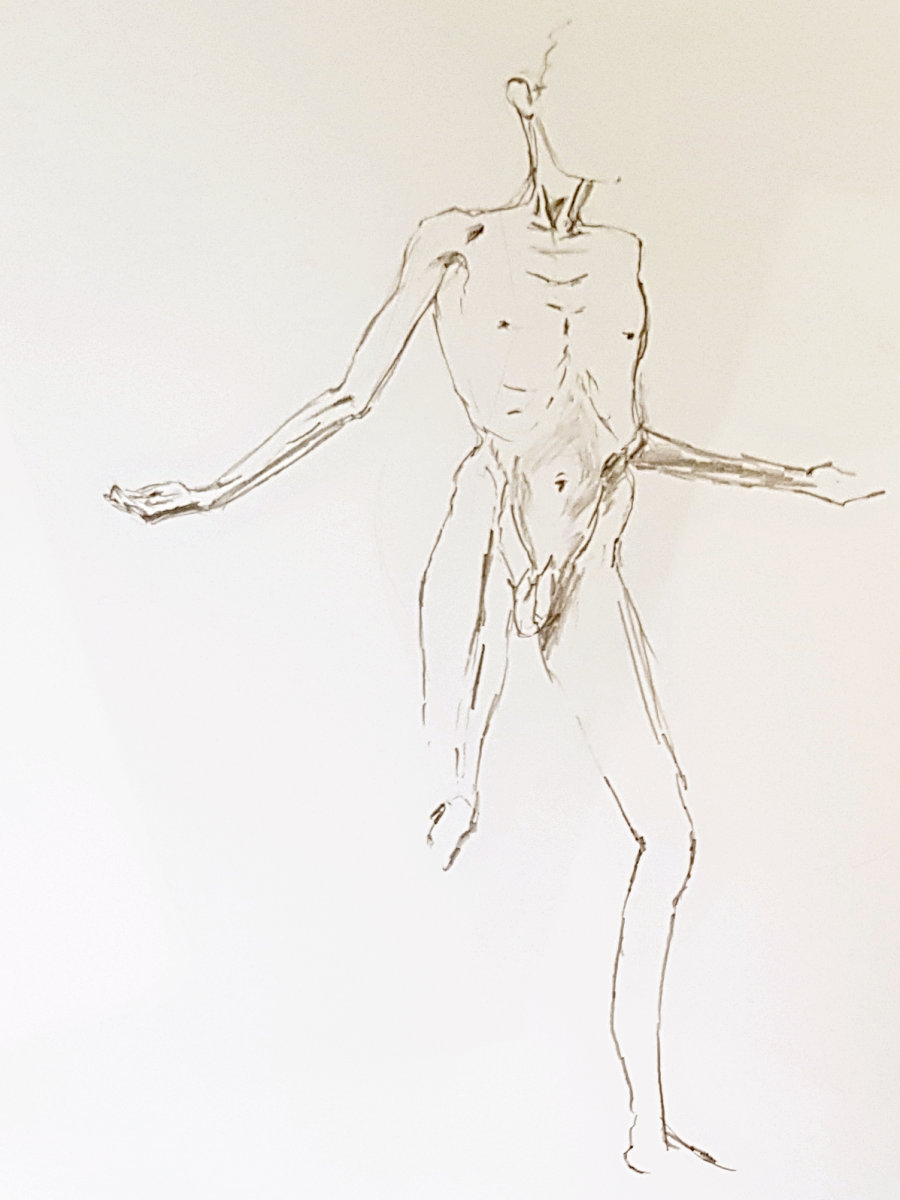 Next the long pose. Whatever stance I chose, I would be living with its consequences for around an hour and three-quarters in total, albeit with breaks. I had no preplanned idea for what I would do, so I let my body discover the pose itself – something simple, evenly balanced, legs very slightly bent and arms making subtle gestures.