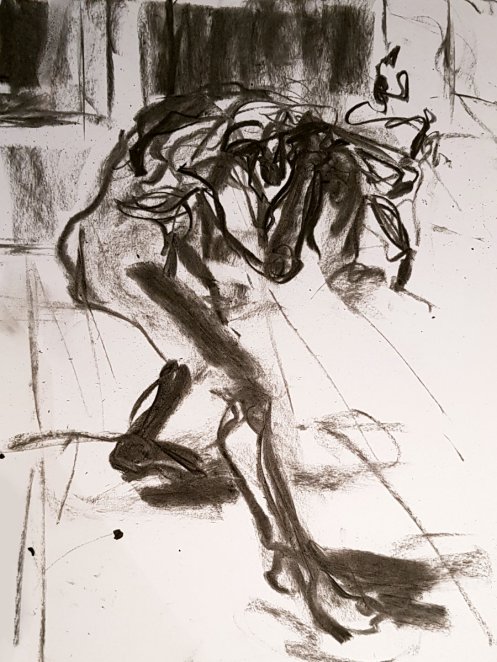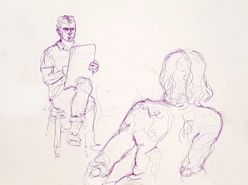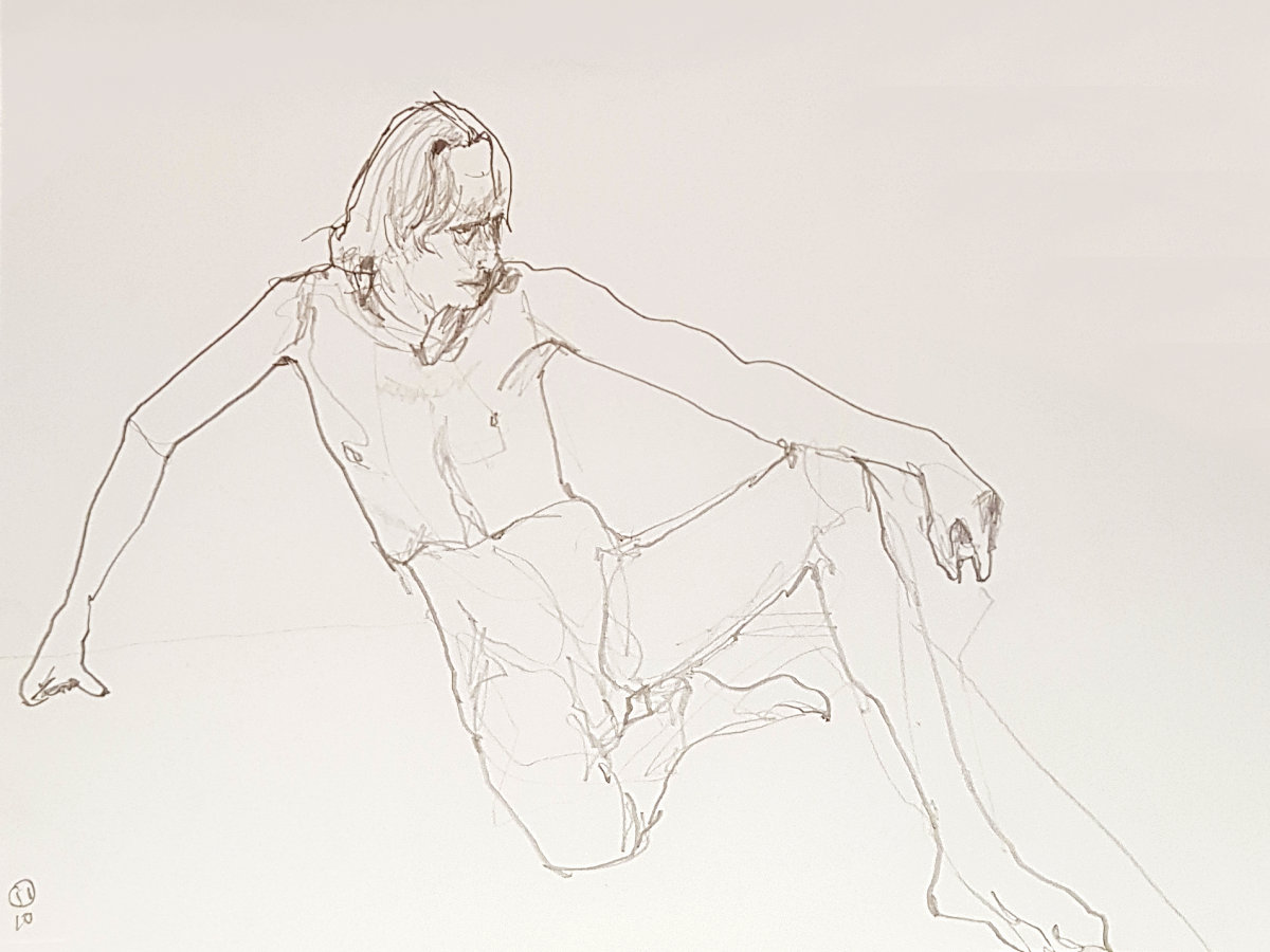 Natansky arrived at the interval, just in time to take on tea-making duties and lavishly distribute the biscuits. I harvested more than my fair share whilst chatting with artists. When all were ready to resume, the undisputed consensus was to finish with a brace of 20-minute poses. I configured myself into an awkward shape for the first of these.