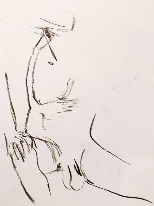 The second half’s effort was comprised of three 15-minute poses, then we were done. Group organiser Tatiana Moressoni encouraged all those present to spread a few of their artworks on the floor, and collectively we marvelled at some superb efforts. Best of all was the generous thanks given by so many of the artists present, with one chap even saying I was his favourite model to draw. Repeating those words here must look like terrible vanity, but truly I never imagine myself that well regarded. It’s very special.