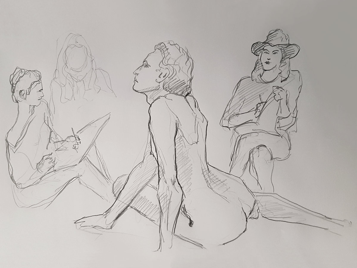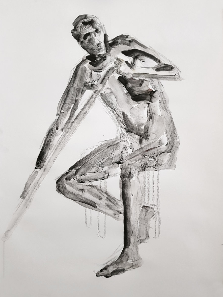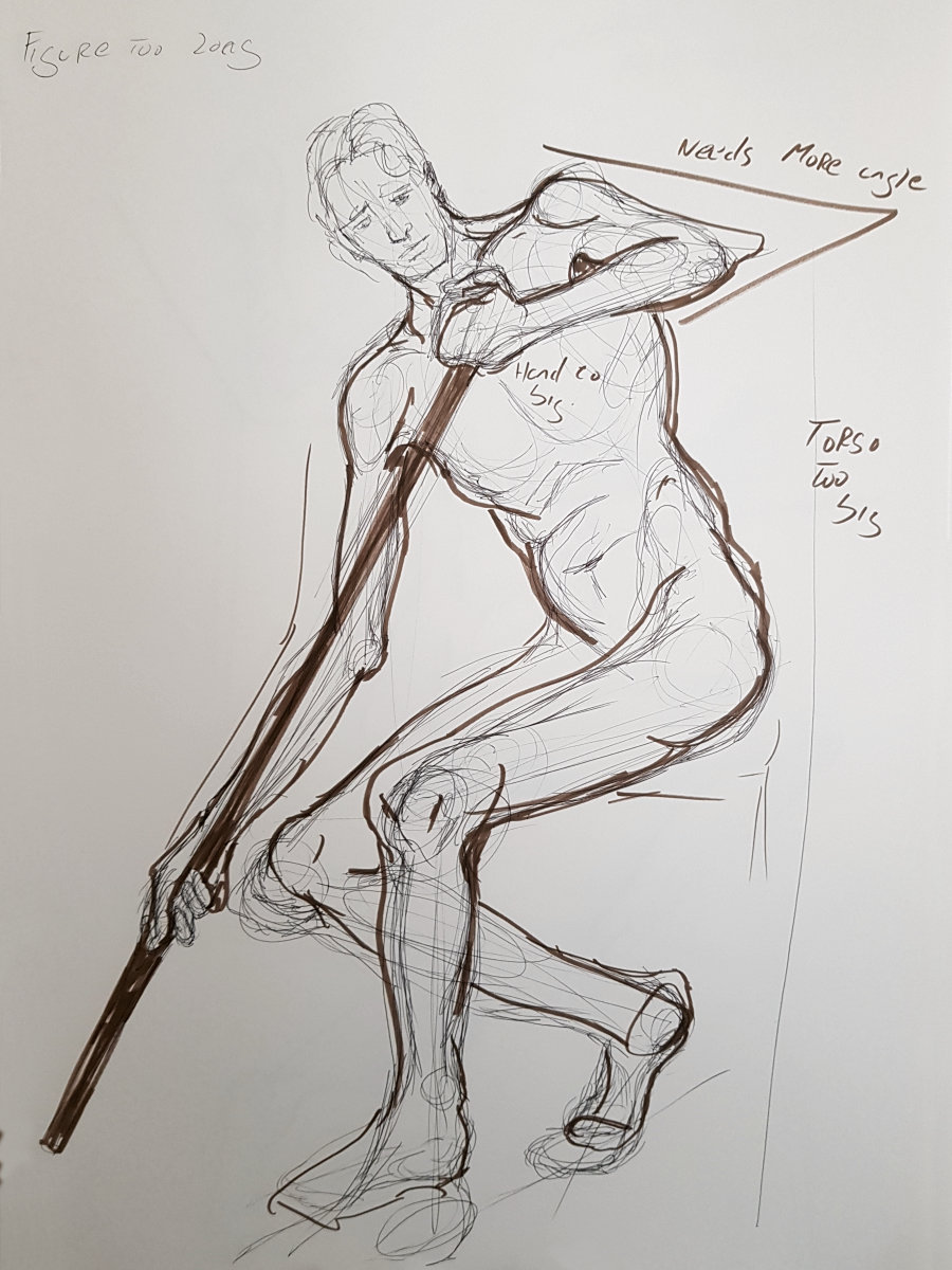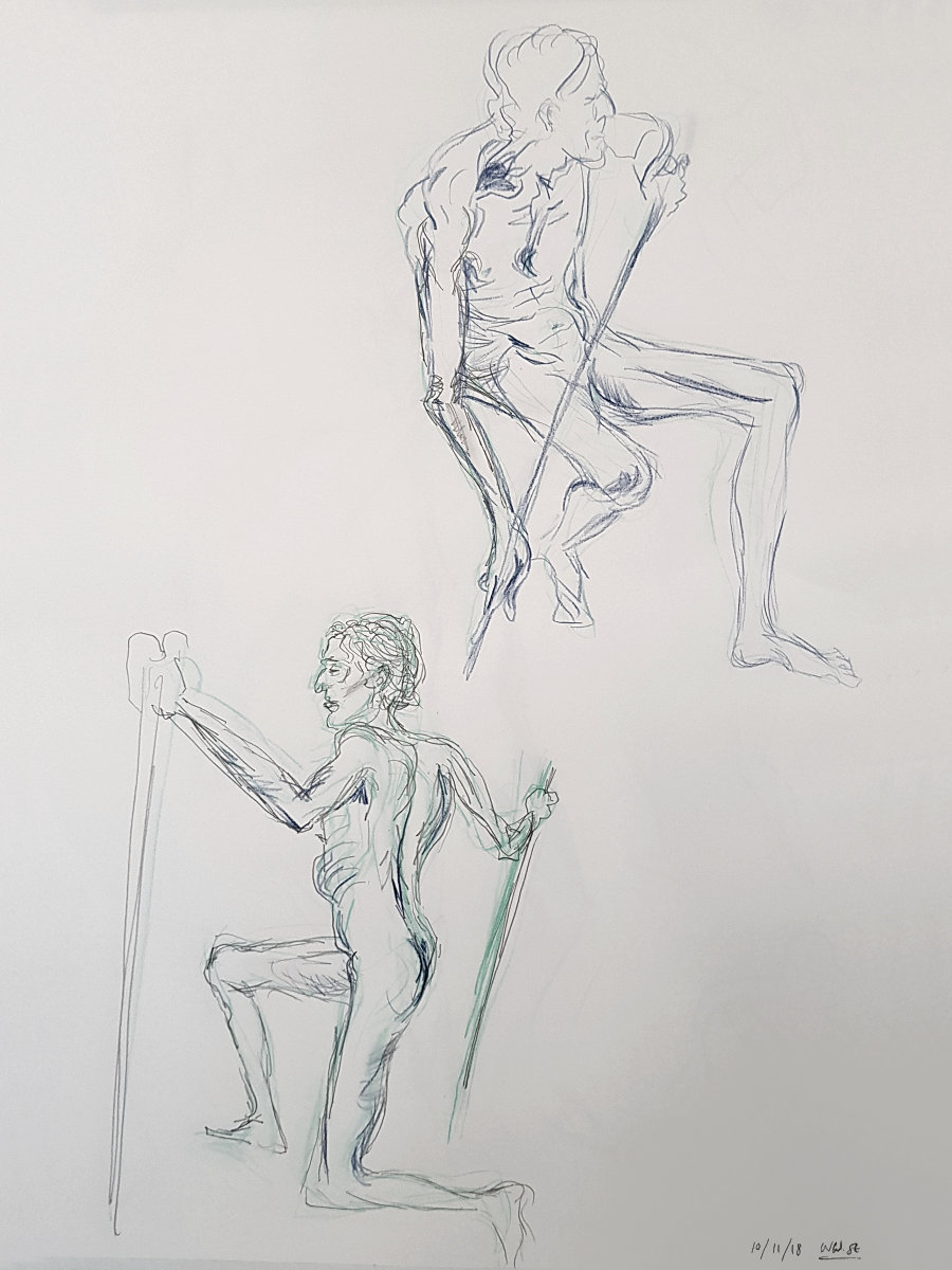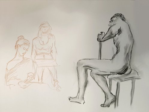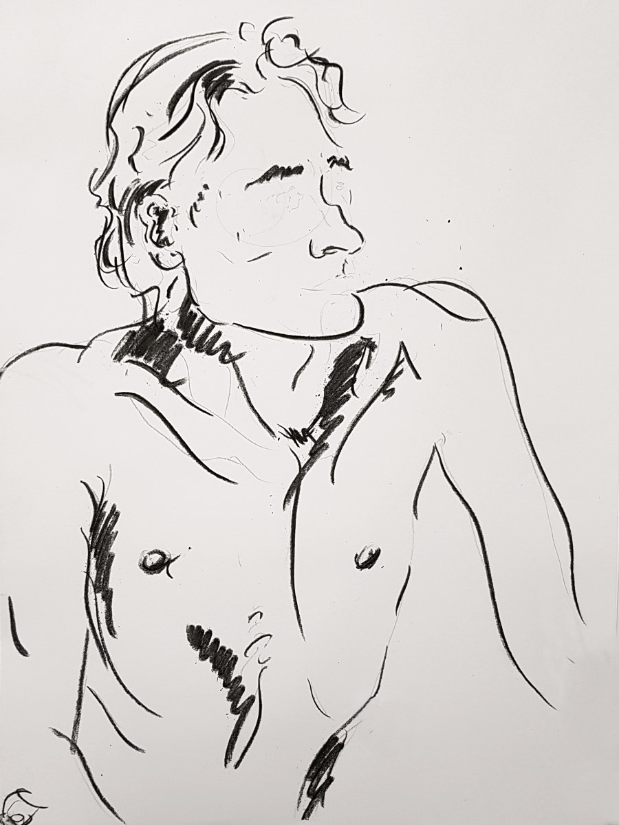 With the group meeting on Saturdays and the first pose due to commence at 9:30am, this is my earliest weekend modelling start. A first hour of quick poses gets my blood circulating, however: four of 5-minutes, then 4, 3, 2, 1-minute and two of 15-minutes. I had my back to a wall, which makes life easier as it denies any temptation to contort into a posture that’s interesting when scrutinised from 360° in the round.