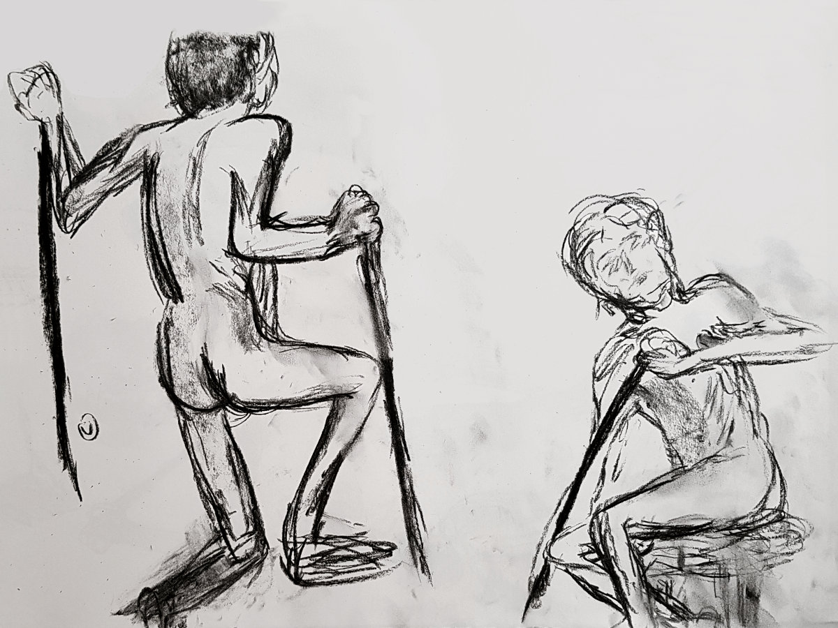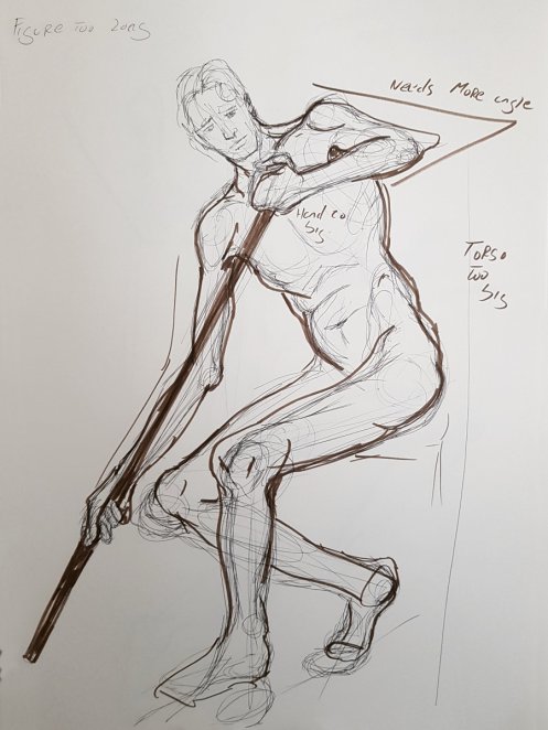 Opening poses were 10-minutes, 2, 2, 2, 5, 5, 15 and 18-minutes. Aiming to create a favourable first impression, I made the schoolboy error of putting too many bends and stretches in the first pose. It’s not as if I needed to show off but sometimes, when the last garment falls to the floor, the body takes its own decisions. Thereafter the priority was management of potentially fibrillating leg muscles up to the break.