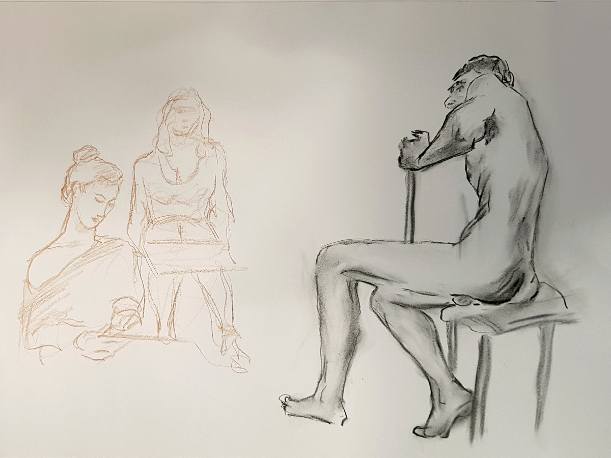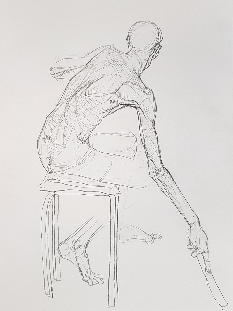 As in March we started with 10-minute poses – three to begin with, first kneeling then two standing. After this, to complete the first half, group organiser Jon suggested I sit on a chair for 20 minutes. I duly got comfy then added in a few angles.