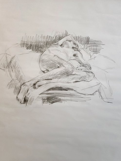 When Jon announced an hour-long reclining pose after the break, one artist asked if I could be in the foetal position rather than stretched out. As I had just a yoga mat and a sheet for the wooden floor, I thought it best to lay on my clothes for extra padding.