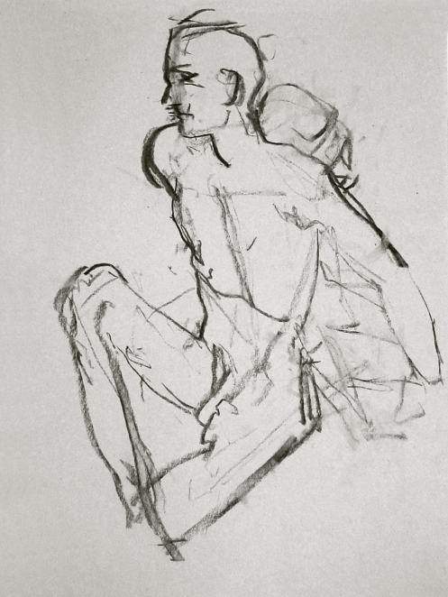Two poses occupied the second half: 30-minutes sitting on the floor, and 25-minutes seated upon a high stool. These enabled us to over-run the session by 5-10 minutes as compensation for our late start. Honour was satisfied; I hope the artists were too. Certainly Stephen was more relaxed than when I found him. He’d reached a point of confronting the real possibility of having to model himself. I felt guilty for bringing him to that precipice – but, who knows, maybe one day he’ll want to take the plunge.