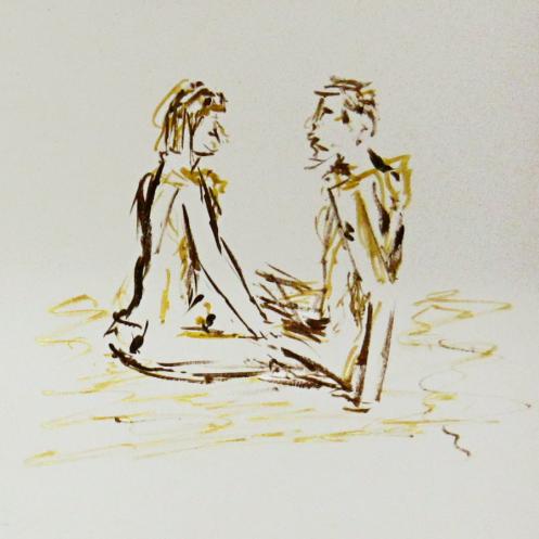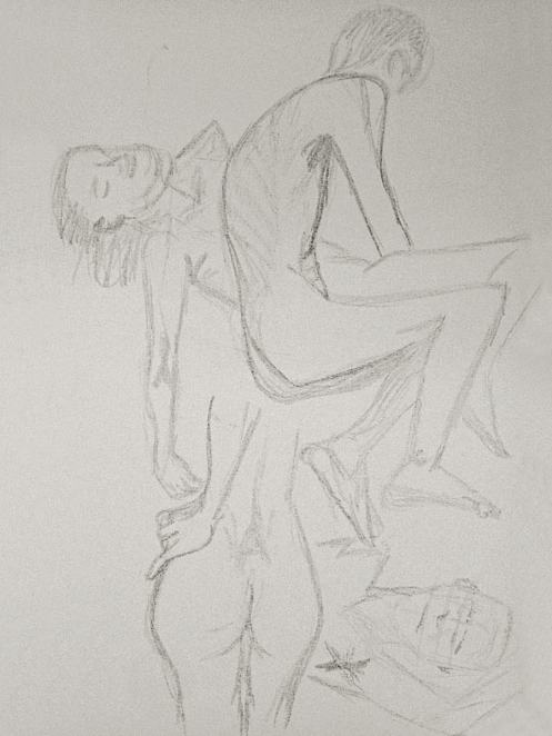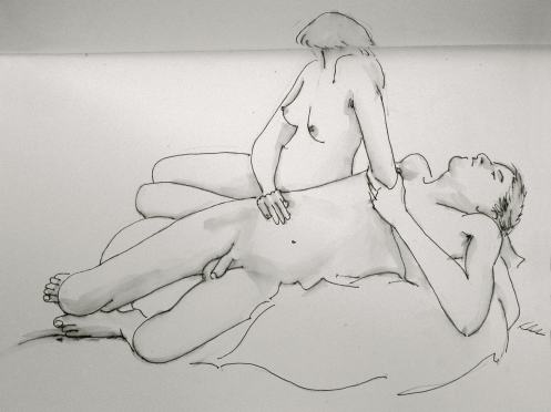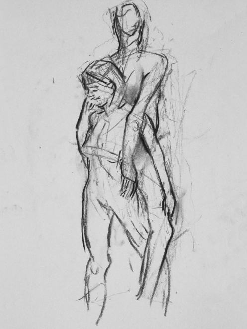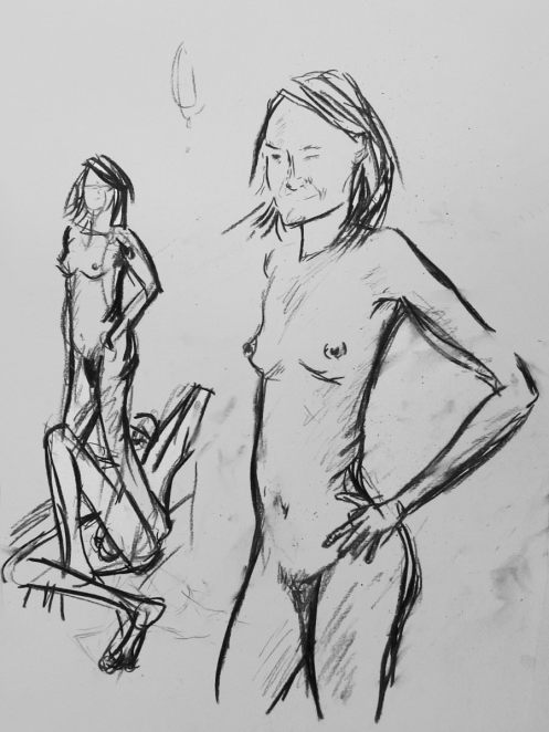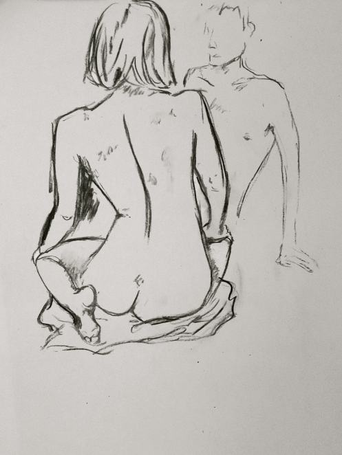 Esther and I were modelling together again last week for the Telegraph Hill Festival. In 2016 we’d attended as part of a Spirited Bodies collaboration, but this time it was just the two of us posing in a Telegraph Hill life drawing group taster session. We were welcomed by our friend Frances, who runs the group, and were soon joined by a dozen artists; a healthy mix of old friends and first-timers. We started: 5-minutes both standing; 5 sitting back-to-back, 10 with Esther standing, 10 standing back-to-back.