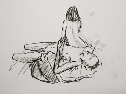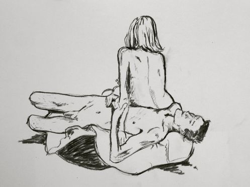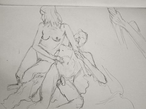 Our final pose idea had been entirely spontaneous. Only once underway did it occur to us that we might appear a tad too erotic for some tastes. Hopefully not. Indeed, if the resulting artworks are any indication then those present were especially inspired. After dressing and packing away, we joined our friend and group organiser, Tatiana, plus a few artists in the bar for drinks and chips. Camberwell Life Drawing remains a great place to model, to draw and to socialise – it’s always a pleasure to return.