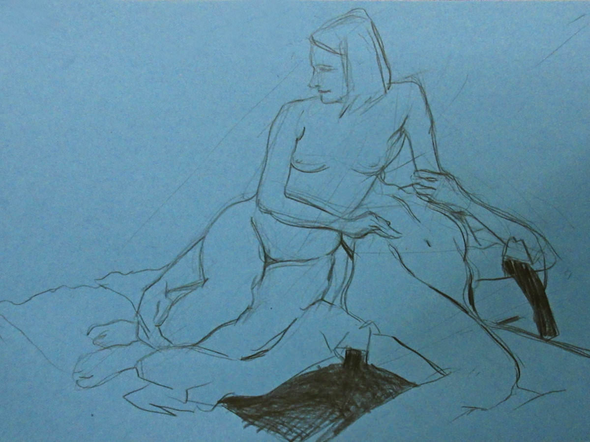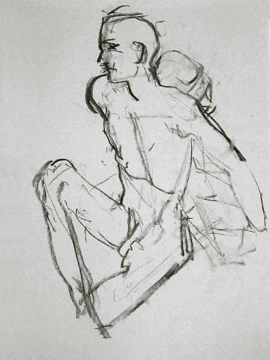Without further ado, I stripped off and plunged myself into the round of 22 artists – the most I’ve ever seen there – for an opening 5-minute pose. I still hadn’t got my breath back, and felt physically out of sorts, but the show must go on: 4-minutes, 3, 2, 1, 15 and 20-minutes up to a break. It was a relief to get through that first half intact. At the interval I robed and recomposed myself. I’d been shivery, had a touch of cramp and an unsettled stomach, but the postures held firm.