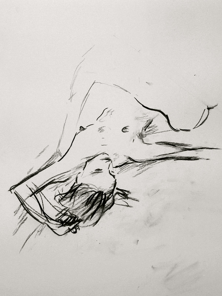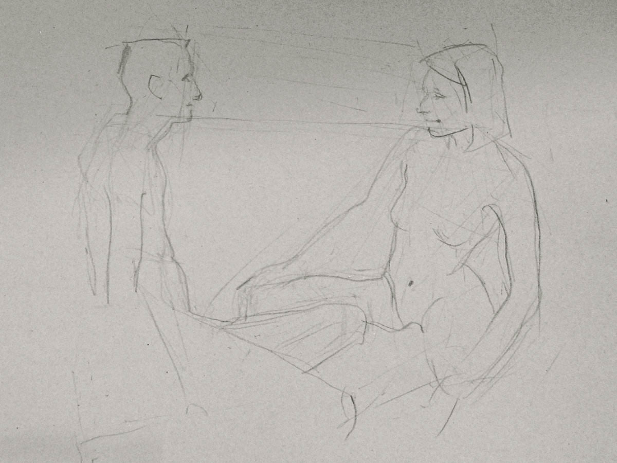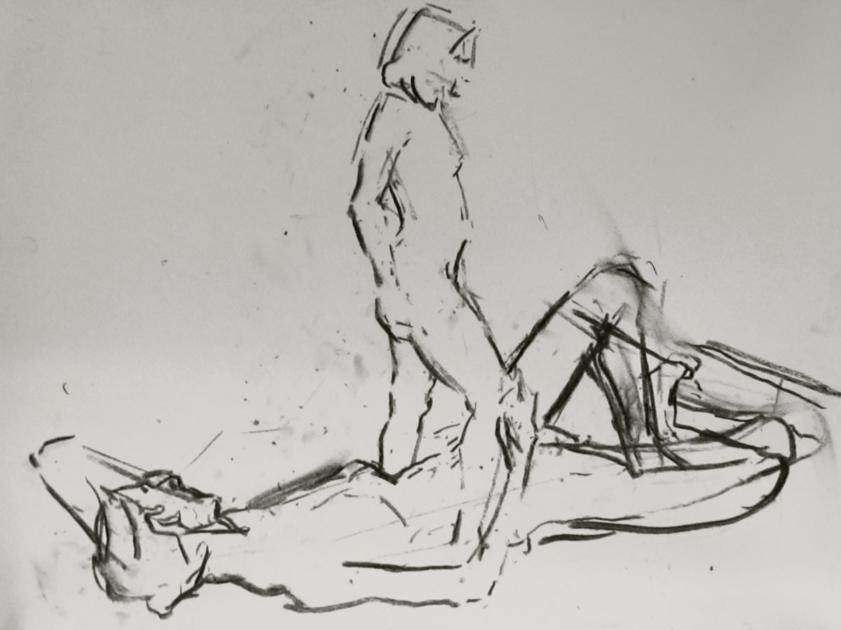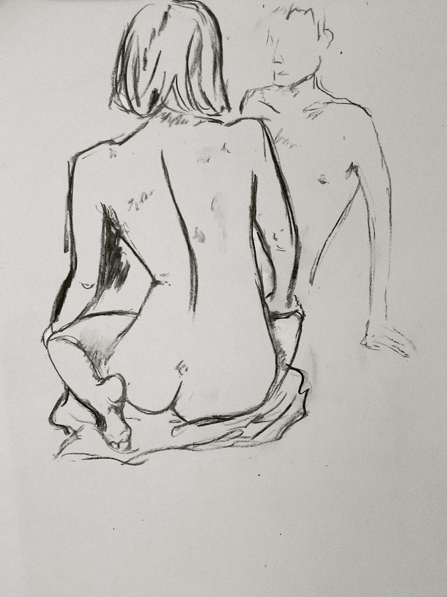 Esther and I were modelling together again last week for the Telegraph Hill Festival. In 2016 we’d attended as part of a Spirited Bodies collaboration, but this time it was just the two of us posing in a Telegraph Hill life drawing group taster session. We were welcomed by our friend Frances, who runs the group, and were soon joined by a dozen artists; a healthy mix of old friends and first-timers. We started: 5-minutes both standing; 5 sitting back-to-back, 10 with Esther standing, 10 standing back-to-back.